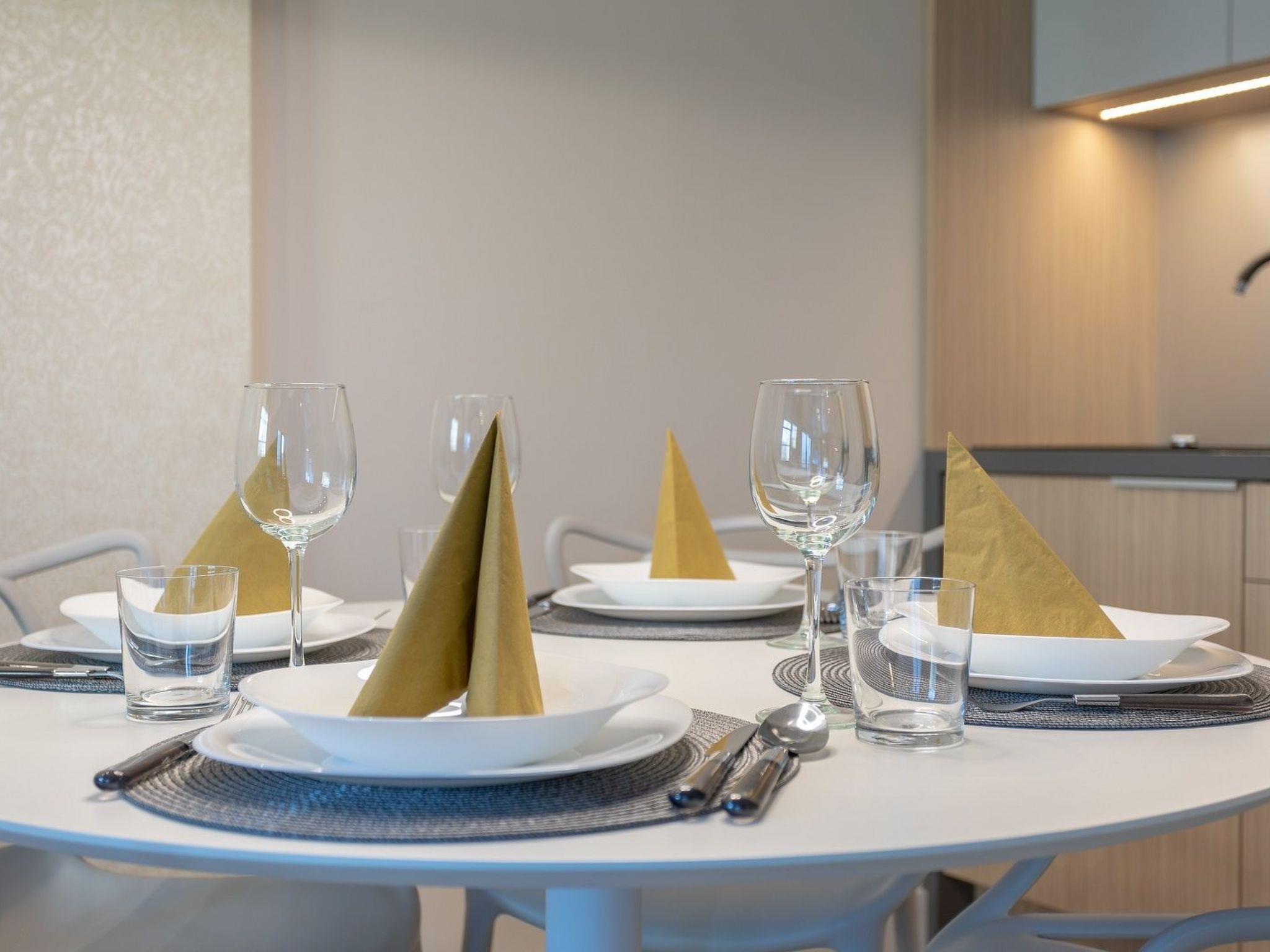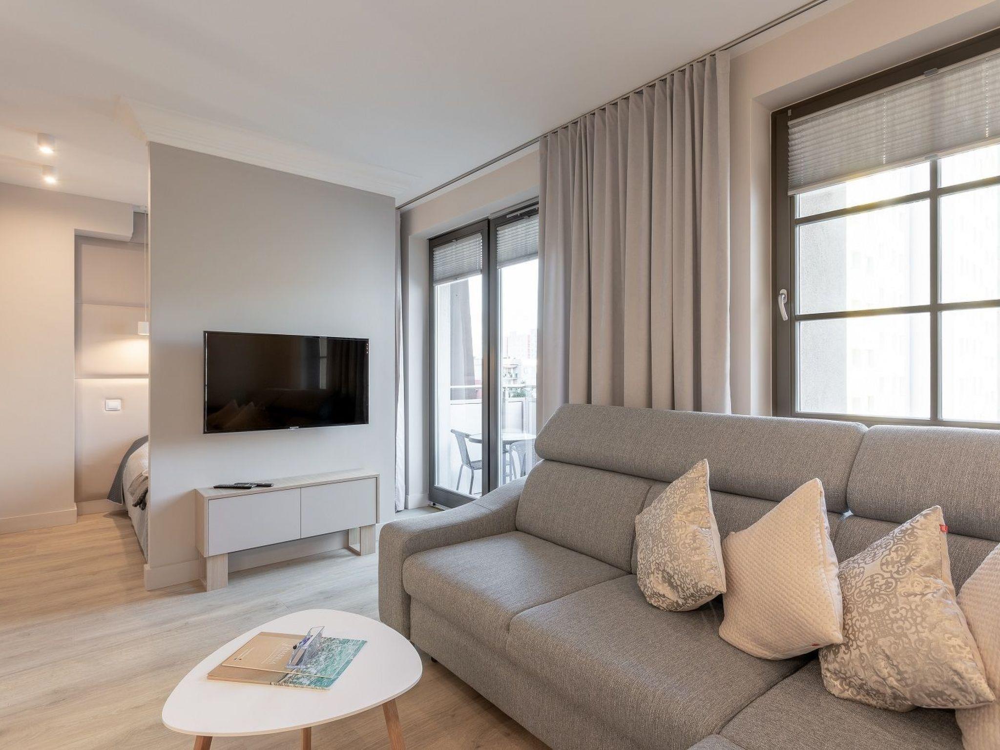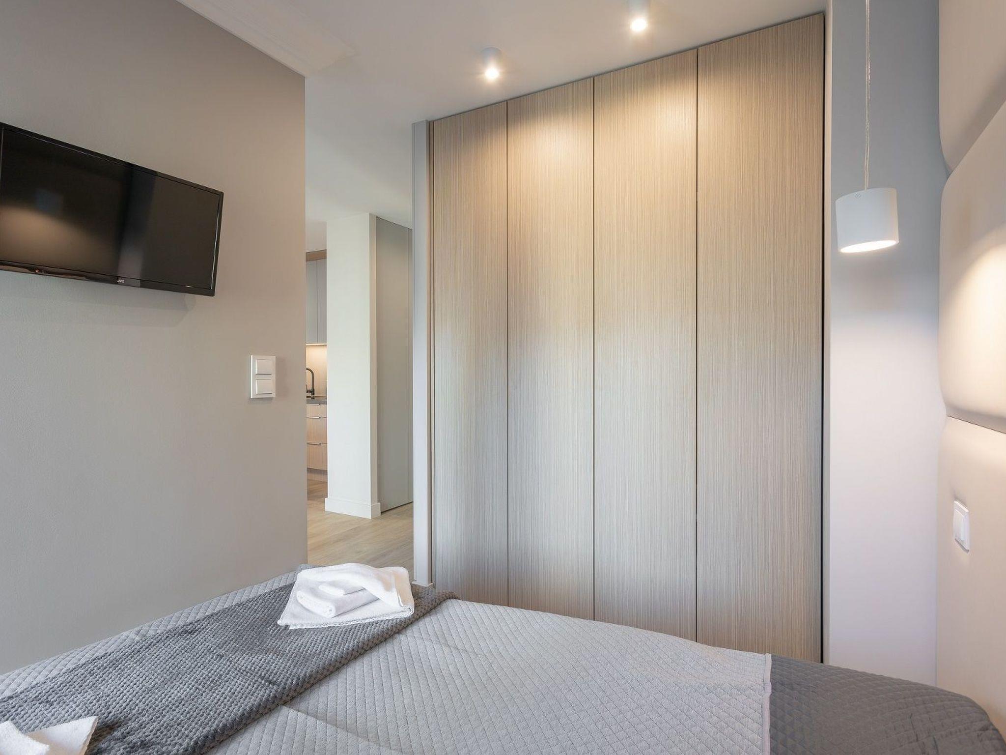 It is a studio flat with a well-equipped kitchenette and a modern bathroom with a total area of 35 m2 and a balcony. The style of the flat stands for minimalism and simplicity in an extremely luxurious version: a bright, monochromatic interior dominated by the colours white, beige, grey and gold, interspersed with a delicate wood tone, where only the necessary equipment is present, stands for elegance and class. In addition, original and modern furniture shapes refer to the glamour style, but without any exaggeration. It is an ideal place for people who appreciate elegance in an interior where they want to relax perfectly and return there.