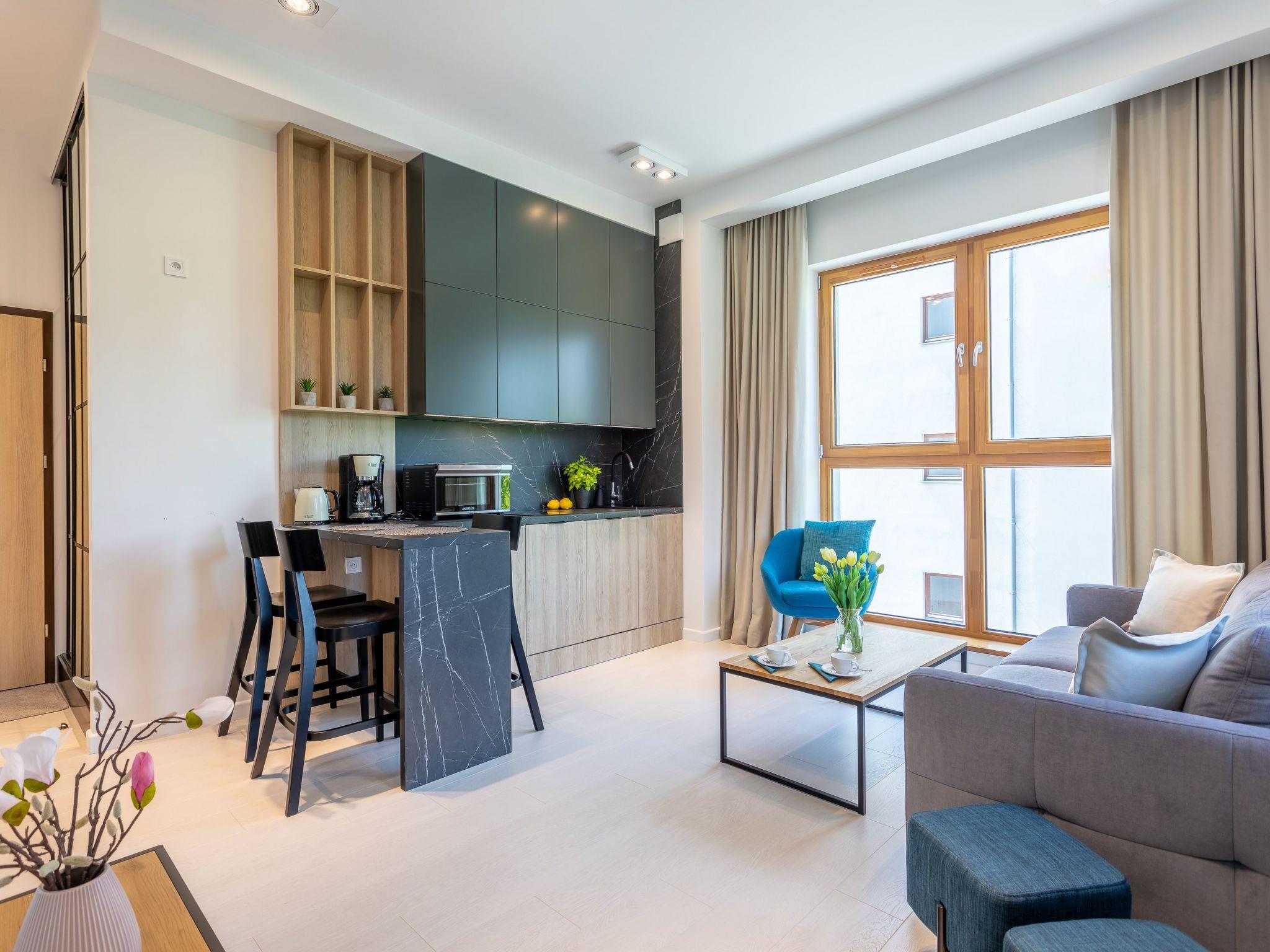 The interior is very originally designed, white, turquoise and black are dominated by light wood with visible grains and knots, which undoubtedly makes the space more atmospheric and cosy. Large glazing gives the room a very luxurious, modern character and lets in plenty of natural light. The flat is finished to a high standard and is a mosaic of different furniture, details and textures - it combines different styles that complement each other and allow you to create an eclectic space full of interesting and original combinations that you will surely remember for a long time and encourage you to return quickly.