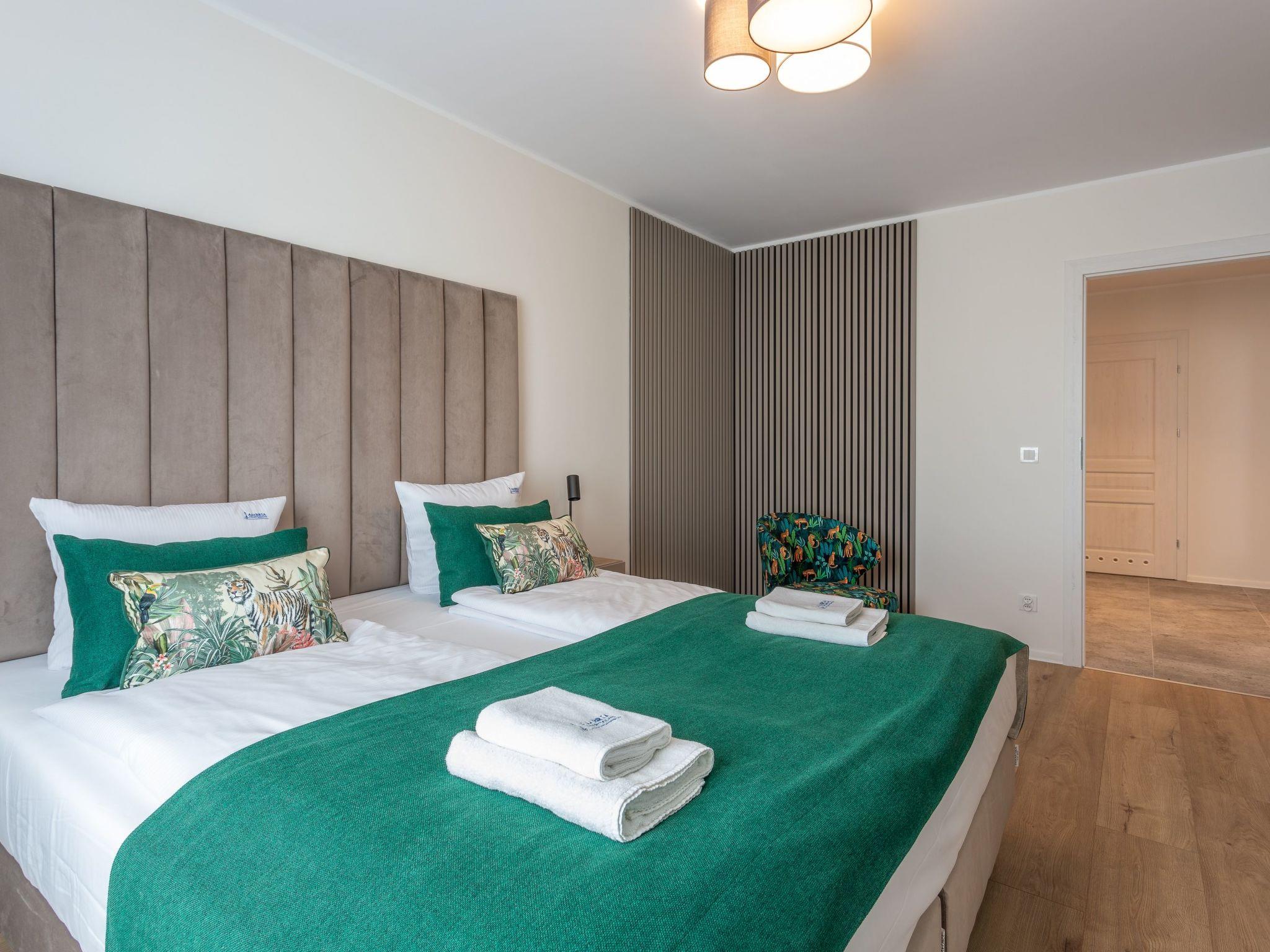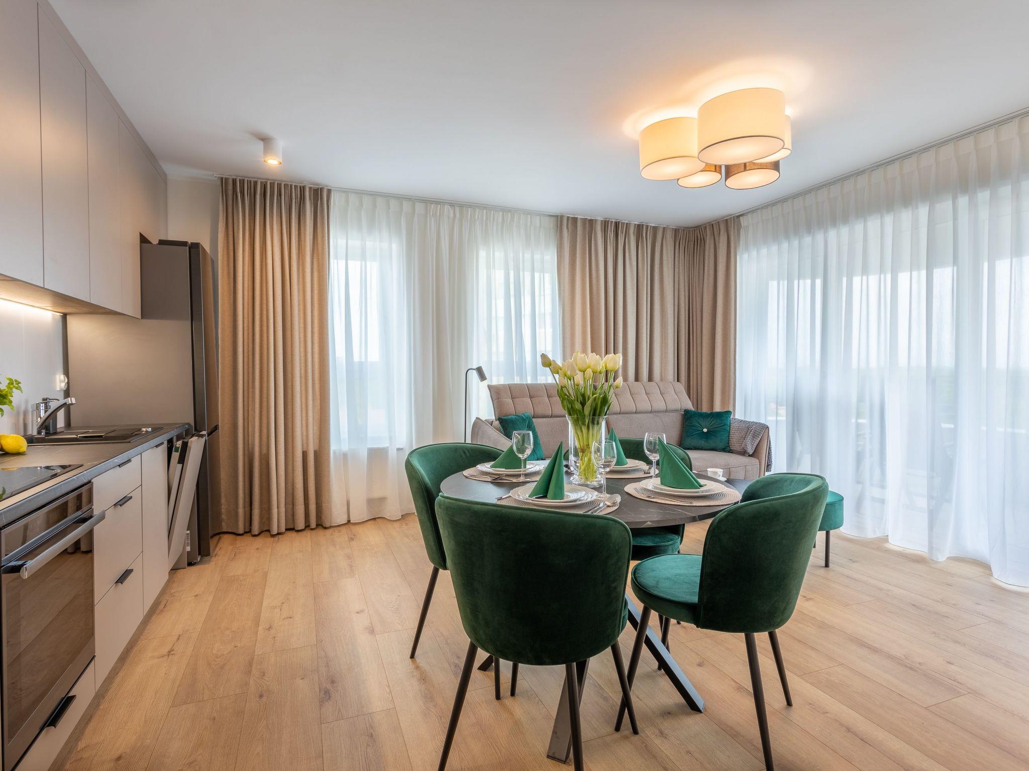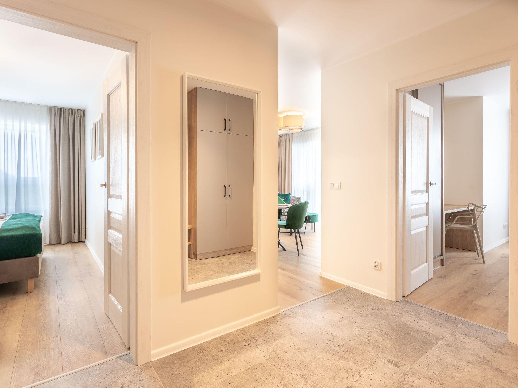 Flat "Sun Towers B107" in Swinoujscie is an elegant flat in a building built in 2022 with two bedrooms, living room with well-equipped kitchenette, dining area and modern bathroom with a total area of 60 m2, as well as a very large balcony, which is a perfect extension of the usable area. Very comfortable double beds in the bedrooms ensure a peaceful night's sleep. A unique interior whose insulated space is filled with earthy colours and creates an extremely cosy character and atmosphere of a mysterious and wild island. It is important to be able to come back after a day of sea activities and relax in a comfortable and high-quality interior. Guests also have access to a parking space in the underground car park - at an extra charge - which significantly increases the comfort of travelling and is particularly desired by families on holiday with children.