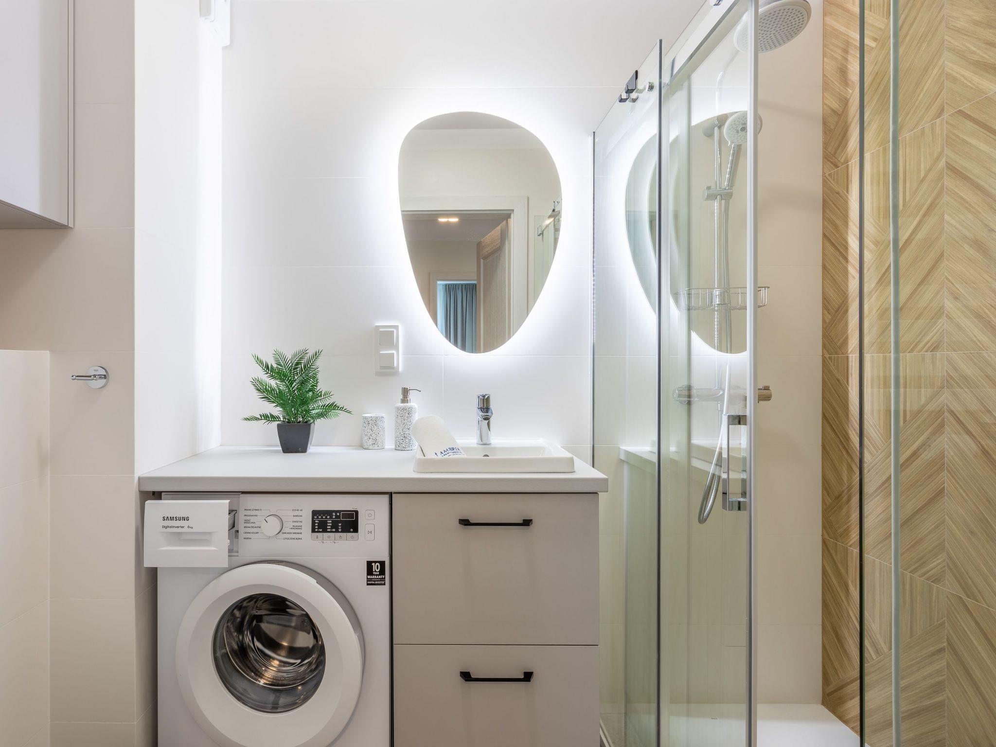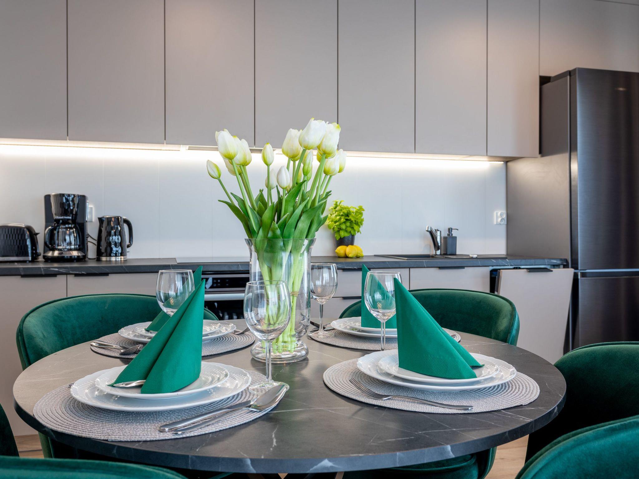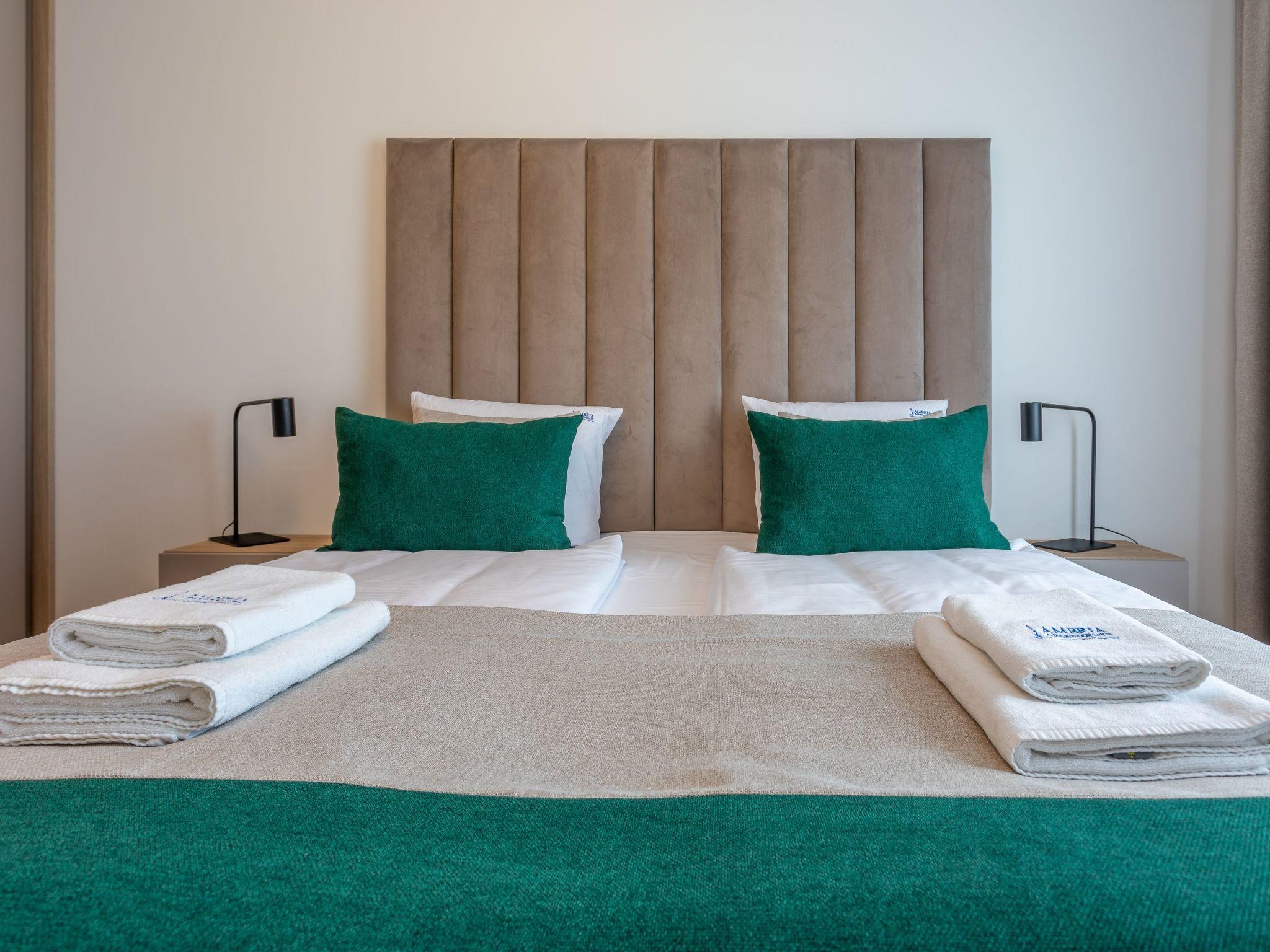 Flat "Sun Towers B107" in Swinoujscie is an elegant flat in a building built in 2022 with two bedrooms, living room with well-equipped kitchenette, dining area and modern bathroom with a total area of 60 m2, as well as a very large balcony, which is a perfect extension of the usable area. Very comfortable double beds in the bedrooms ensure a peaceful night's sleep. A unique interior whose insulated space is filled with earthy colours and creates an extremely cosy character and atmosphere of a mysterious and wild island. It is important to be able to come back after a day of sea activities and relax in a comfortable and high-quality interior. Guests also have access to a parking space in the underground car park - at an extra charge - which significantly increases the comfort of travelling and is particularly desired by families on holiday with children.