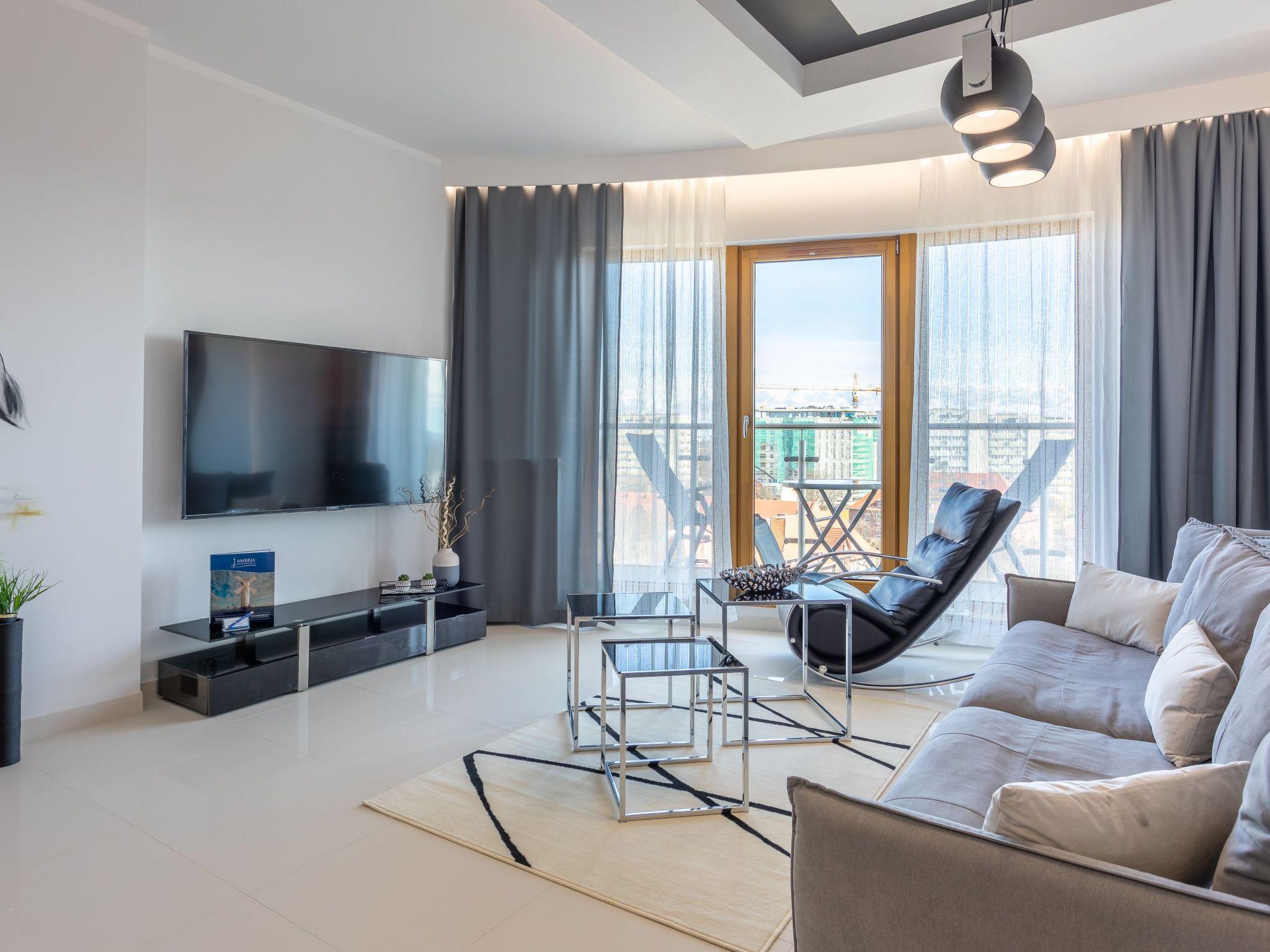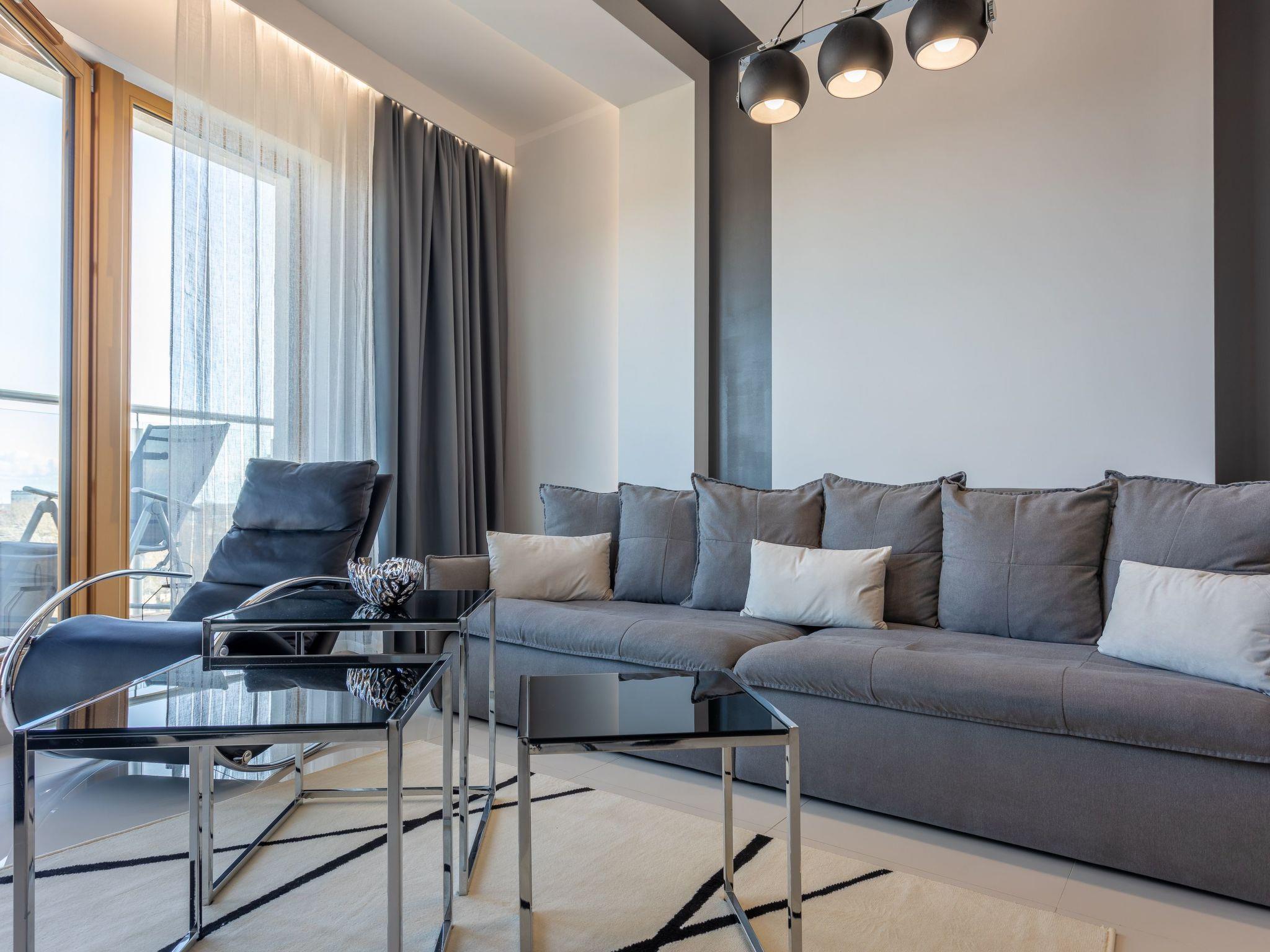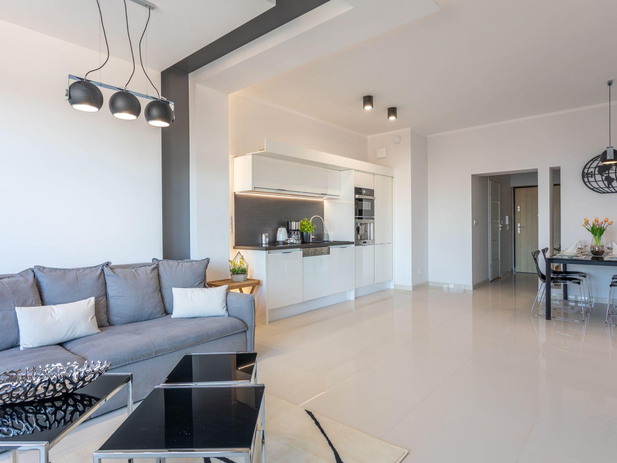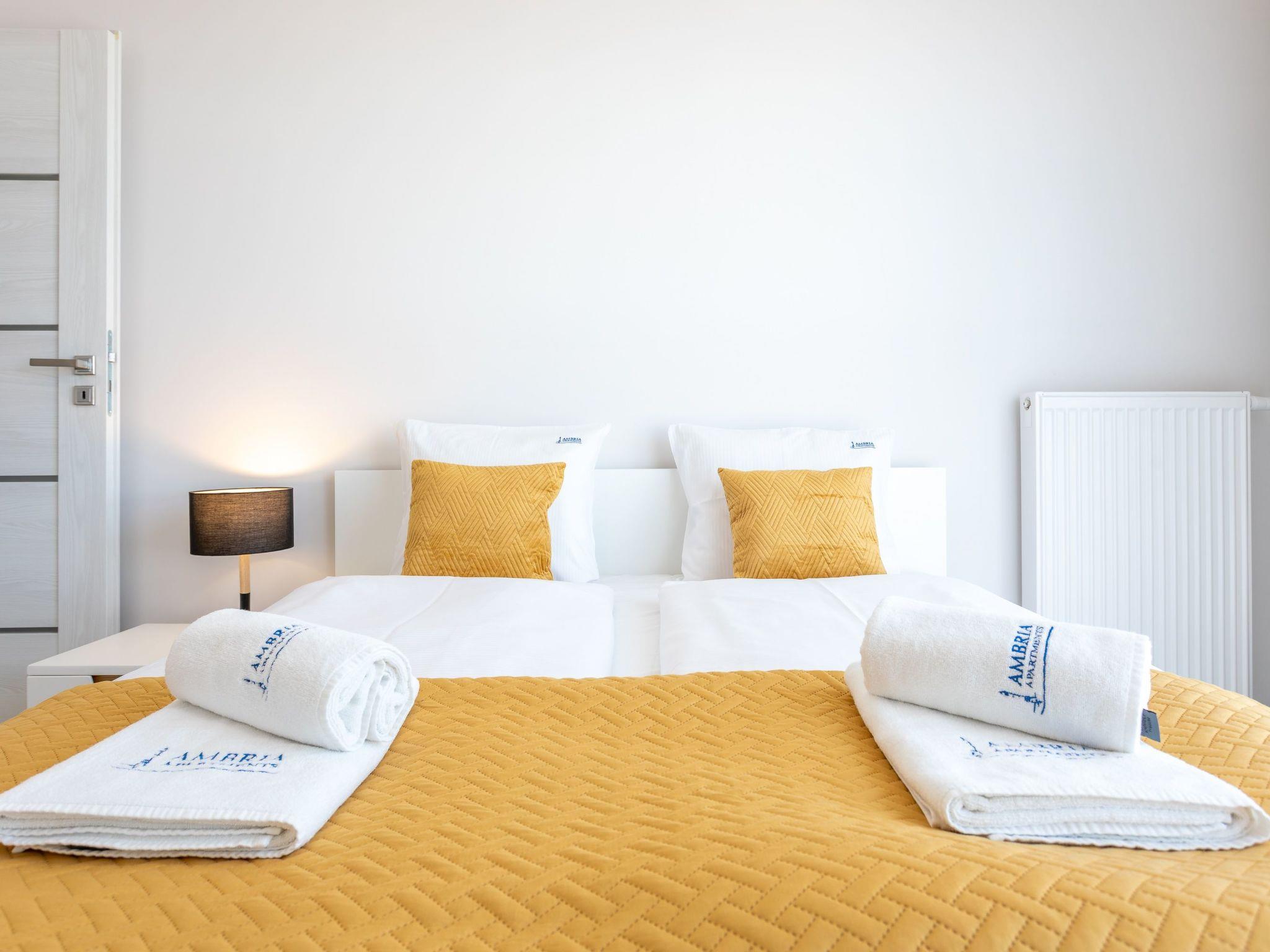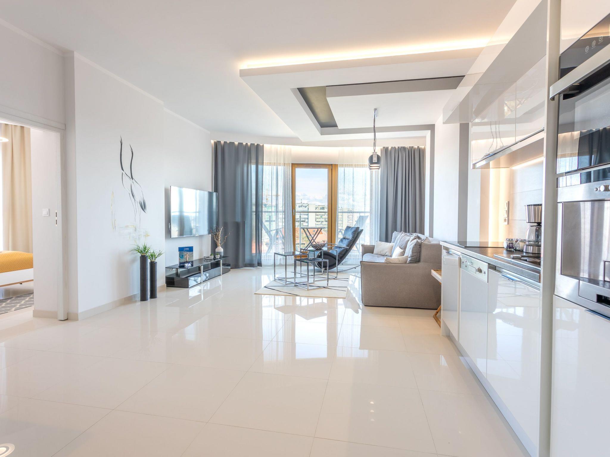 It is a very spacious and luxurious flat on the seventh floor with two large bedrooms, a dressing room, a living room with a well-equipped kitchenette and a bathroom. Its total area is 70 m2. The usable area is extended by the balcony, where you can spend pleasant moments with a cup of freshly brewed coffee or a glass of your favourite wine and enjoy the beautiful panorama of Swinoujscie. Guests also have at their disposal - for a fee - a parking space in the neighbouring building, which significantly increases the comfort of travel and may be especially desirable for families with children. The flat is furnished in a minimalist style with expressive glamour motifs: The eye is dominated by muted colours, grey, beige and white with a balanced yellow accent like a ray of sunshine, as well as beautiful wooden details, subtly smuggled into modernity furniture or accessories that warm up the interior and delight with their texture and unconventional look. In addition, high-gloss lacquered furniture not only lends elegance and a certain lightness to the individual elements of the interior, but also brings an informal style to the room and perfectly complements the arrangement. As a result, this extremely spacious flat radiates calm and promises cosiness and relaxation. Here, attention is paid not only to the aesthetic value of the room, but also to the individual needs of the guests, with functional furniture such as a spacious sofa, large and comfortable beds and a dressing table.