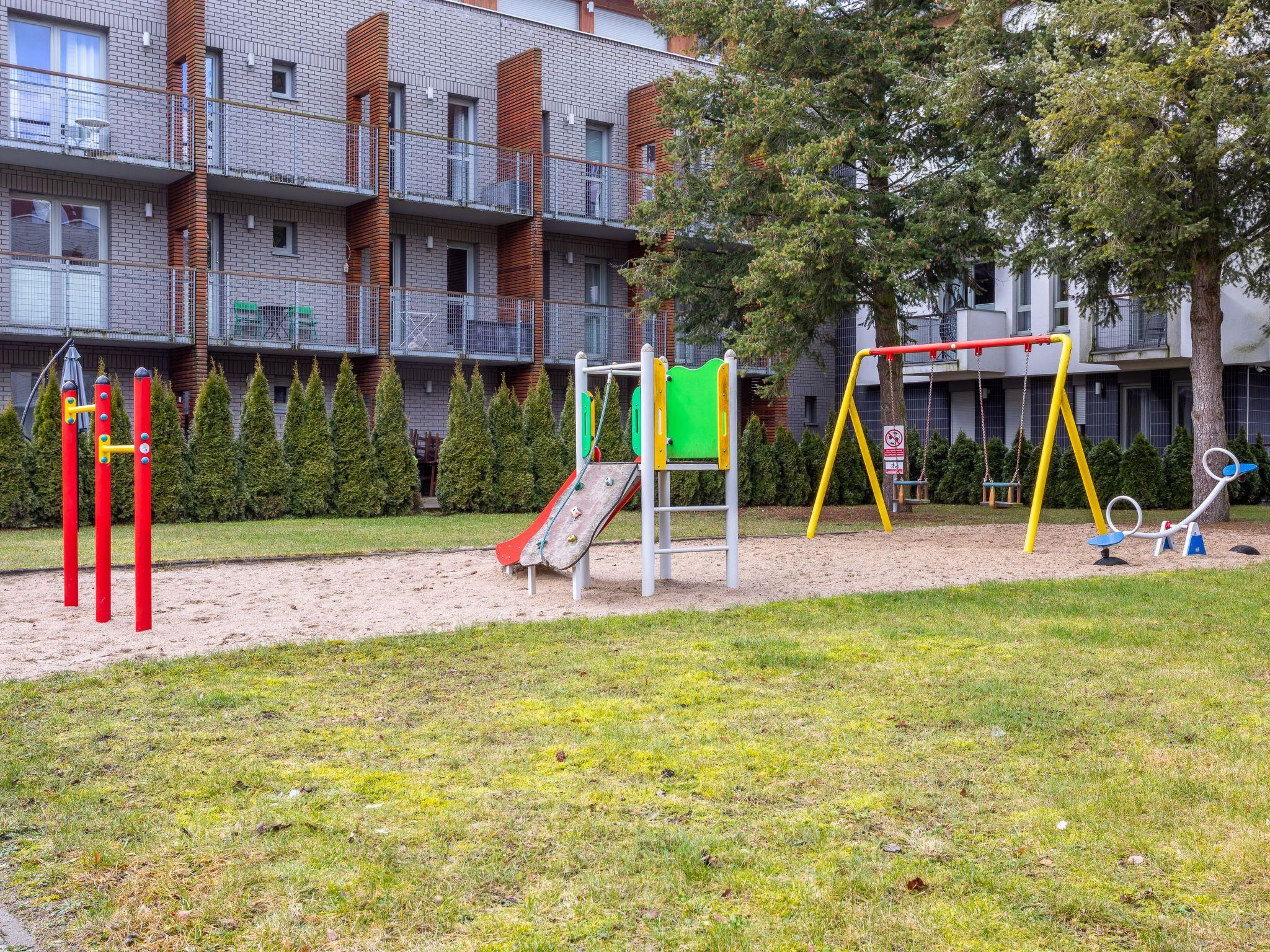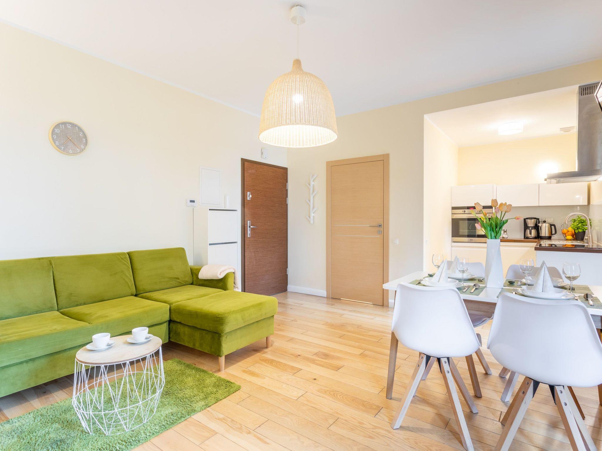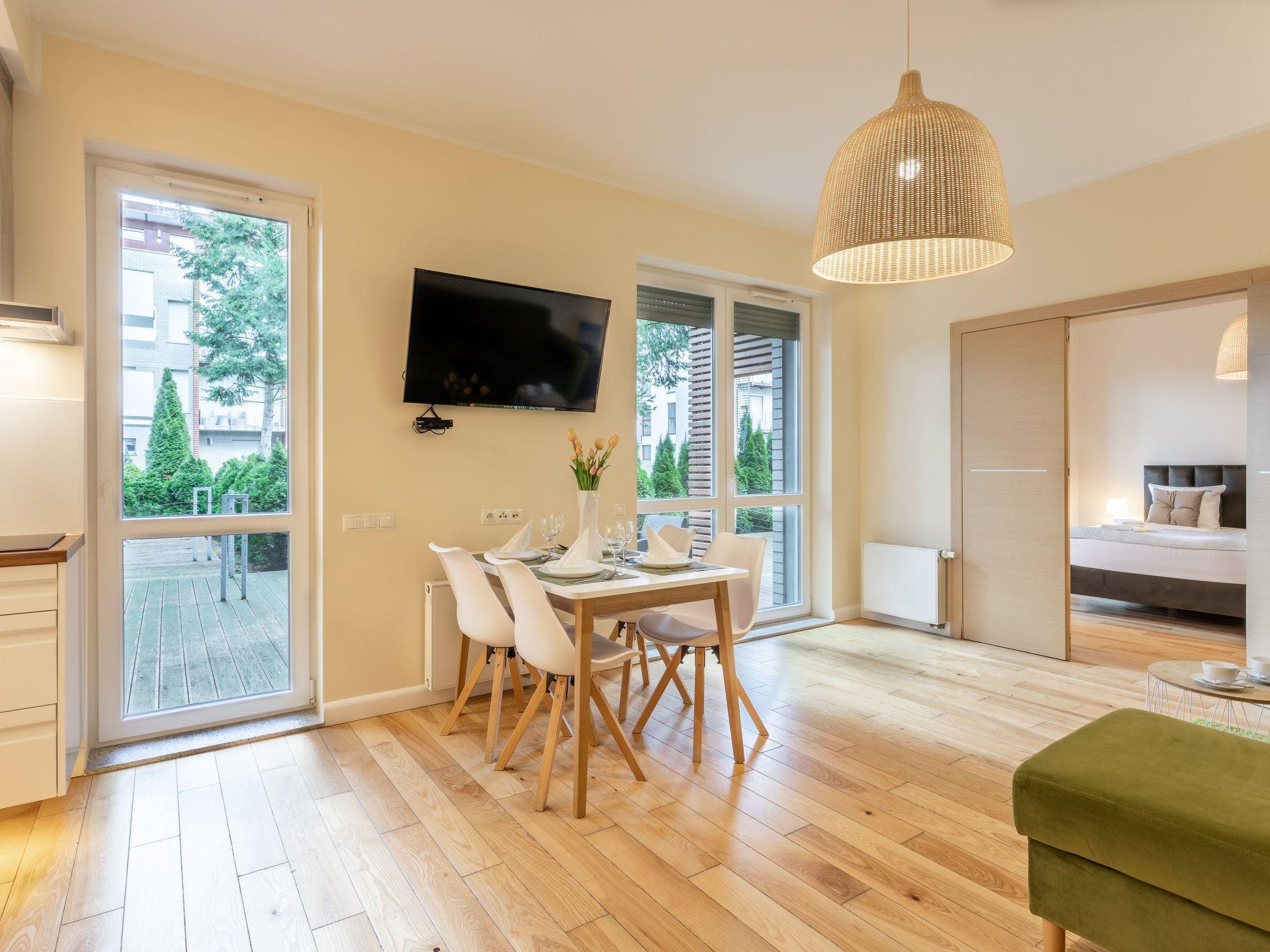It is a very spacious and fully equipped flat with one bedroom, living room with kitchenette and bathroom with total area of 41 m2. A very large terrace with a seating set significantly increases the space. It is the perfect place to feast with your loved ones and spend long summer evenings in comfort and privacy. The flat is decorated in light colours, dominated by white, beige and green - evoking associations with the beach, sun and the forest. The interior is functional and well organised, making it an ideal place to rest, relax and rejuvenate after the challenges of everyday life.