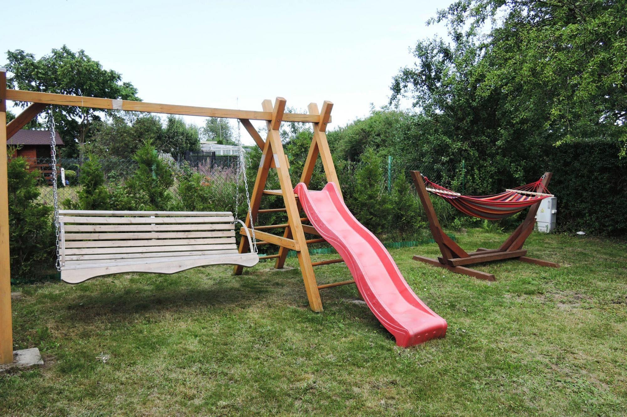 Første etasje: (Kjøkken(vannkoker, vannkran med kokende vann, brødrister, komfyr(komfyr med 2 kokeplater, elektrisk), kaffetrakter, espressomaskin, kjøleskap med fryser), Stue/soverom(dobbel sovesofa, TV(kabel, satellitt, Tyske TV-kanaler), spisebord), soveværelse(2x enkeltseng), bad(dusj, håndvask, toalett)) grill, terrasse(overdekket), hage(privat, inngjerdet), hagemøbler, parkering, sklie, hengekøye