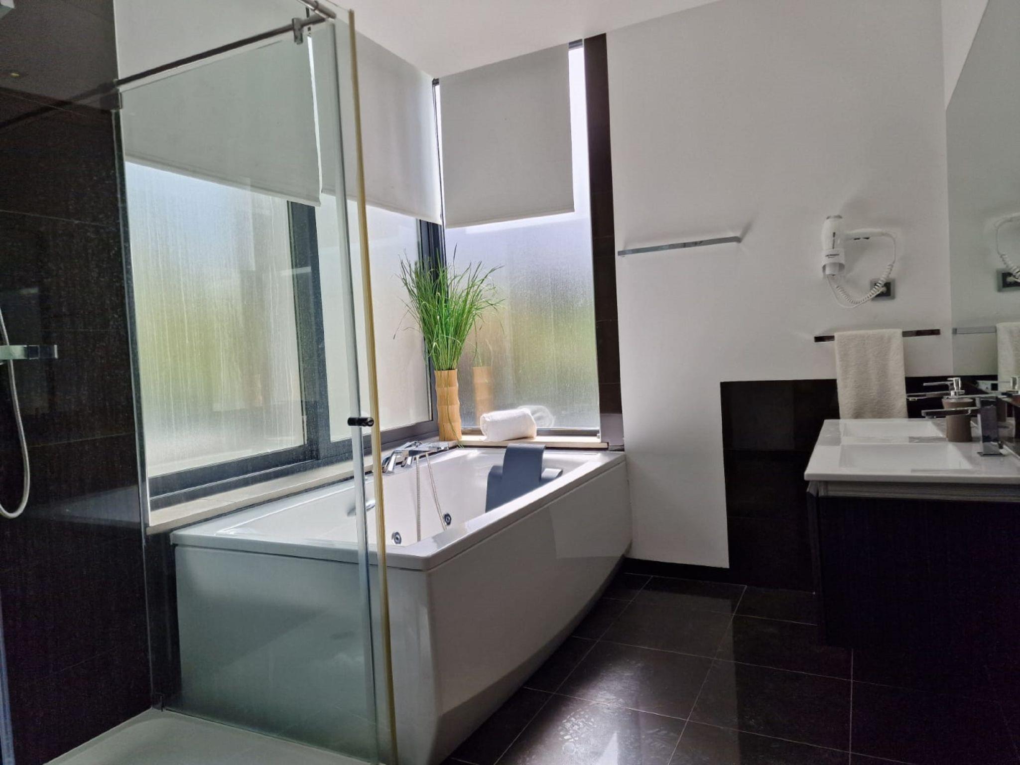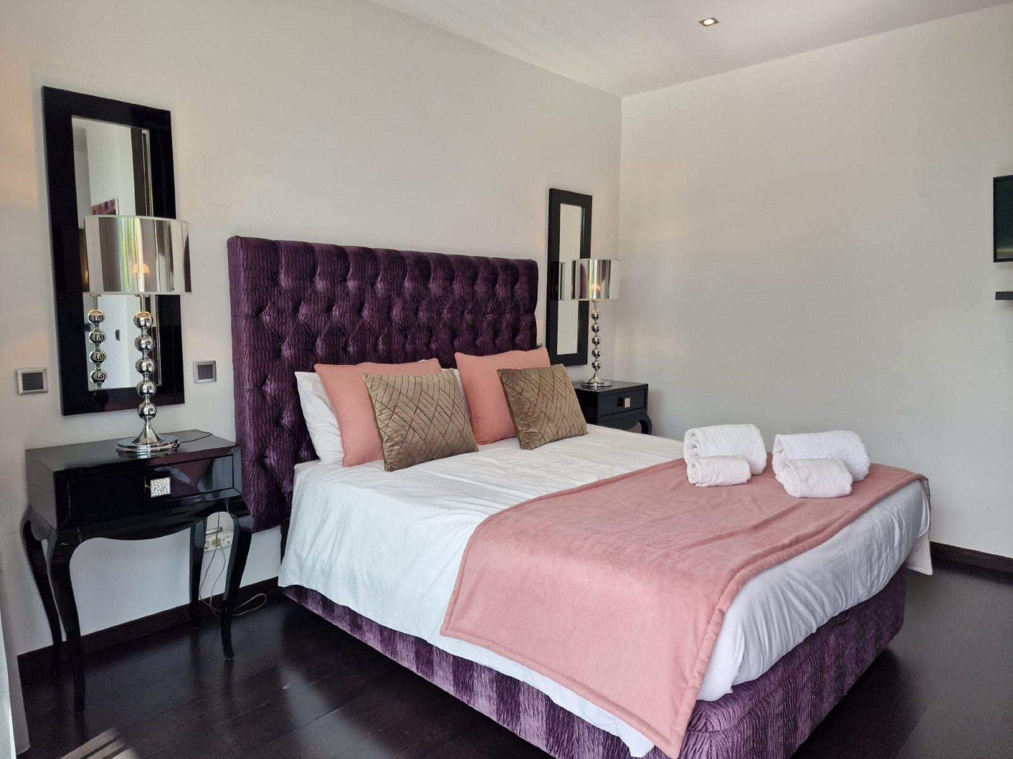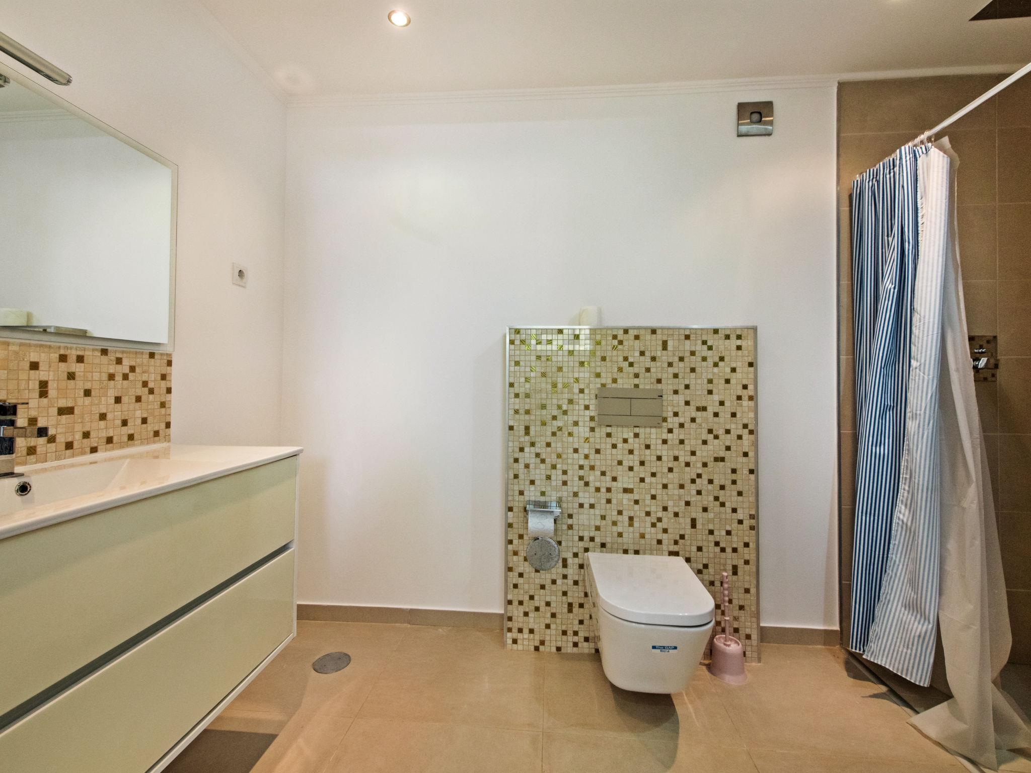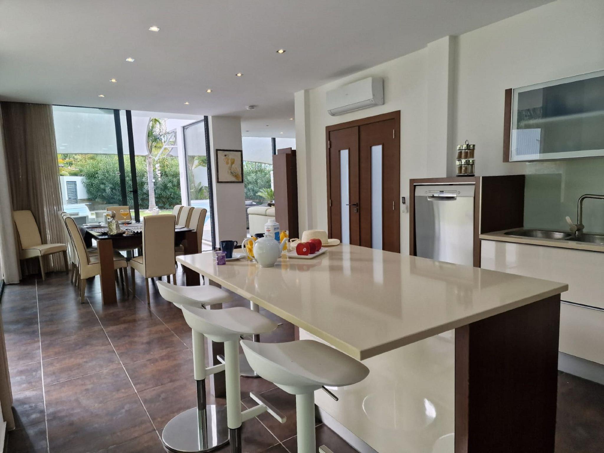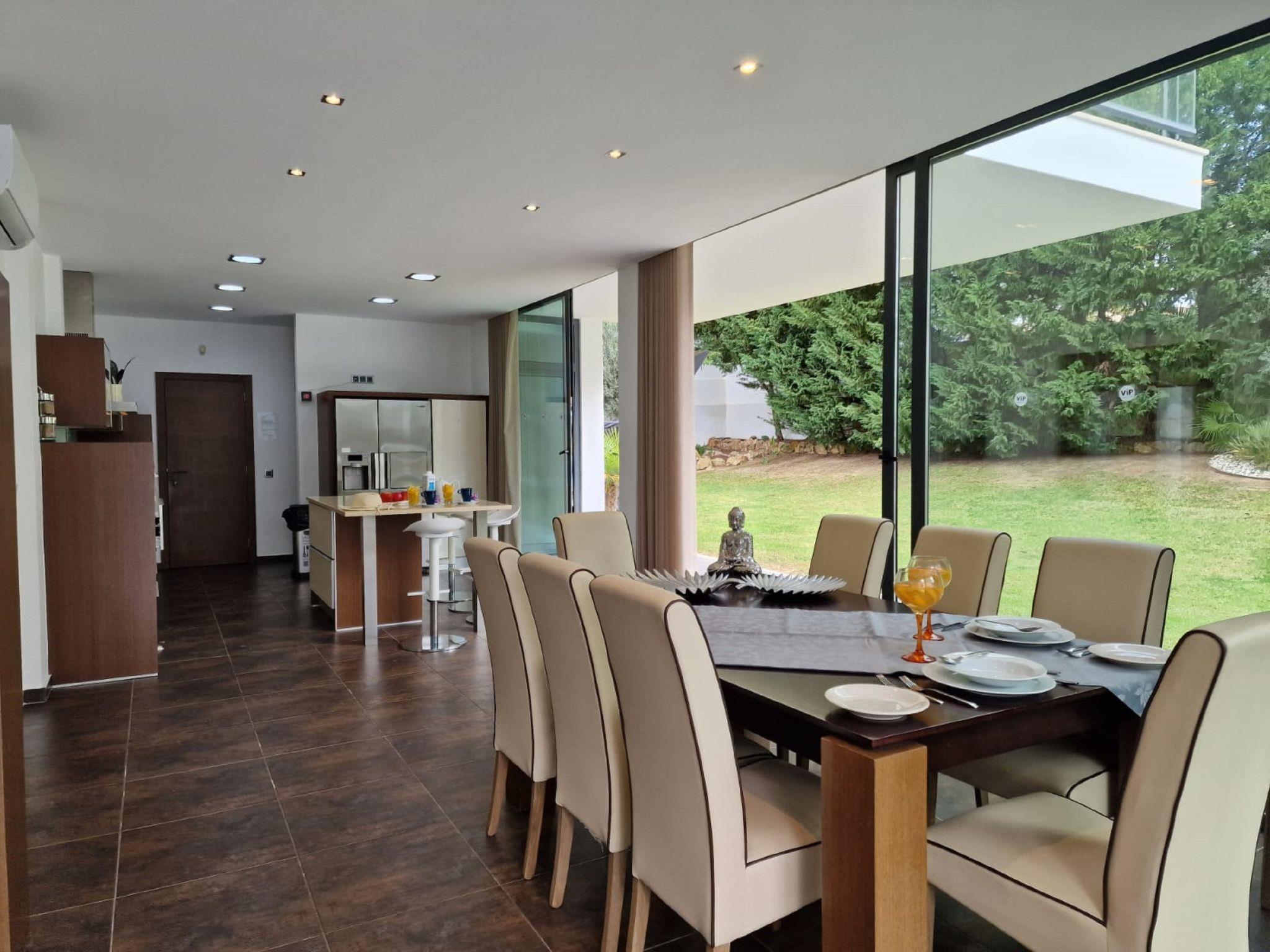 "Nobre - VIP Properties", 5-room villa 408 m2. Very comfortable and cosy furnishings: living/dining room with cable TV, international TV channels, flat screen, air conditioning and forced-air heating. Exit to the terrace, to the swimming pool. 1 room with 1 french bed (160 cm, length 200 cm), bath/WC, double hand-basin, air conditioning and forced-air heating. Exit to the terrace. Open kitchen (oven, dishwasher, 4 ceramic glass hob hotplates, toaster, kettle, microwave, freezer, electric coffee machine, cooking island). Exit to the terrace, to the swimming pool. Shower/WC, sep. WC. Upper floor: 1 room with 1 french bed (160 cm, length 200 cm), bath/WC, double hand-basin, air conditioning and forced-air heating. Exit to the terrace. 1 room with 1 french bed (160 cm, length 200 cm), bath/WC, double hand-basin, air conditioning and forced-air heating. 1 room with 1 french bed (160 cm, length 200 cm), bath/shower/WC, air conditioning and forced-air heating. Exit to the terrace. Terrace furniture, barbecue, deck chairs (8). View of the resort. Facilities: washing machine, dryer, iron, children's high chair, baby cot for up to 2 year olds (extra), hair dryer. Internet (WiFi, free). Parking at the house. Suitable for families. 15231/AL
