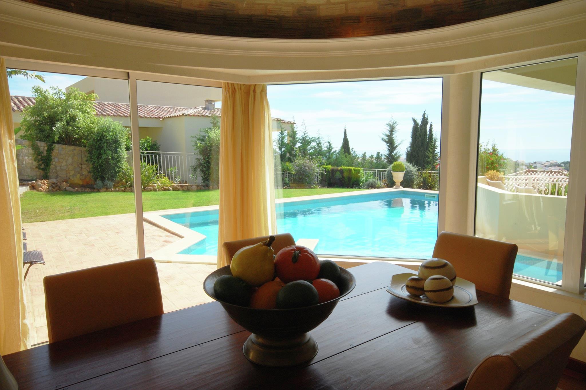 Moderne, frittliggende villa med privat svømmebasseng. Du kommer til svømmebassenget via en av de to lukkede terrassene. Du ser ut over de kuperte omgivelsene, Albufeira og havet. For å gjøre det komplett er det også en nydelig gresshage hvor barna kan boltre seg. Albufeira ligger bare 3 km unna. Det er en hyggelig badeby med mange butikker, restauranter, terrasser og barer. Den gamle delen har bygninger fra en svunnen tid i trange gater og fine plasser. Bystranden er allerede 3,5 km unna, men du har valget mellom strender. Det er mange skjulte bukter langs den vakre kysten. Fint å reise rundt med bil for en dag og gjøre forskjellige ting. De idylliske buktene Praia de São Rafael og Coelha, for eksempel (begge 5 km). Du kan selvfølgelig også bare velge en og bli der hele dagen. For å virkelig bli kjent med denne delen av Algarve bør du forlate kysten. En vakker kjøretur tar deg til de pittoreske landsbyene Paderne (20 km) og Alte (30 km). Begge landsbyene ligger mot en høyde og tiden ser ut til å ha stått stille her.