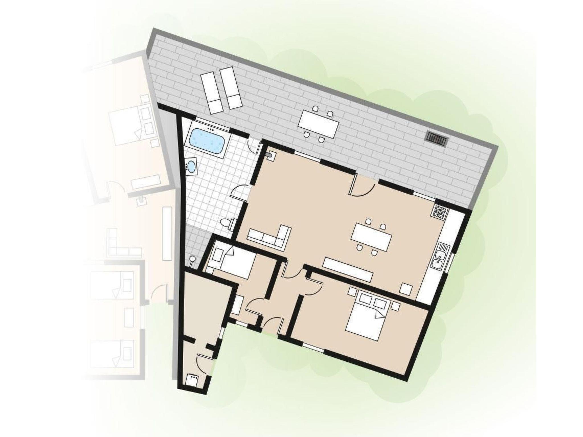 A 40 m², L-shaped, covered veranda, which cannot be seen, allows you to sit outside in almost any weather.
