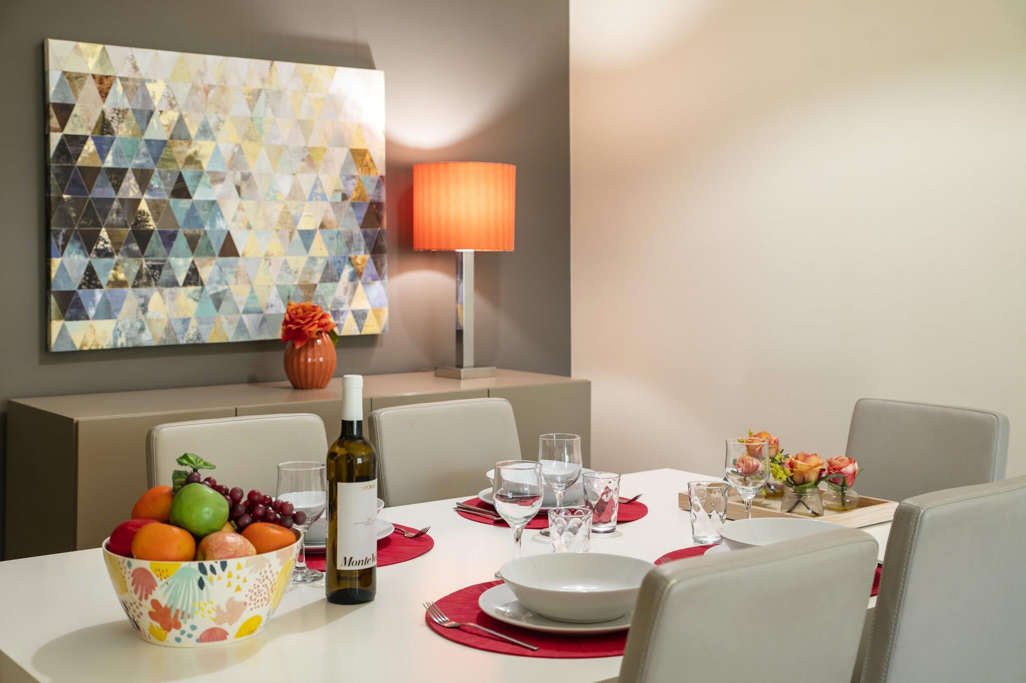 Stue(1 persons sovesofa, TV(flatskjerm, satellitt, Smart-TV), spisebord, sittehjørne, radio), Kjøkken(vannkoker, brødrister, kaffetrakter, stekovn, mikrobølgeovn, oppvaskmaskin, kjøleskap med fryser, Juicemaskin, , Wine glasses), soveværelse(king size dobbeltseng), soveværelse(enkeltseng, enkeltseng), bad(dusj, Hårtørker, ), bad(dusj, håndvask, toalett), bad(badekar, håndvask, toalett), Internett-tilgang, Hagemøbler, grill, vaskemaskin, balkon, gårdhave, oppvarming(elektrisk), terrasse, hage(inngjerdet), parkering, svømmebasseng(deles med andre gjester, utendørs), strykebrett, strykejern,