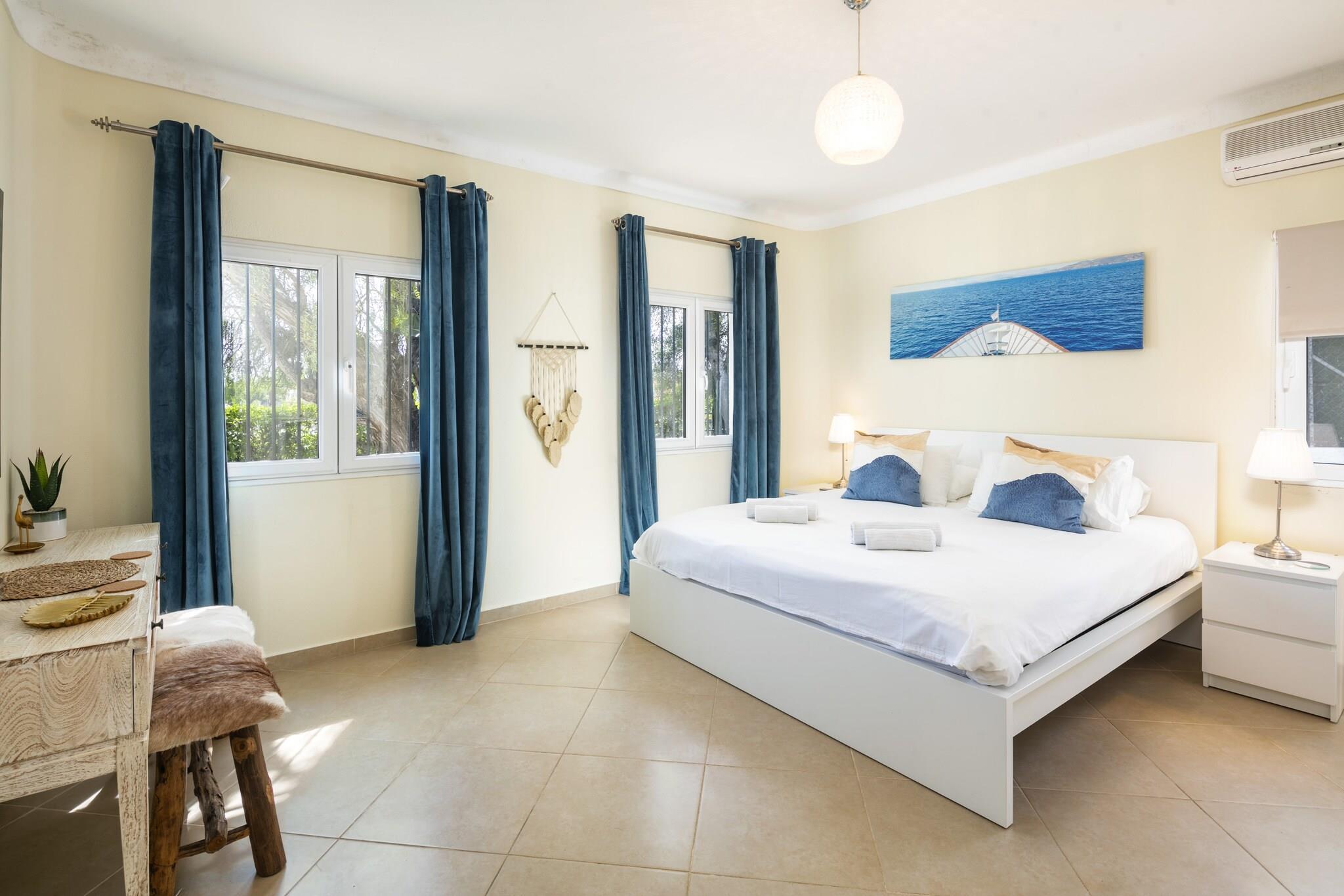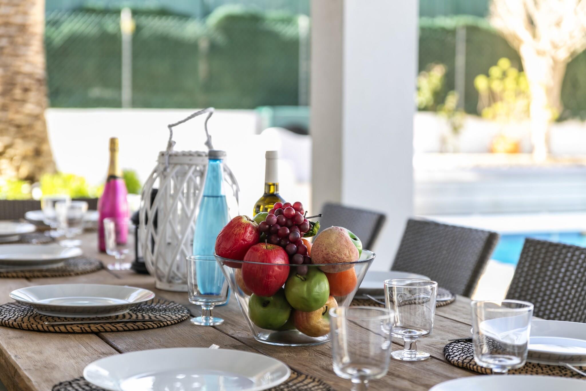 Kjøkken(vannkoker, brødrister, kaffetrakter, stekovn, mikrobølgeovn, oppvaskmaskin, kjøleskap med fryser, Juicemaskin, ), Stue/spisestue(1 persons sovesofa, TV(flatskjerm, satellitt, Smart-TV), spisebord, peisen, sittehjørne), soveværelse(dobbeltseng), soveværelse(dobbeltseng), soveværelse(enkeltseng, enkeltseng), soveværelse(enkeltseng, enkeltseng), soveværelse(king size dobbeltseng), bad(dusj, Hårtørker, , ), bad(dusj, Hårtørker, , ), bad(dusj, Hårtørker, , ), bad(dusj, Hårtørker, , ), bad(toalett), Hagemøbler, tørketrommel, dusj, vaskemaskin, balkon, oppvarming(sentral), klimaanlegg, terrasse, hage, solsenge, grill, parkering, parkering, svømmebasseng(privat, oppvarmet), strykebrett, strykejern, Hårtørker, , Wine glasses