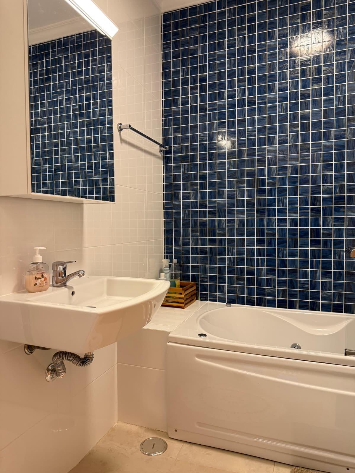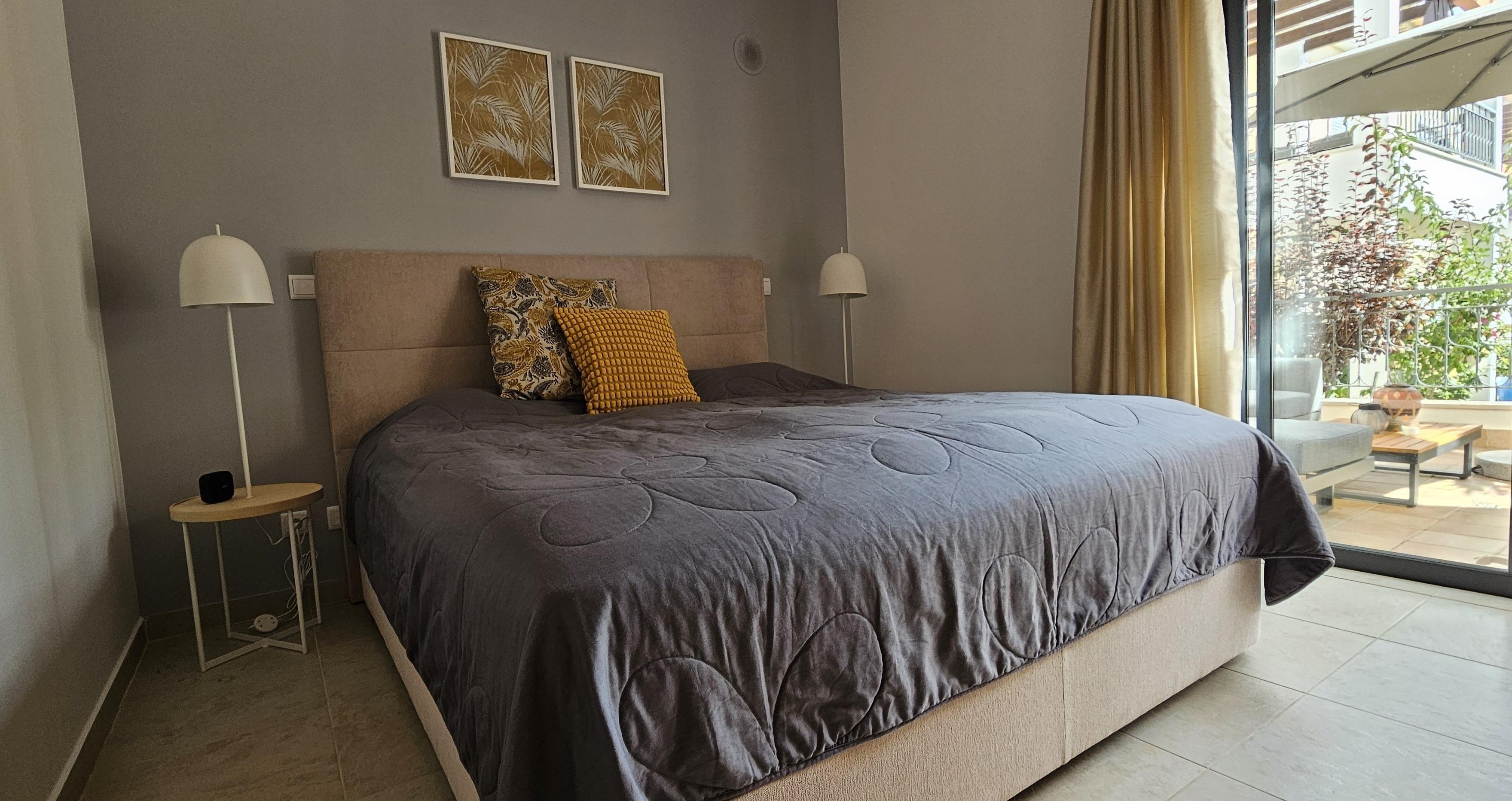 Die Unterkunft ist mit allen Annehmlichkeiten ausgestattet, die Sie sich wünschen können, um Ihren Aufenthalt so angenehm wie möglich zu gestalten. Die Wohnung bietet Wohnzimmer, zwei Schlafzimmer, zwei Bäder, Küche und zwei große Terrassen. Zentraler Gemeinschaftspool mit Palmen und Blumen sorgt für entspannte Momente – perfekt für Kinder zum Planschen und für Paare zum Relaxen.