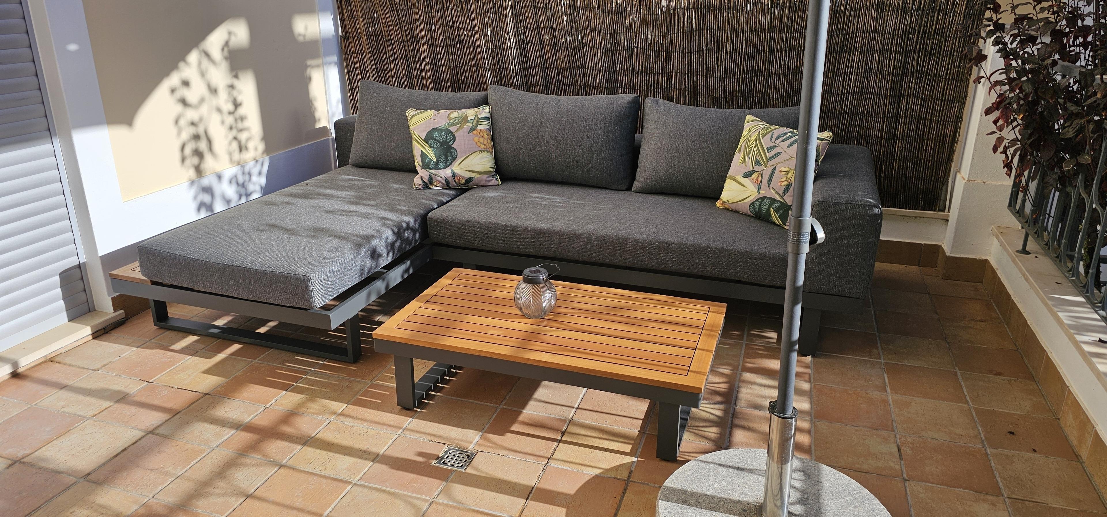 Vor dem Wohnzimmer lädt die 30 m² große Terrasse zum Frühstück und Essen ein; der hintere Teil der Terrasse mit Zugang zum Schlafzimmer bietet Platz für Morgenkaffee oder Abendwein auf einer großzügigen Sofalandschaft. Das Wohnzimmer verfügt über eine Essecke, zwei Ecksofas, Sessel und einen 55" Smart-TV.
