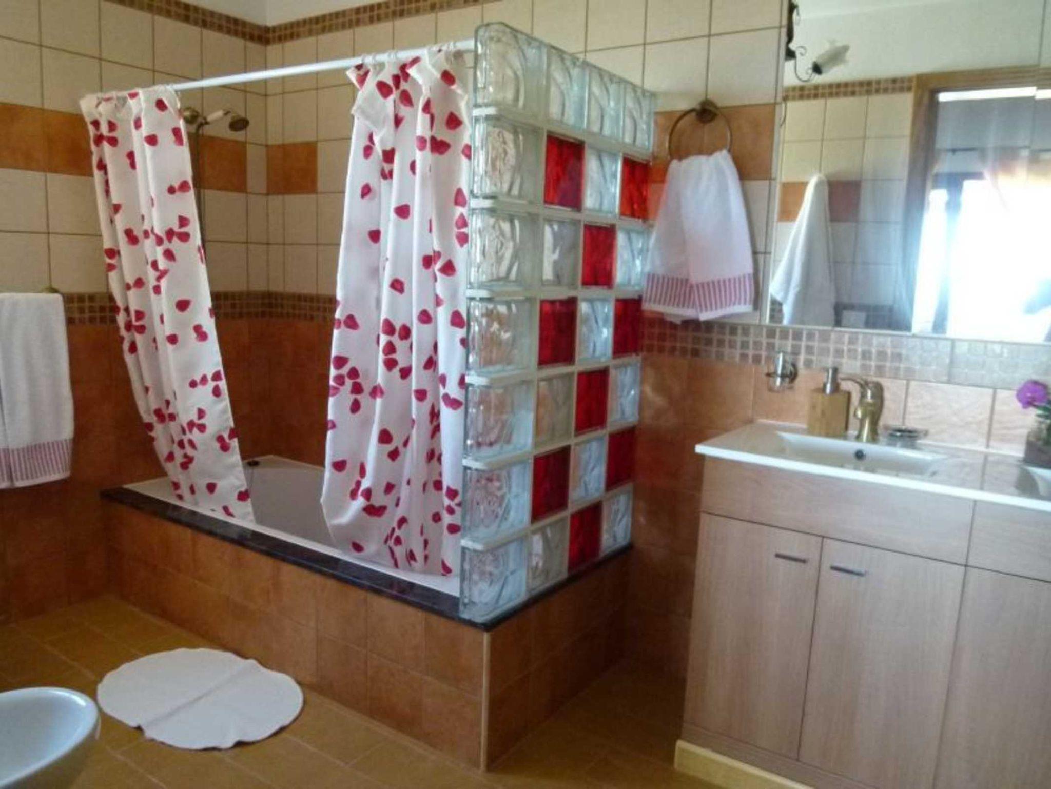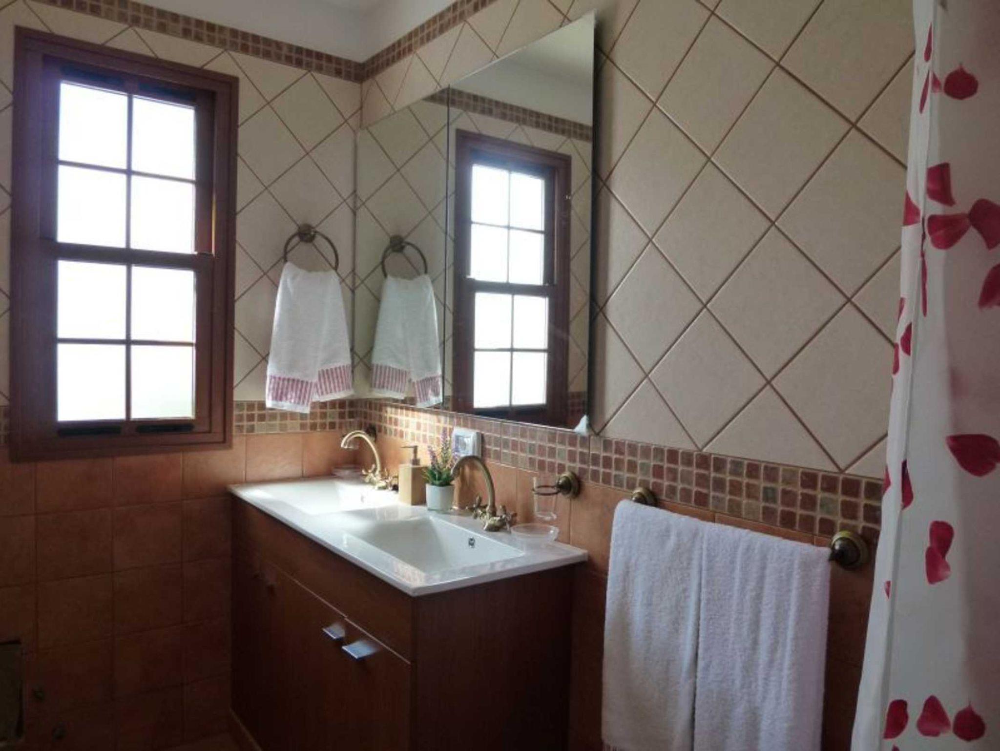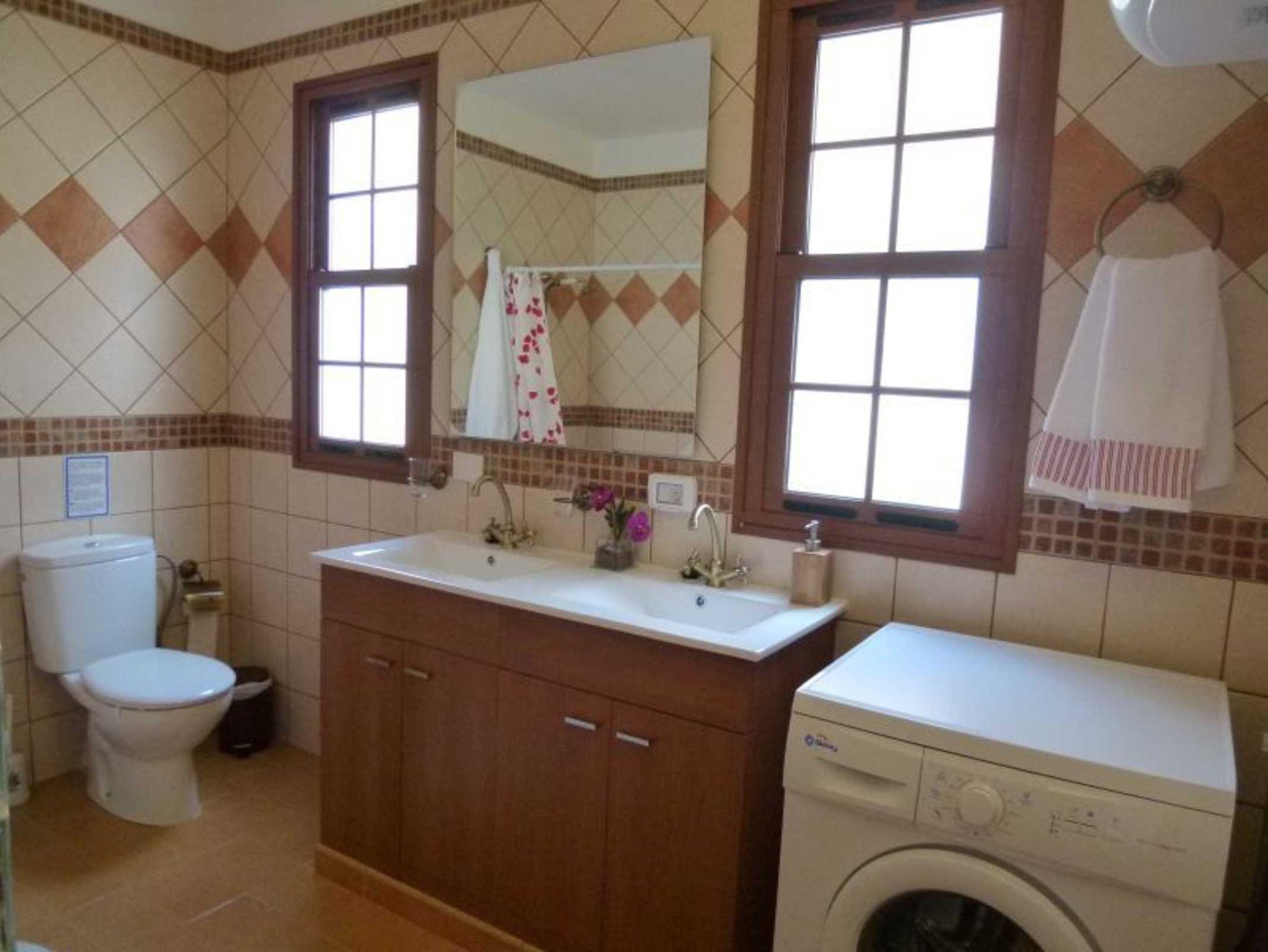 Beide Schlafzimmer sind mit guten Matrazen ausgestattet. Neben dem Hauptschlafzimmer mit Doppelbett gibt es ein weiteres Schlafzimmer mit 2 Einzelbetten und en-suite Bad. Zusätzlich gibt es ein separates Bad mit Badewanne und Doppelwaschbecken.