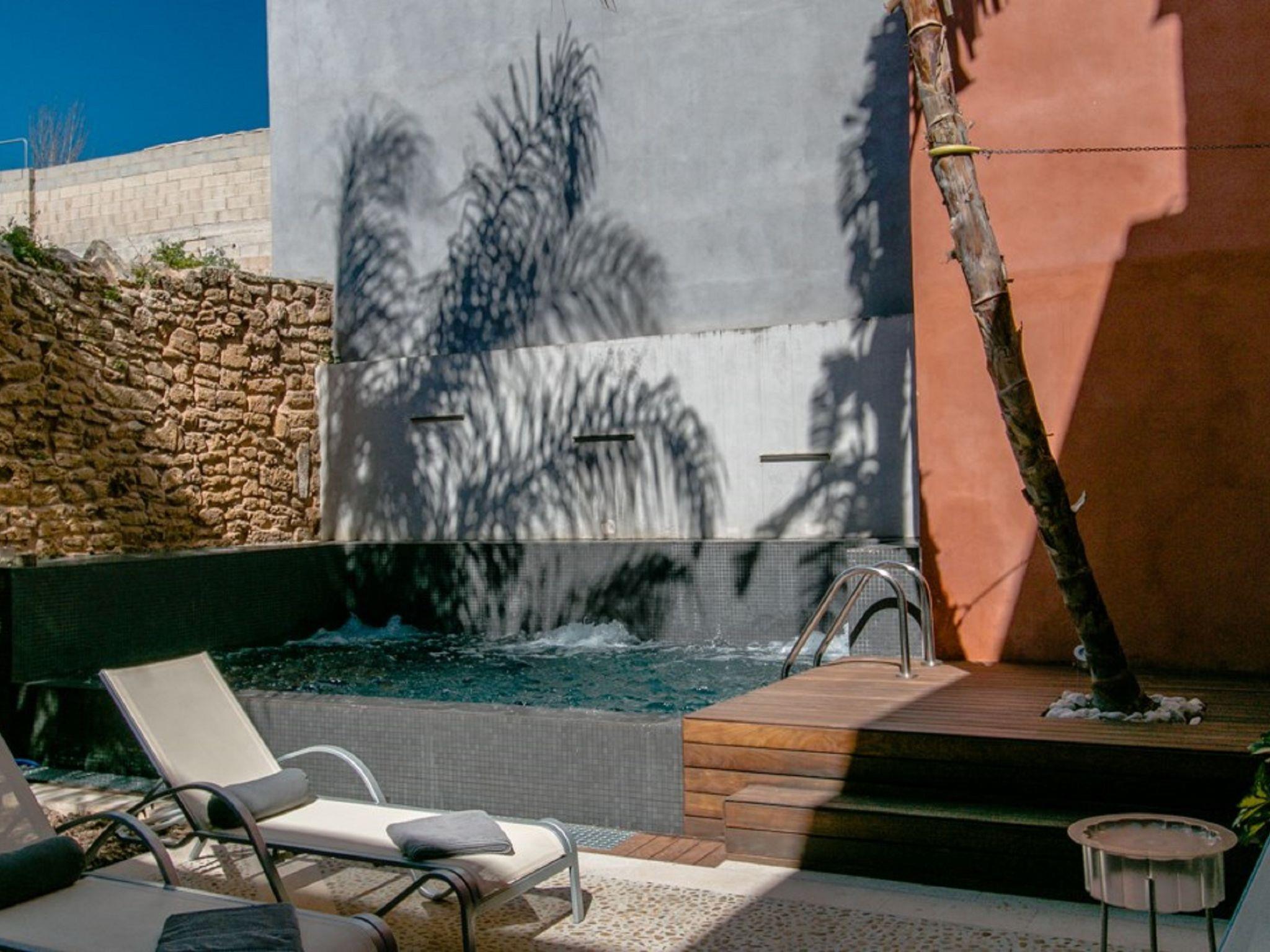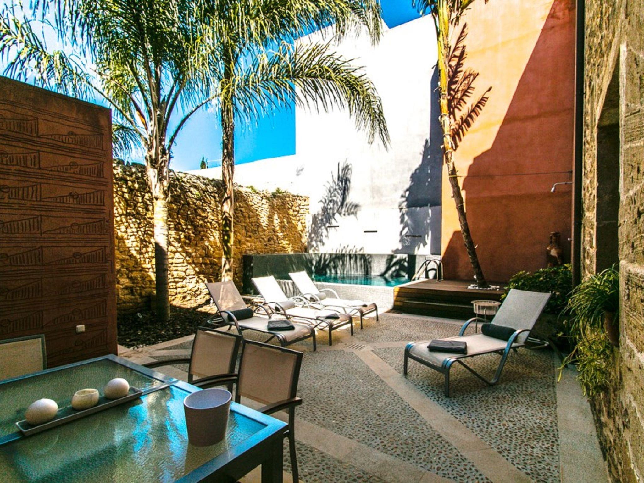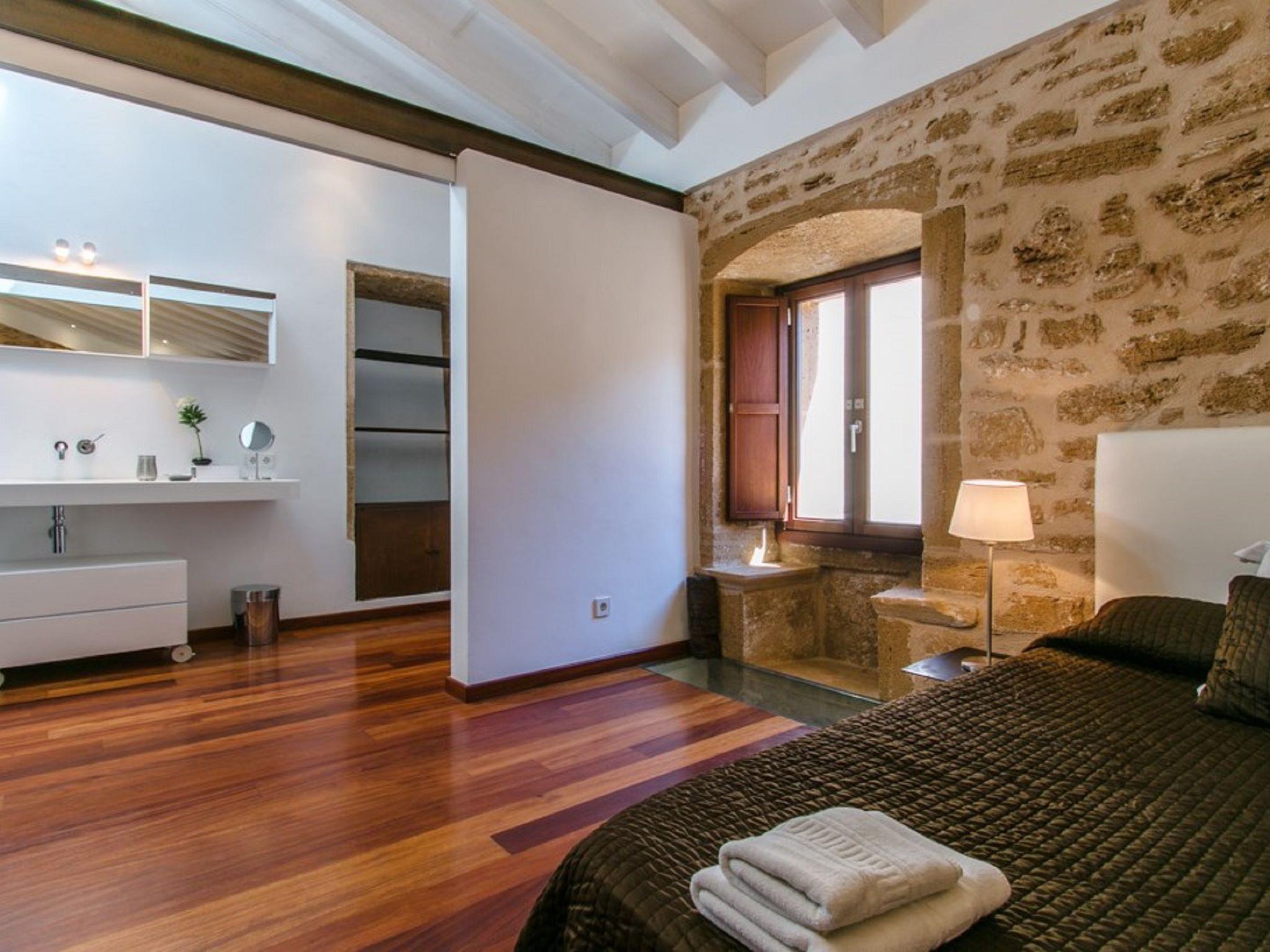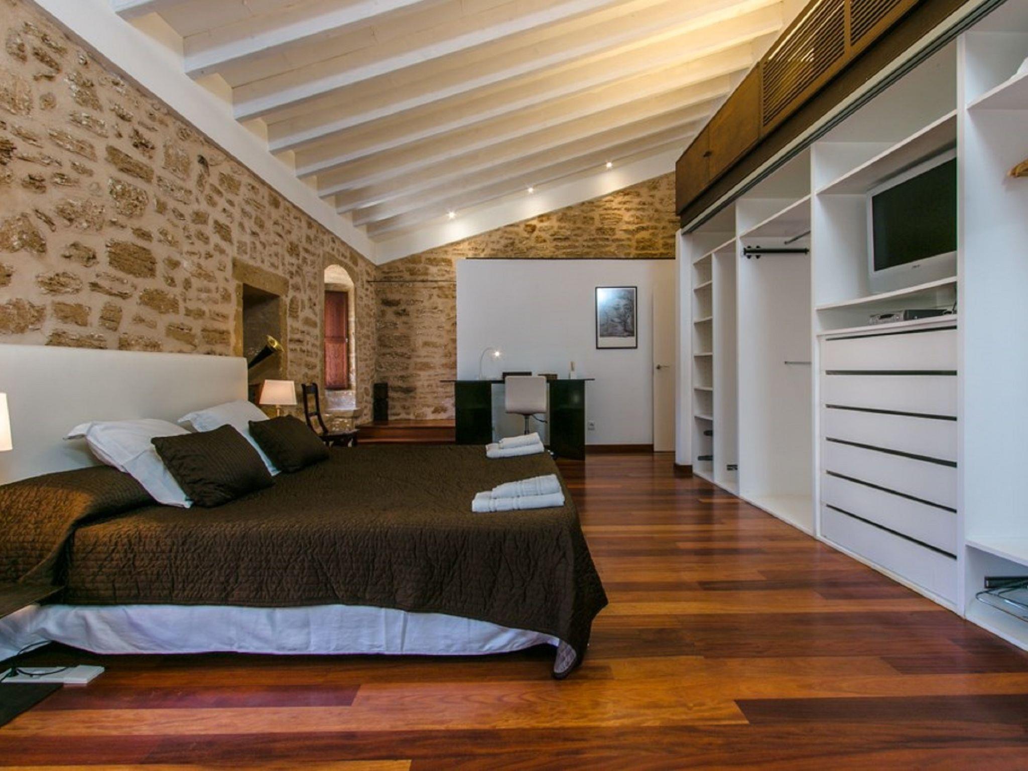 Alcudia: Very beautiful, rustic, historical house "Sa Muralla", 2 storeys. In the resort Alcudia, 700 m from the sea, 700 m from the beach. Private: beautiful, well-kept garden, courtyard, swimming pool angular (4 x 3 m, depth 190 cm, seasonal availability: 01.Apr. - 31.Oct.). Outdoor shower, arbour, terrace, garden furniture, barbecue. In the house: WiFi, central heating system, air conditioning, washing machine, tumble dryer. Bus stop 600 m, sandy beach "Playa del Corral den Bennasar" 1 km pebble beach "Es Morer Vermell" 2.1 km. Sports harbour 1.6 km, marina 1.6 km, golf course (18 hole) 1.9 km. Nearby attractions: Alcudia Old Town 600 m, Alcudia Historical Centre 600 m, Hidropark Puerto Alcudia 1.8 km. Please note: suitable for families, suitable for seniors baby equipment (included). Object suitable for 6 adults groups of teenagers on request only. Loading and unloading of baggage is possible at the holiday house. Airfield 60 km from the property.