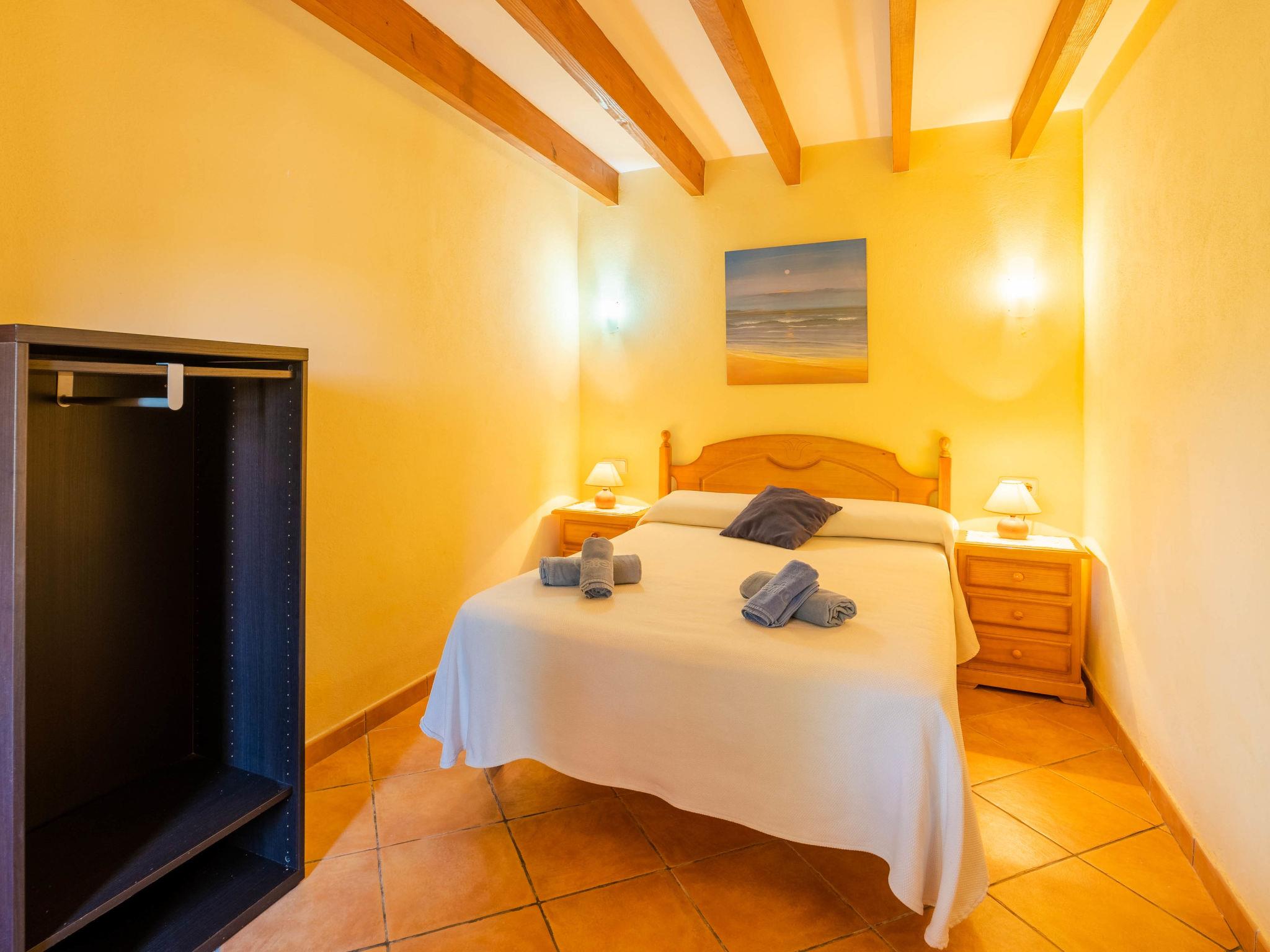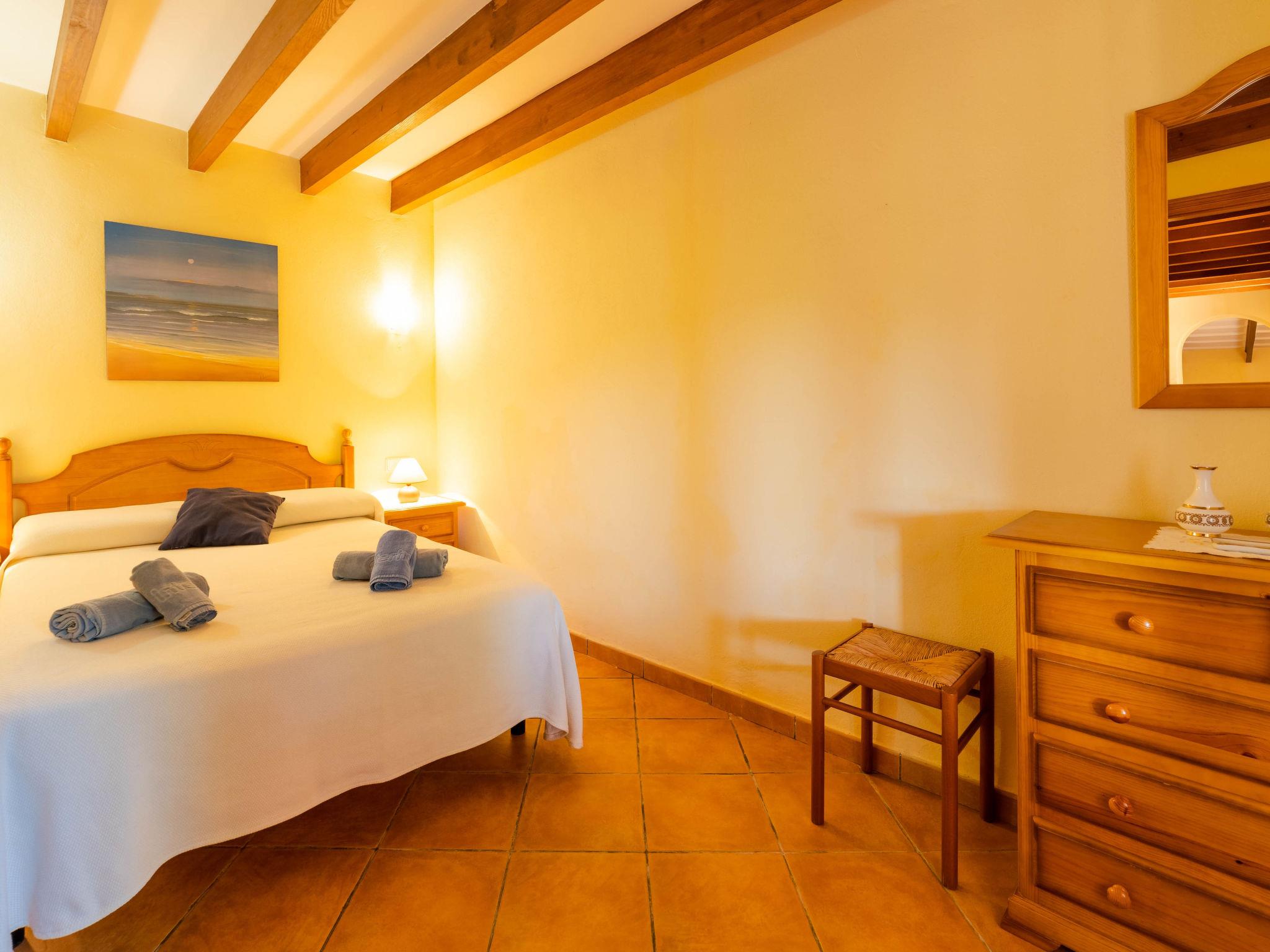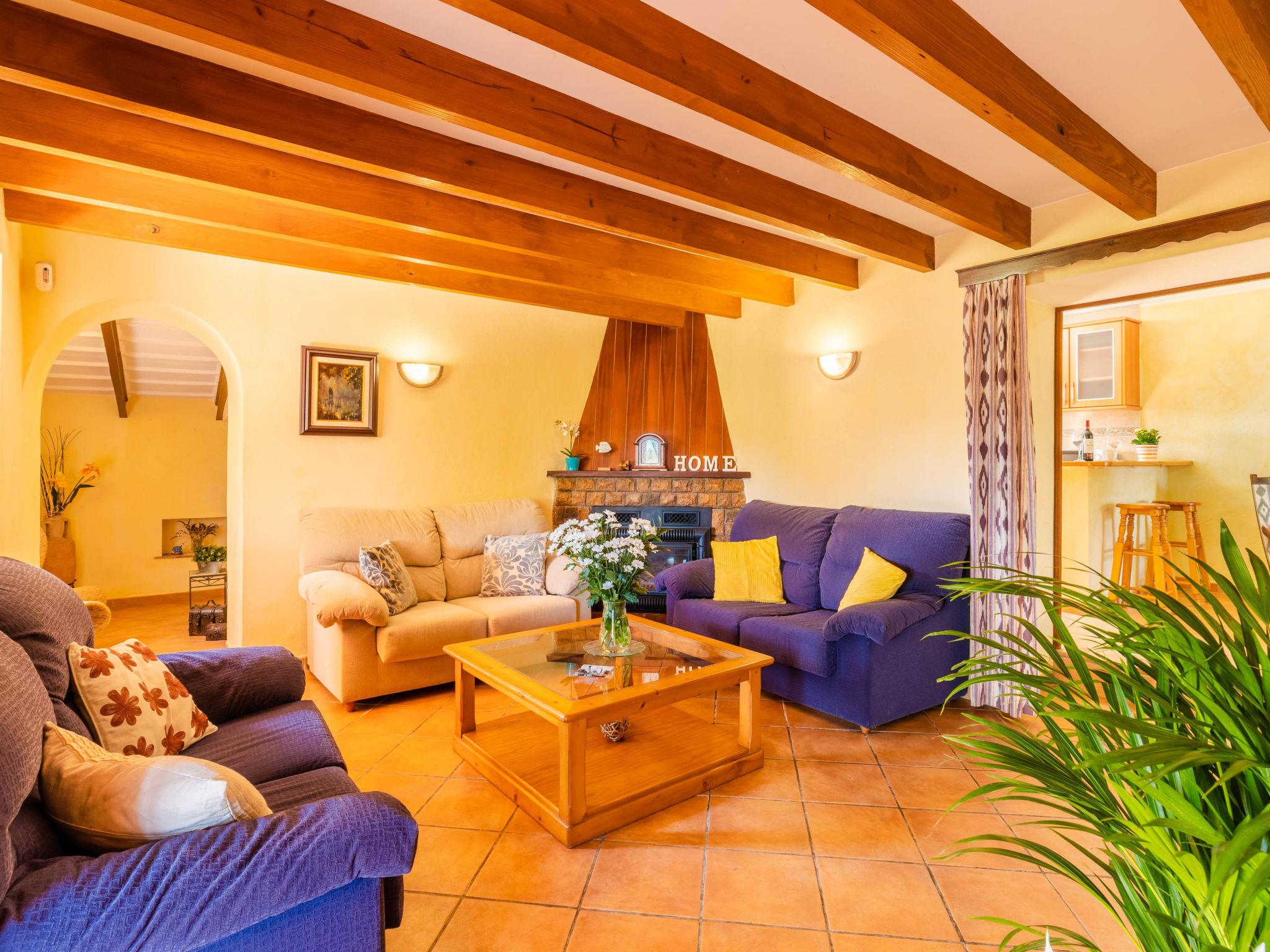 "Can Josepot", 4-room house 130 m2 on 2 levels. Object suitable for 6 adults. Spacious, renovated, very practical and cosy furnishings: large living room with open-hearth fireplace, satellite TV, digital TV, flat screen and fan. Exit to the patio. 1 double bedroom with panoramic window with 1 french bed (150 cm, length 190 cm), fan. Kitchen-/living room (oven, 3 ceramic glass hob hotplates, microwave, freezer, electric coffee machine) with bar, dining table. Exit to the patio, to the swimming pool. Bath/bidet/WC. Upper floor: 1 room with 1 pull-out bed (2 pers. 2 x 90 cm, length 190 cm), air conditioning and forced-air heating. 1 large double bedroom with 2 beds (90 cm, length 190 cm), air conditioning and forced-air heating. Shower/bidet/WC. Terrace 100 m2, small terrace 9 m2, large garden. Terrace furniture, barbecue, deck chairs (3), covered balcony. Beautiful view of the mountains and the countryside. Facilities: washing machine, iron, children's high chair, baby cot for up to 2 year olds, hair dryer. Internet (WiFi, free). Parking (fenced) at the house. Suitable for families. Maximum 1 pet/ dog allowed. The bathroom on the first floor is reached via the outside terrace. In addition: ceiling fans, electric heaters and 100 litre boiler. Air conditioning from March 2020. ETV3456 // Reg. Nr.: ESFCTU00000704300013895600000000000000000000ETV/34560