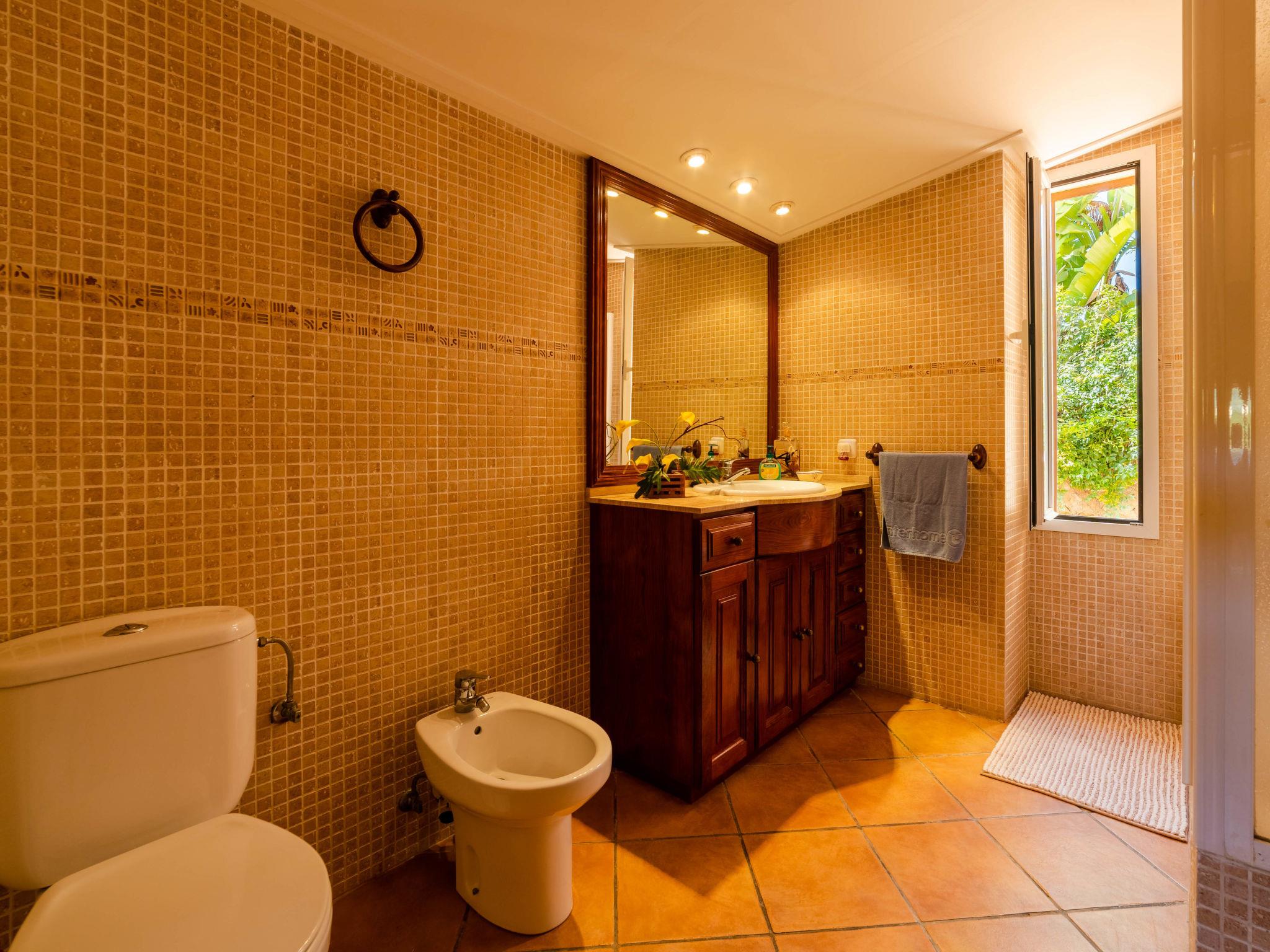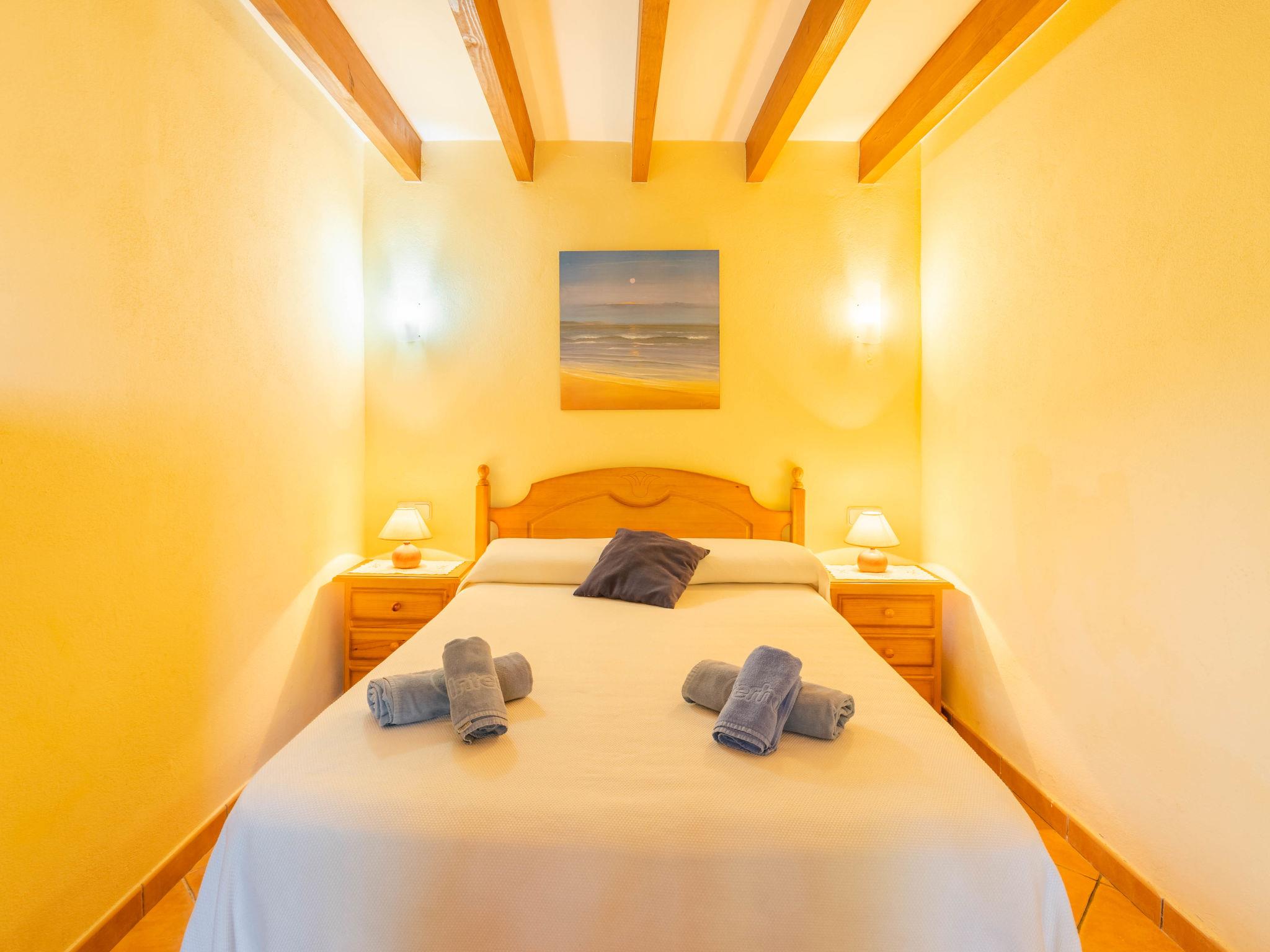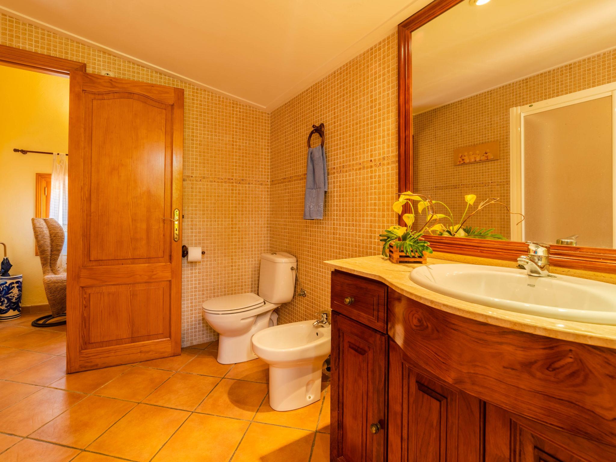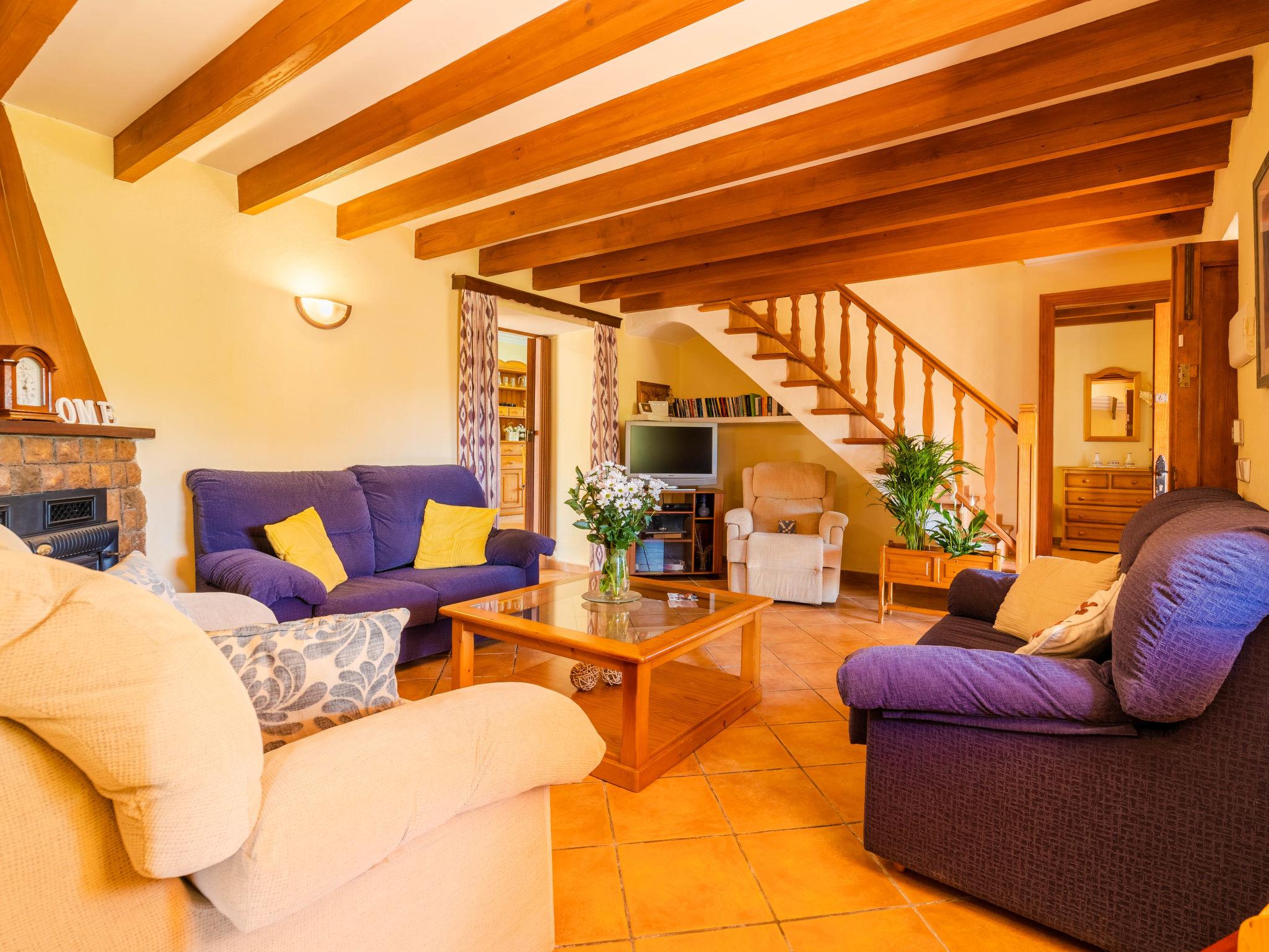 "Can Josepot", 4-room house 130 m2 on 2 levels. Object suitable for 6 adults. Spacious, renovated, very practical and cosy furnishings: large living room with open-hearth fireplace, satellite TV, digital TV, flat screen and fan. Exit to the patio. 1 double bedroom with panoramic window with 1 french bed (150 cm, length 190 cm), fan. Kitchen-/living room (oven, 3 ceramic glass hob hotplates, microwave, freezer, electric coffee machine) with bar, dining table. Exit to the patio, to the swimming pool. Bath/bidet/WC. Upper floor: 1 room with 1 pull-out bed (2 pers. 2 x 90 cm, length 190 cm), air conditioning and forced-air heating. 1 large double bedroom with 2 beds (90 cm, length 190 cm), air conditioning and forced-air heating. Shower/bidet/WC. Terrace 100 m2, small terrace 9 m2, large garden. Terrace furniture, barbecue, deck chairs (3), covered balcony. Beautiful view of the mountains and the countryside. Facilities: washing machine, iron, children's high chair, baby cot for up to 2 year olds, hair dryer. Internet (WiFi, free). Parking (fenced) at the house. Suitable for families. Maximum 1 pet/ dog allowed. The bathroom on the first floor is reached via the outside terrace. In addition: ceiling fans, electric heaters and 100 litre boiler. Air conditioning from March 2020. ETV3456 // Reg. Nr.: ESFCTU00000704300013895600000000000000000000ETV/34560