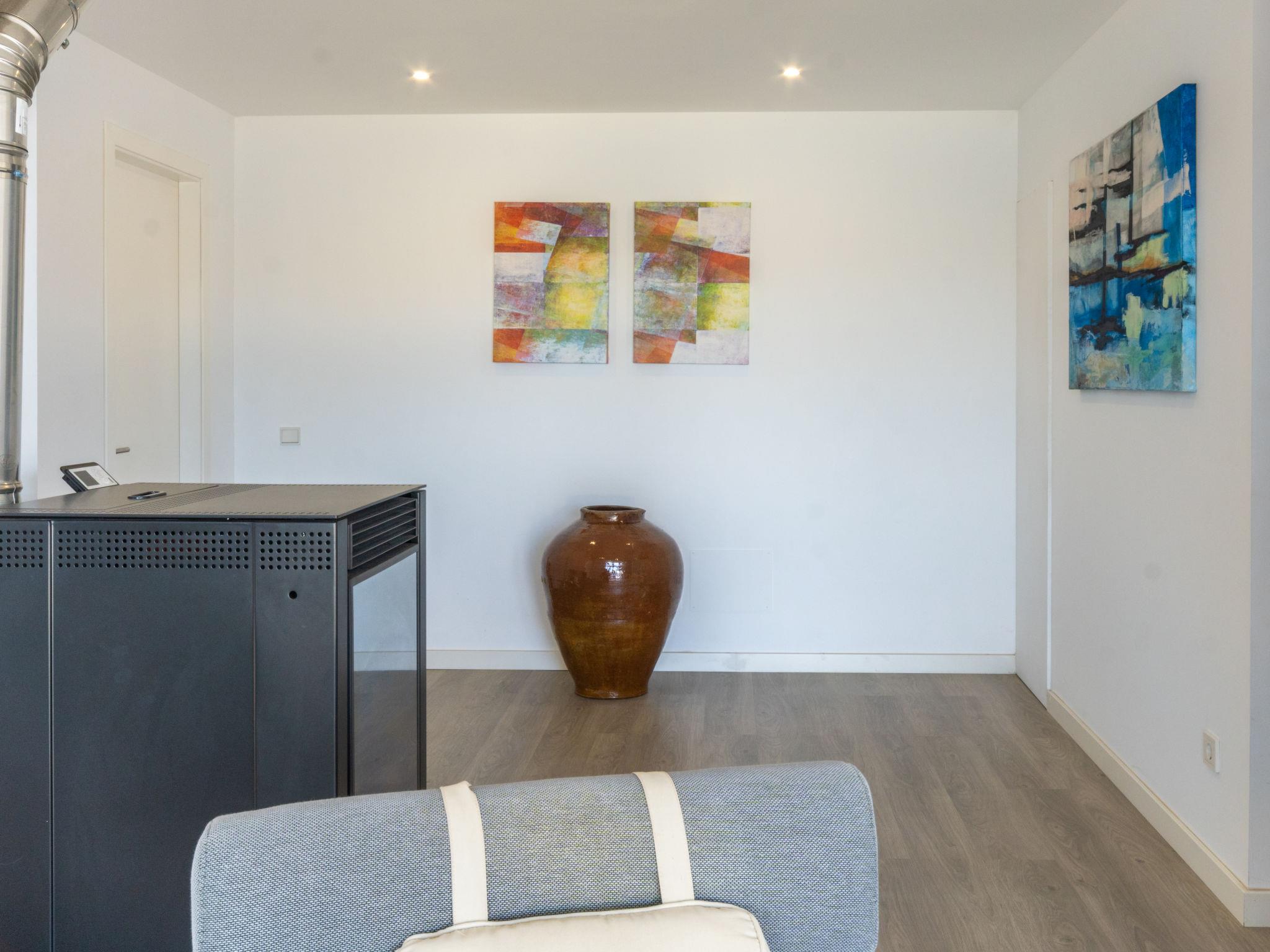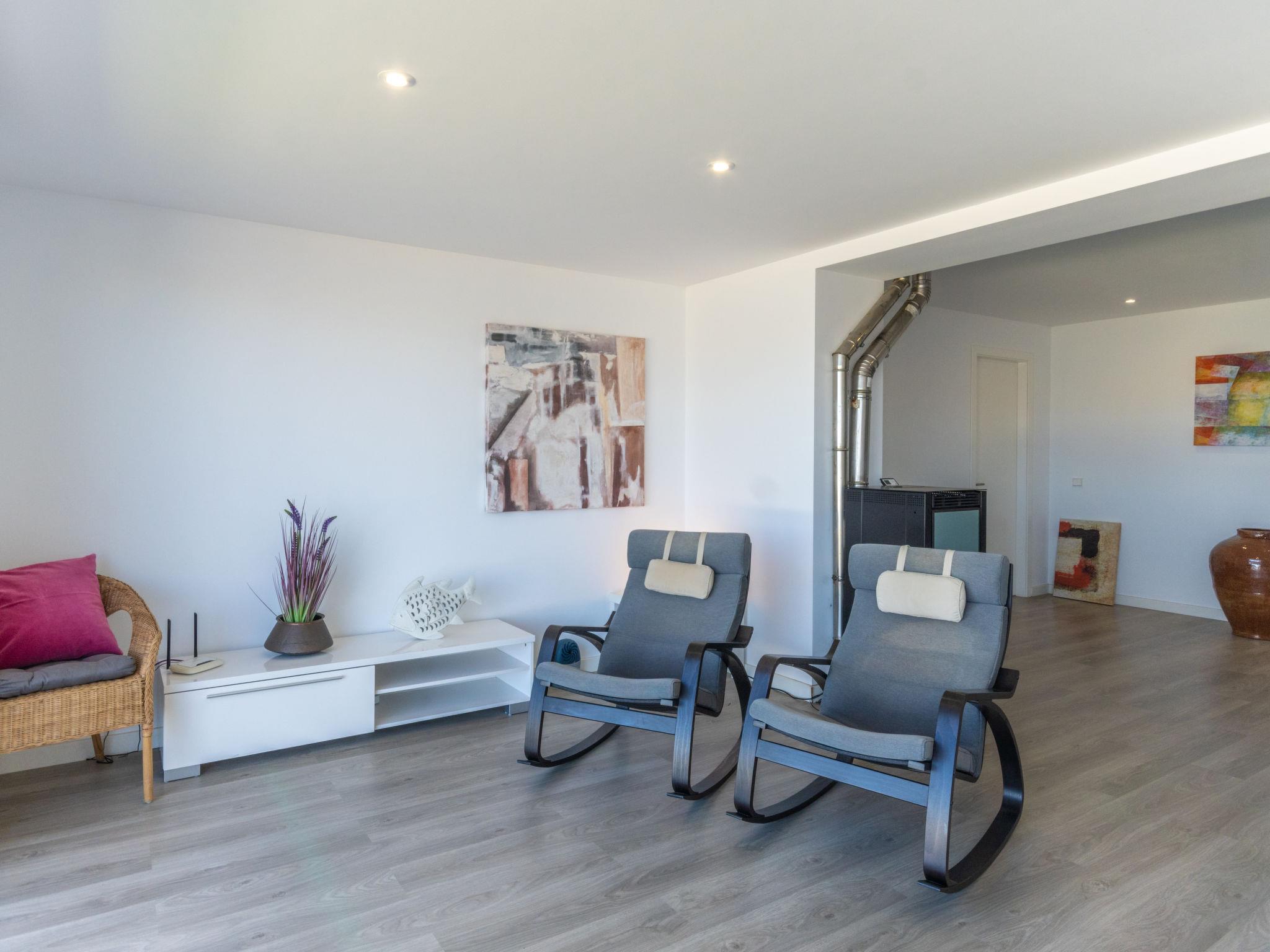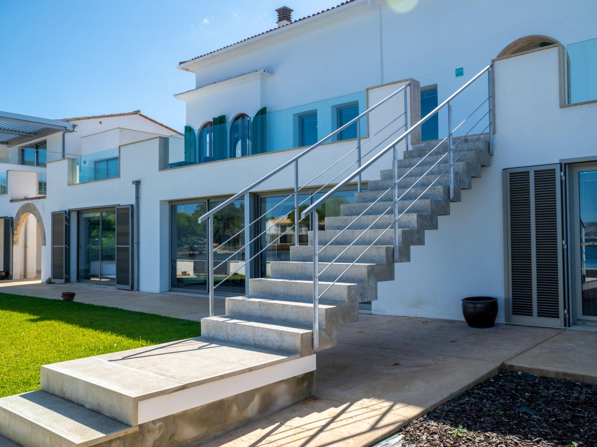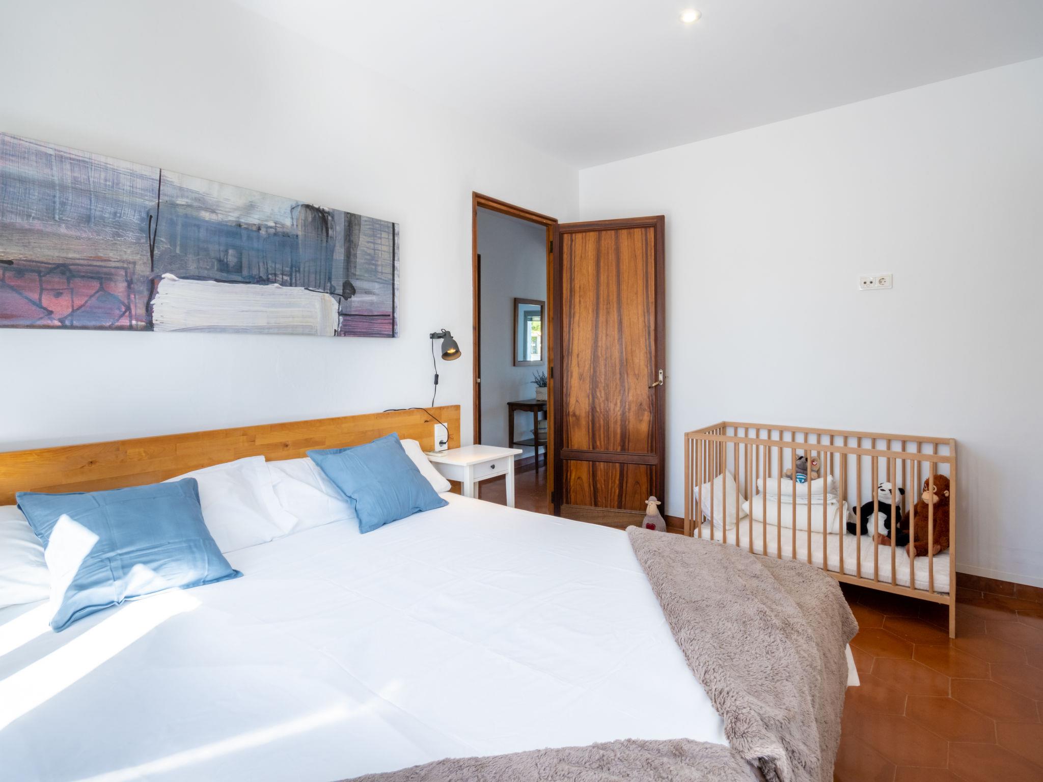 "Can Verd", 9-room villa 300 m2 on 2 levels. Object suitable for 10 adults. Fully renovated in 2016, very comfortable and cosy furnishings: living/dining room with panoramic window with dining table, satellite TV, digital TV, flat screen, air conditioning and forced-air heating. Exit to the terrace. 1 large double bedroom with curtain with 1 french bed (135 cm, length 190 cm). 1 double bedroom with 2 beds (90 cm, length 200 cm), air conditioning and forced-air heating. 1 double bedroom with 2 beds (90 cm, length 200 cm). 1 double bedroom with sliding door curtain panoramic window with 1 sofabed and 1 french bed (150 cm, length 200 cm), bath/shower/WC, TV, satellite TV, air conditioning and forced-air heating. Exit to the terrace. Kitchen 15 m2 (4 hot plates, oven, dishwasher, microwave, freezer, electric coffee machine) with dining table. Exit to the terrace. 2 Baths/showers/WC. On the lower ground floor: lounge with 1 sofabed, dining table and air conditioning. Exit to the patio. Office with panoramic window. Exit to the patio. 1 double bedroom with 1 french bed (150 cm, length 200 cm), bath/shower/WC and air conditioning. Exit to the patio. Bath/shower/WC. Large patio, porch. Terrace furniture, balcony furniture, barbecue, deck chairs, covered balcony, sitting area. Very beautiful panoramic view of the sea, the mountains and the bay. Facilities: washing machine, dryer, safe, iron, children's high chair, baby cot for up to 2 year olds, hair dryer. Internet (WiFi, free). At the house. Please note: suitable for families one double bedroom is outside the apartment. Fire extinguisher. ETV/55365 // Reg. Nr.: ESFCTU00000704300008406200000000000000000000ETV/55365