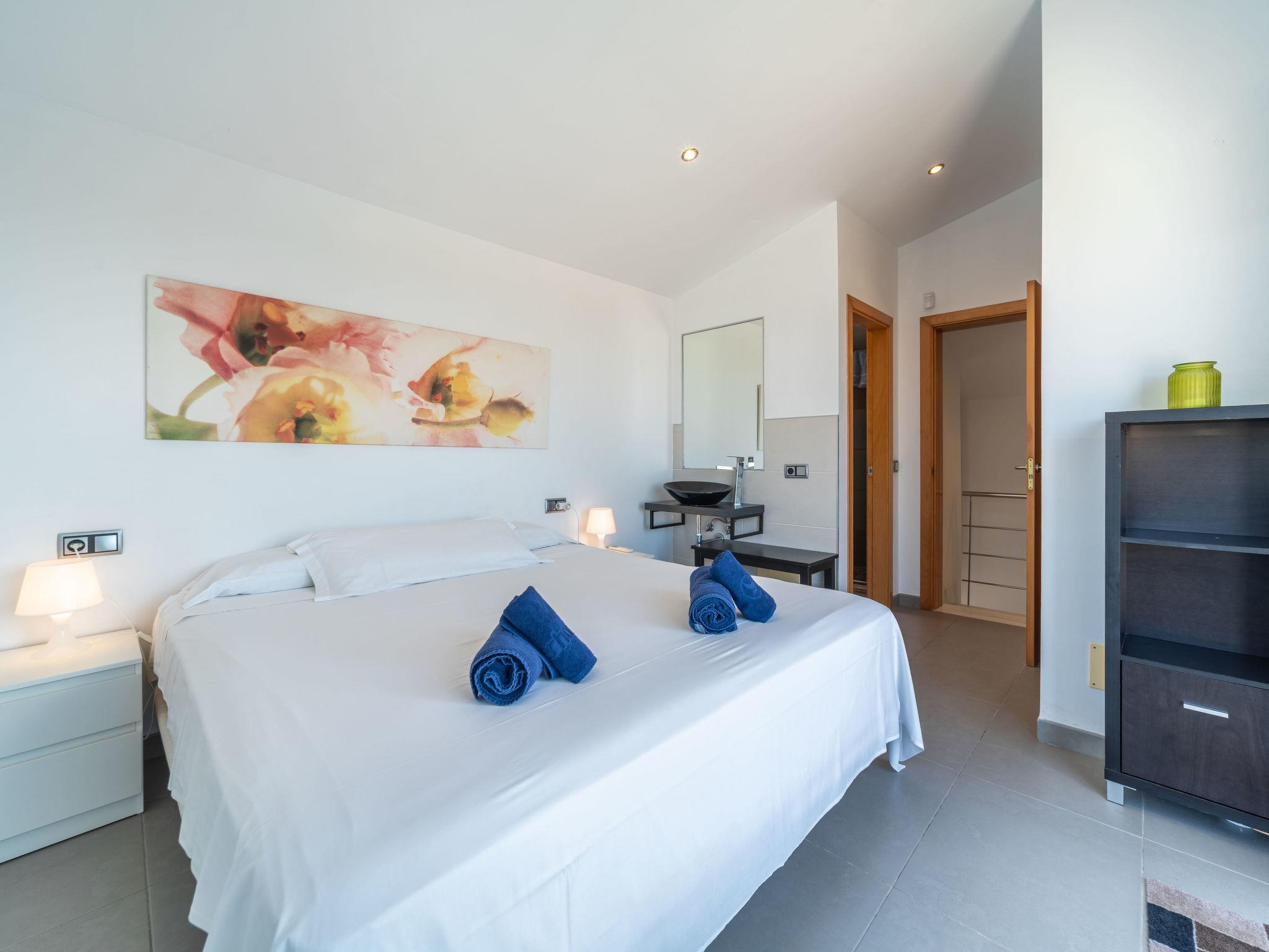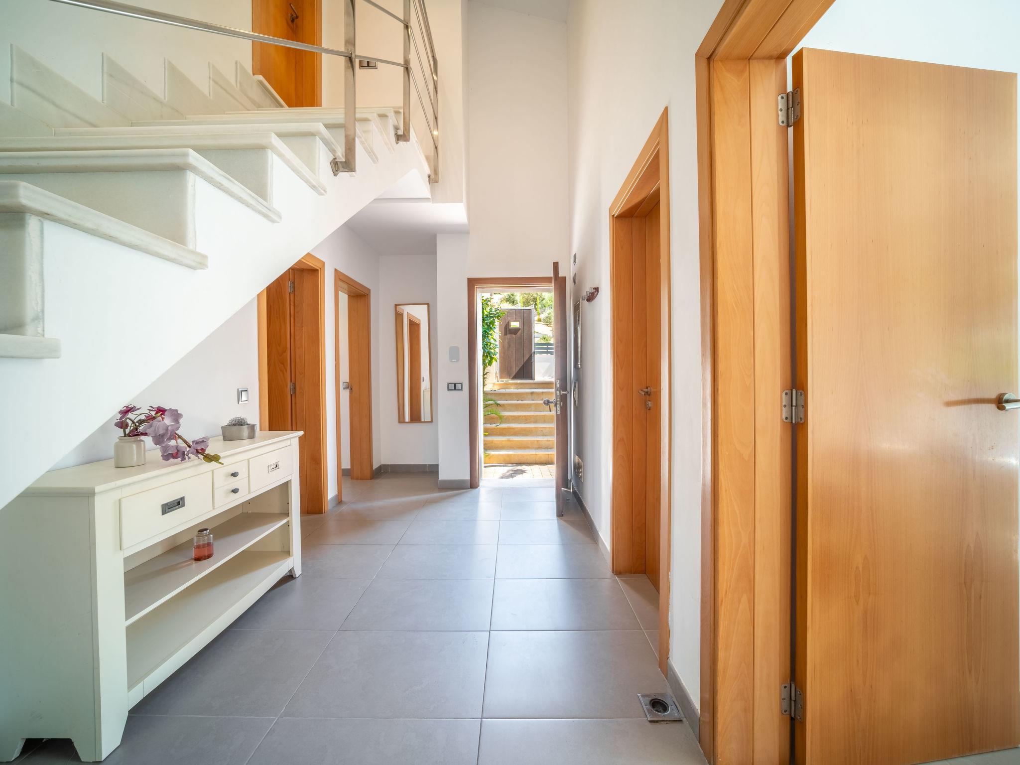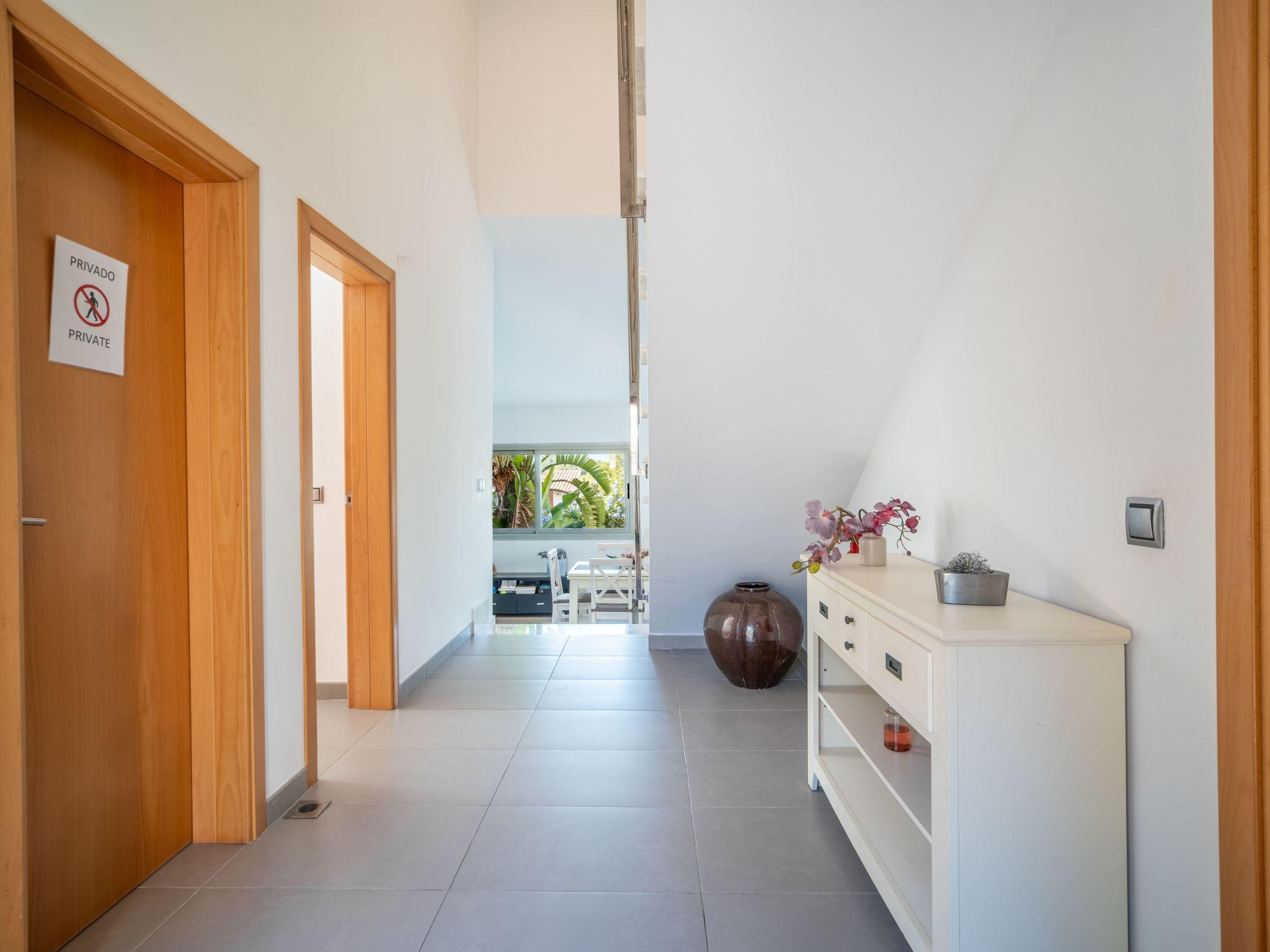 "Amanecer", 4-room villa 157 m2 on 2 levels. Object suitable for 6 adults. Spacious and bright, modern and cosy furnishings: open large living/dining room with sliding door, panoramic window with dining table, TV, satellite TV, flat screen, air conditioning and forced-air heating. Exit to the patio, to the swimming pool. 1 large double bedroom with panoramic window with 2 beds (90 cm, length 190 cm), bath/WC. 1 large double bedroom with panoramic window with 2 beds (90 cm, length 190 cm). Kitchen (oven, dishwasher, 4 ceramic glass hob hotplates, microwave, freezer, electric coffee machine). Exit to the garden. Bath/shower/WC. Upper floor: 1 large double bedroom with sliding door, panoramic window with 1 french bed (180 cm, length 200 cm), bath/shower/WC, air conditioning and forced-air heating. Exit to the terrace. Large terrace, patio, lawn, porch. Terrace furniture, balcony furniture, barbecue, deck chairs, covered balcony. Partial view of the sea and the mountains. Facilities: washing machine, iron, hair dryer. Internet (WiFi, free). ETV/2273 // Reg. Nr.: ESFCTU00000704300005100200000000000000000000ETV/22730