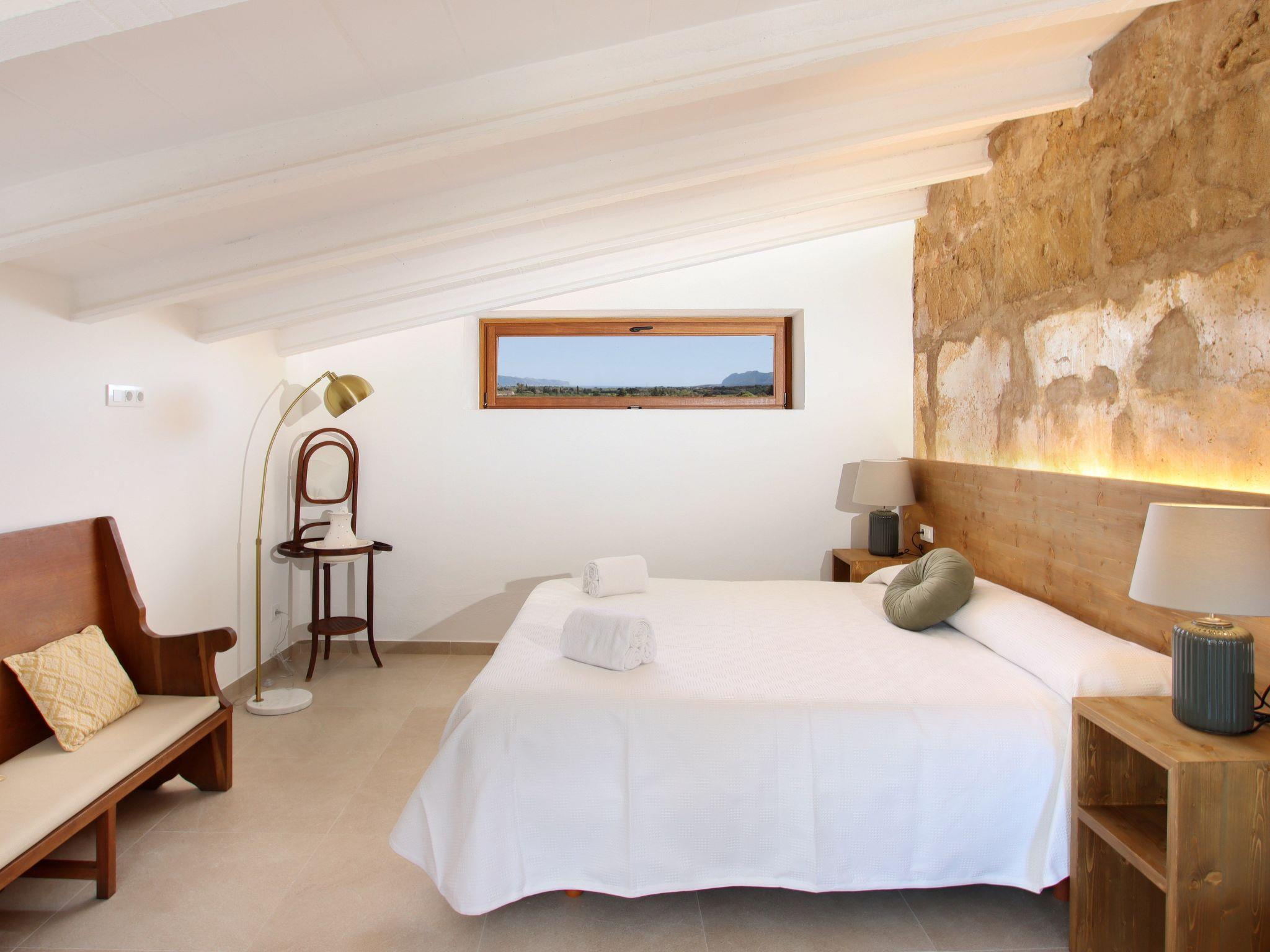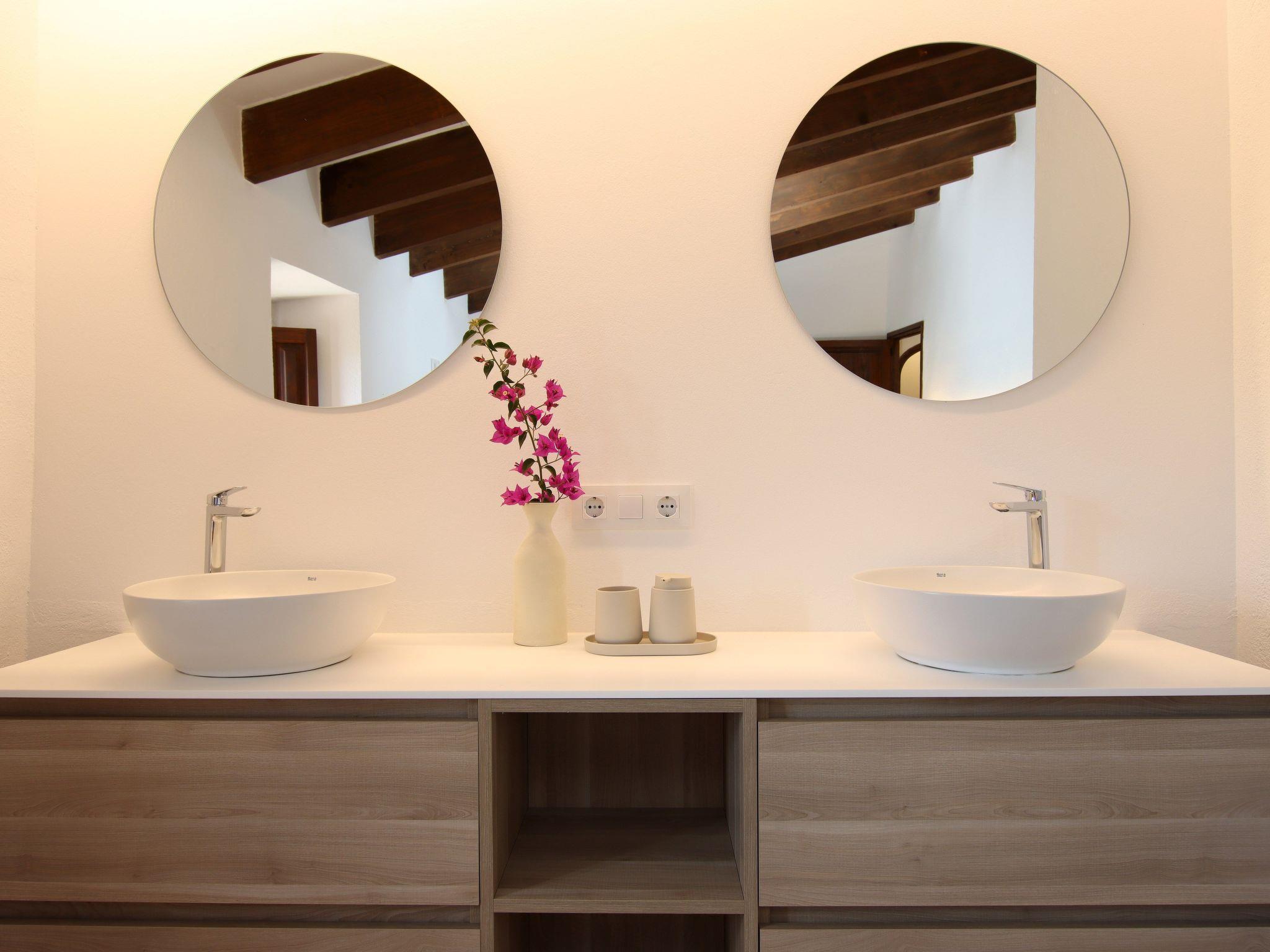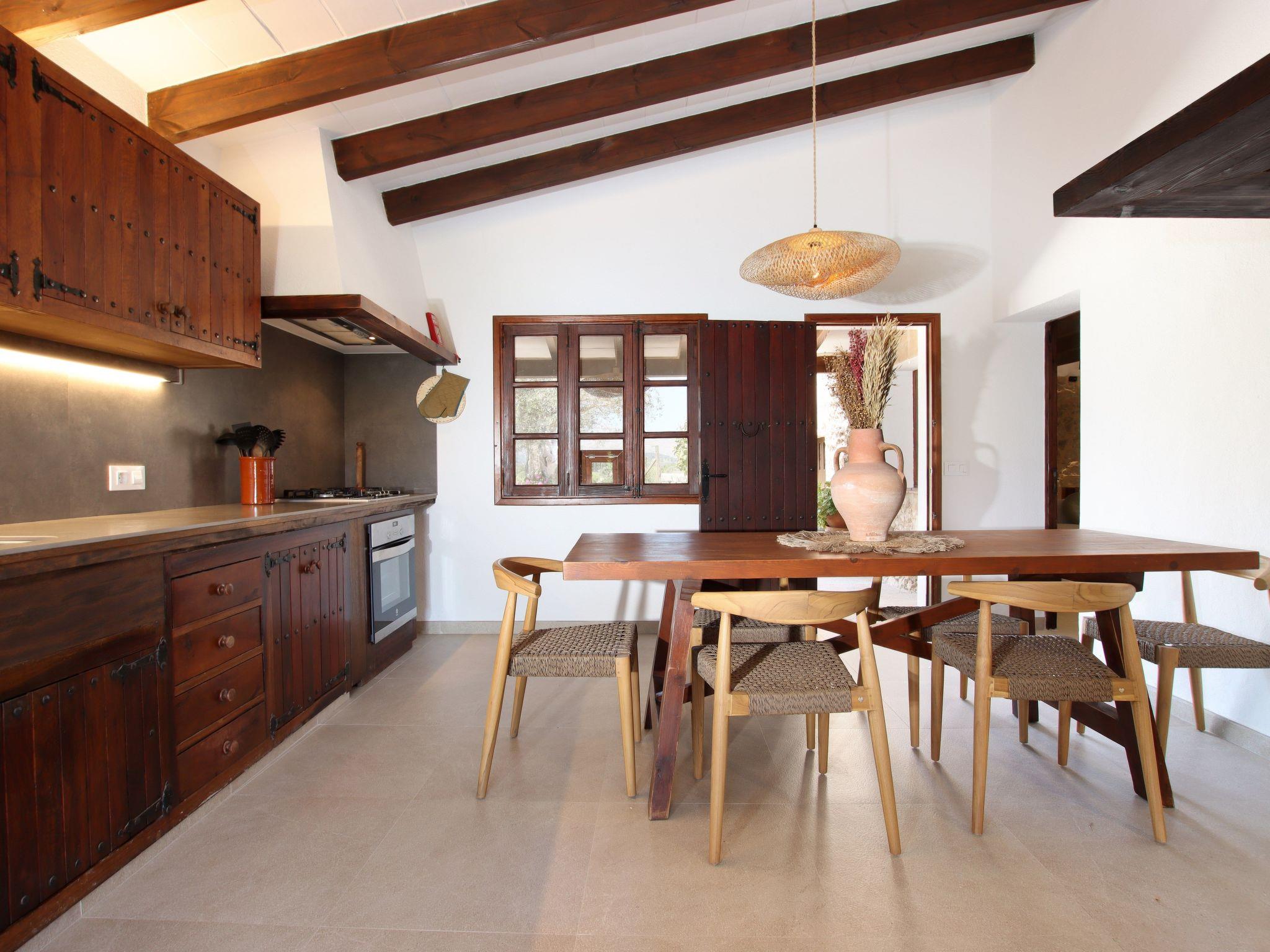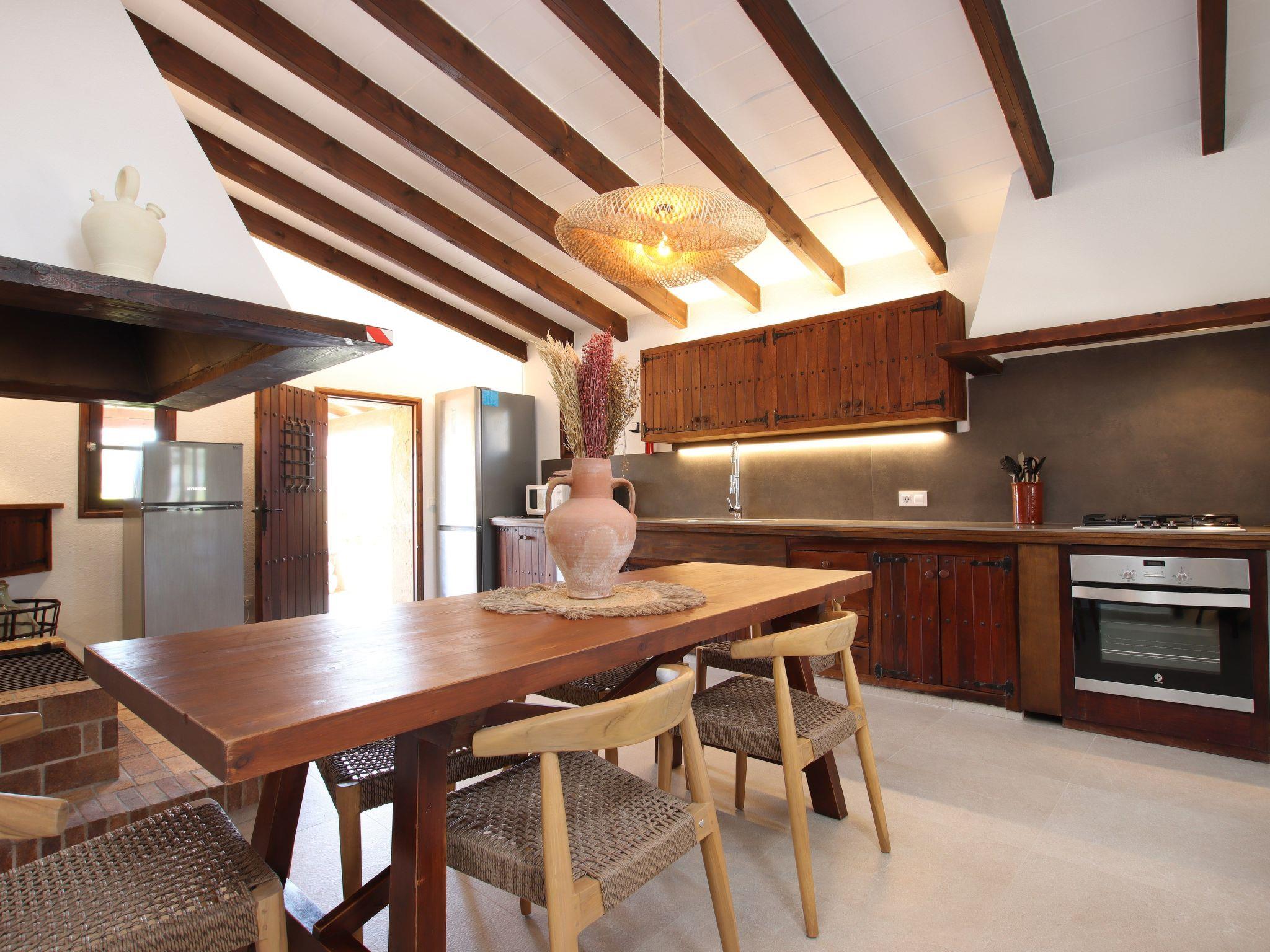 The interior of the villa has a welcoming hall and stairs leading to the upper floor. The interior is well equipped and perfectly combines modern comforts with traditional Mallorcan charm. There is a spacious living room equipped with a large sofa and plasma TV and a separate cosy reading area for your peace and quiet. In this part of the house there is also a spacious traditional kitchen equipped with modern appliances and a charming fireplace. A dining table offers ample space for family meals.