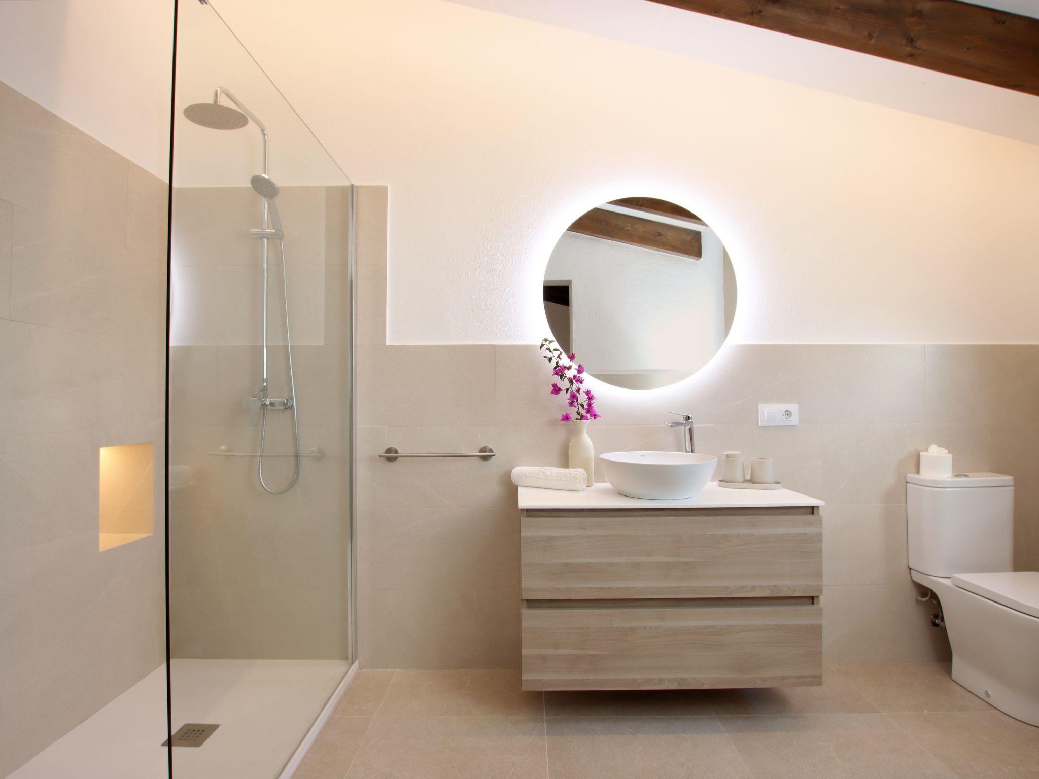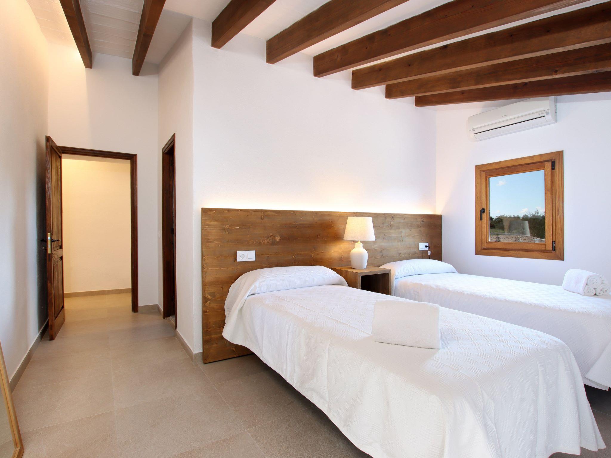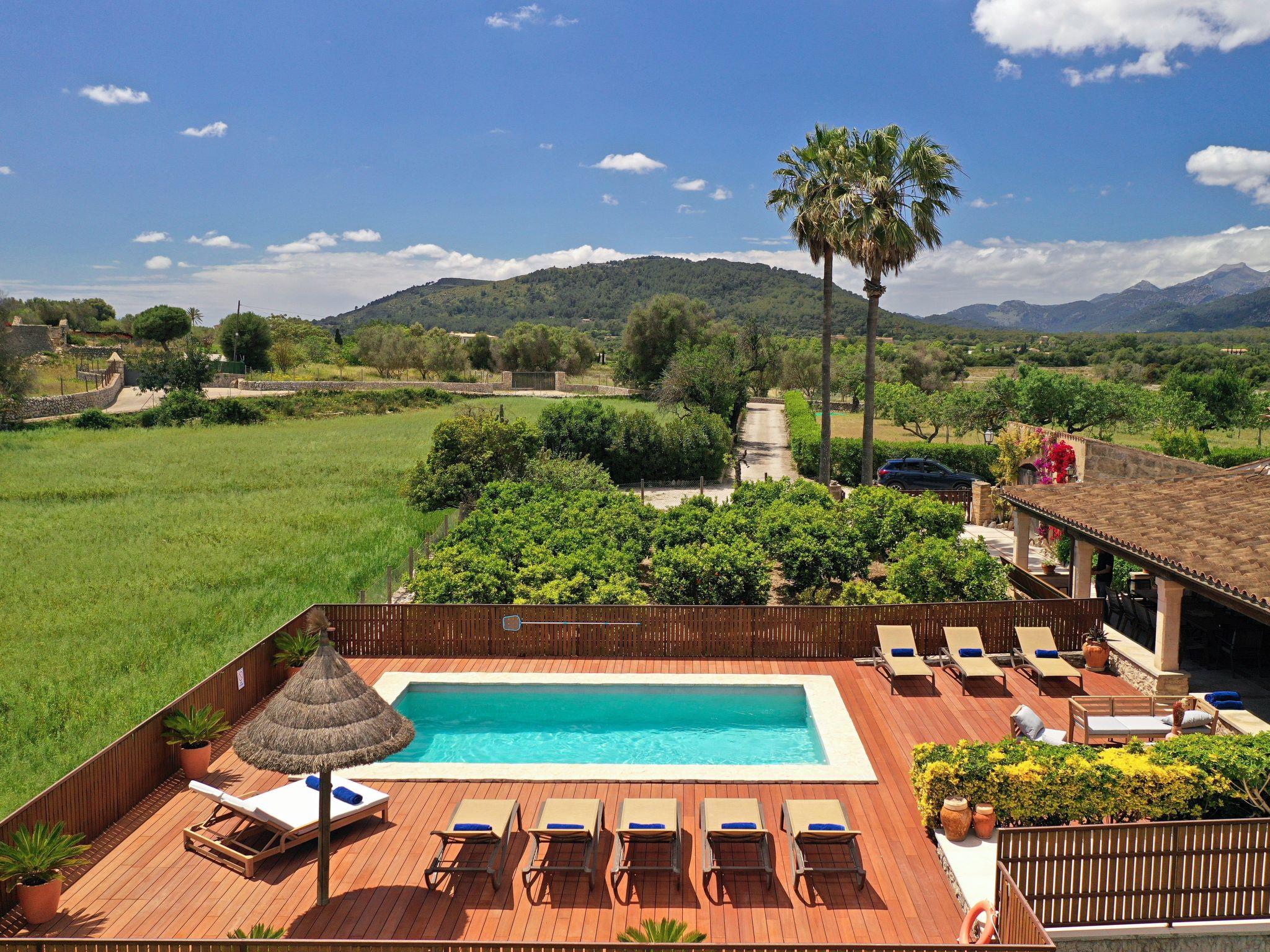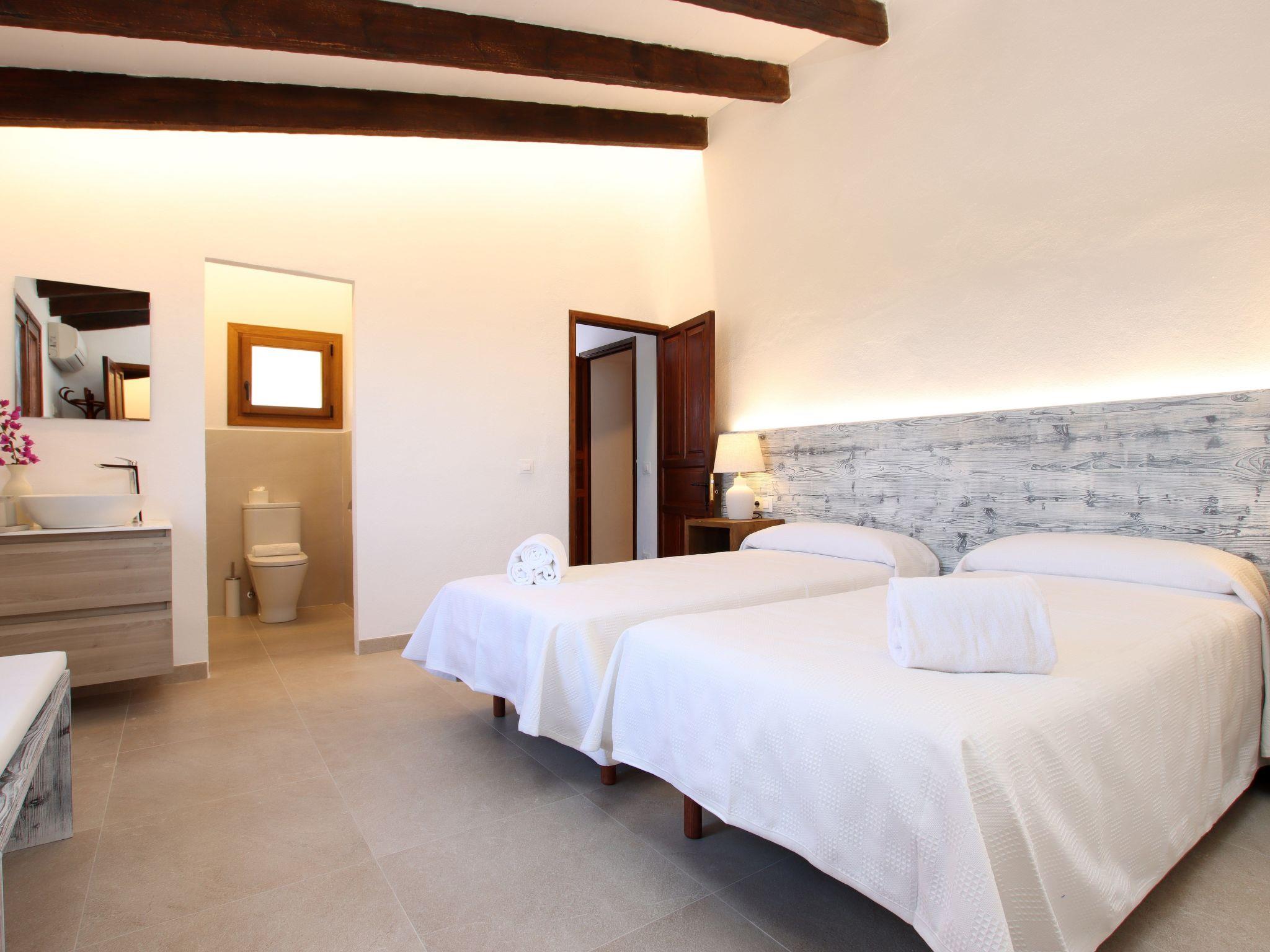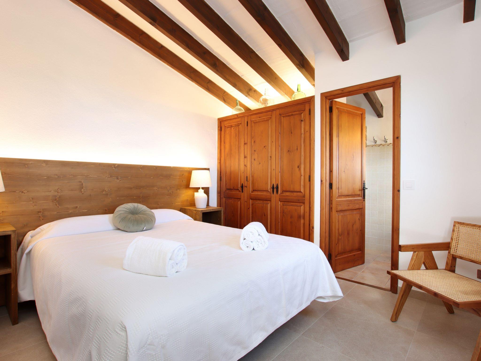 The interior of the villa has a welcoming hall and stairs leading to the upper floor. The interior is well equipped and perfectly combines modern comforts with traditional Mallorcan charm. There is a spacious living room equipped with a large sofa and plasma TV and a separate cosy reading area for your peace and quiet. In this part of the house there is also a spacious traditional kitchen equipped with modern appliances and a charming fireplace. A dining table offers ample space for family meals.