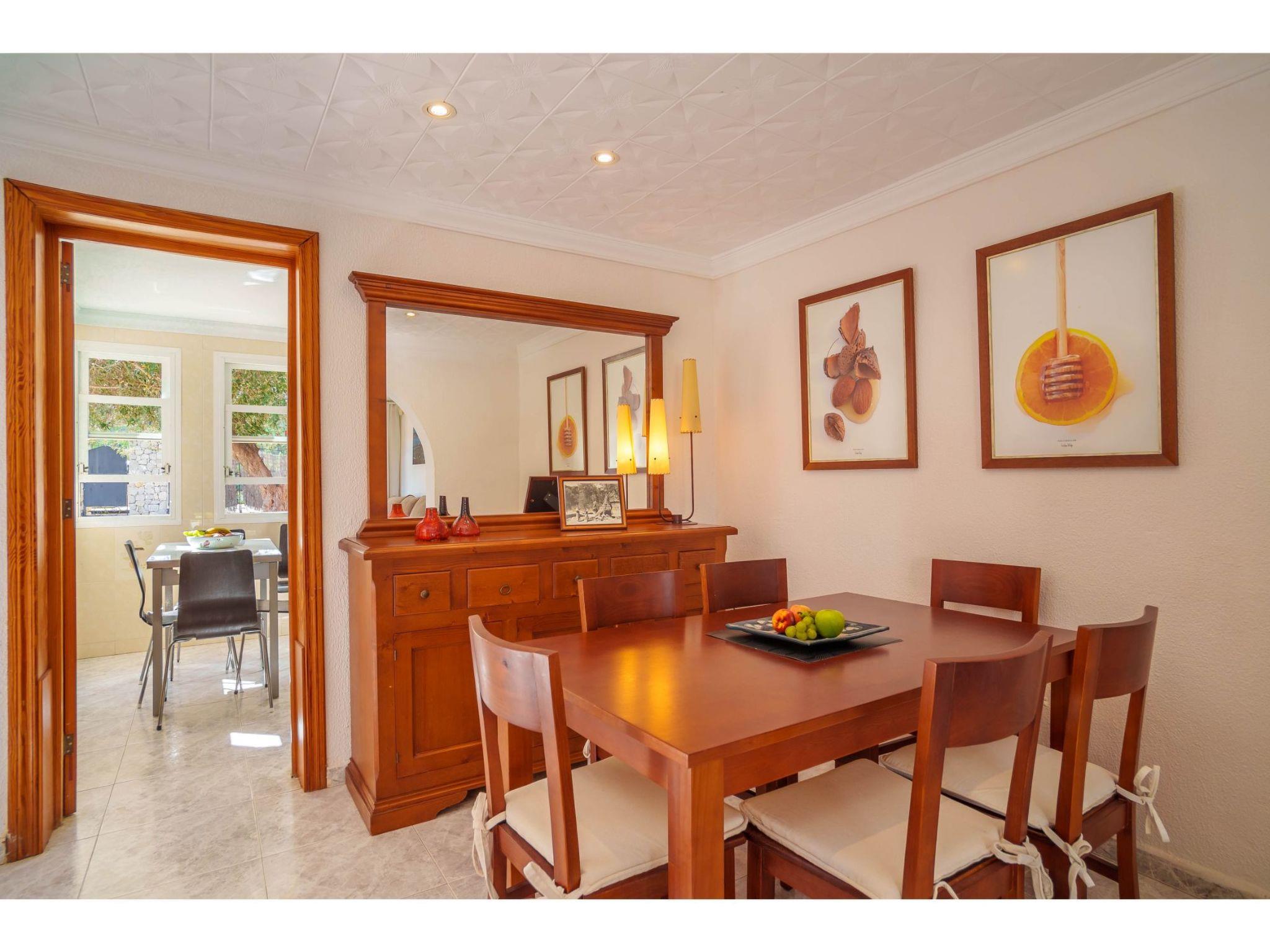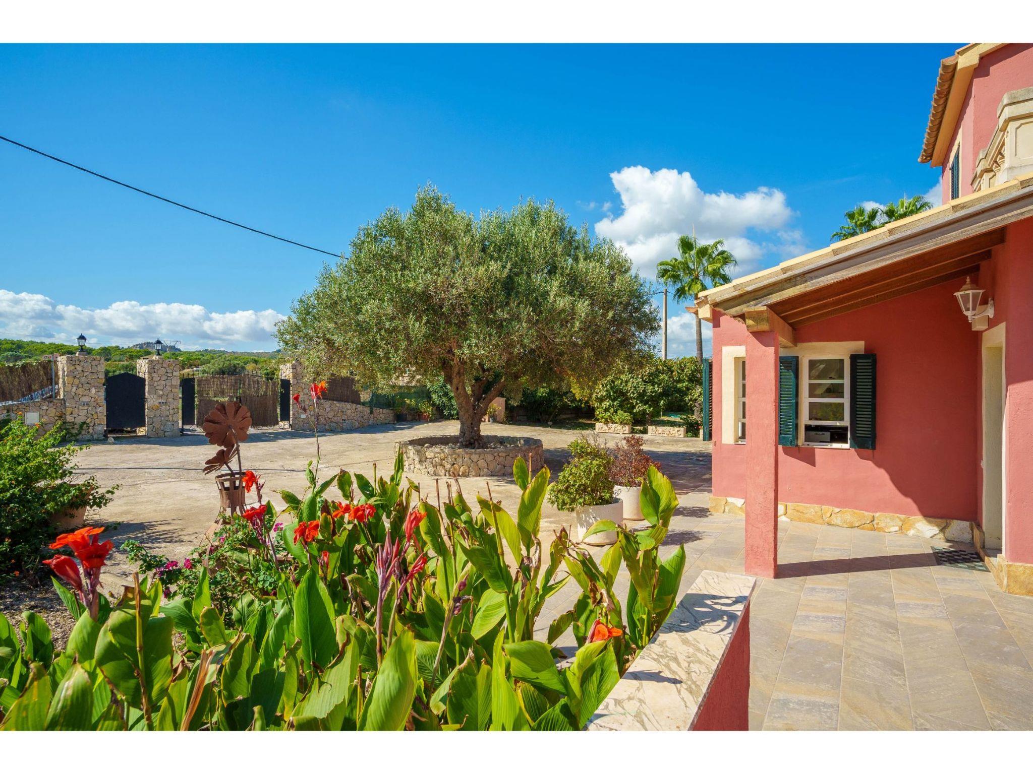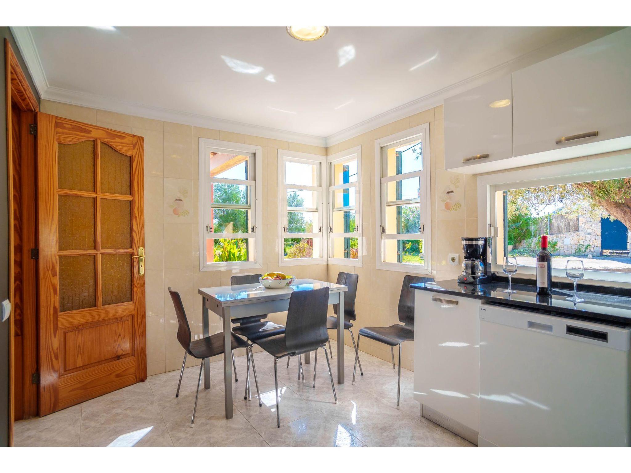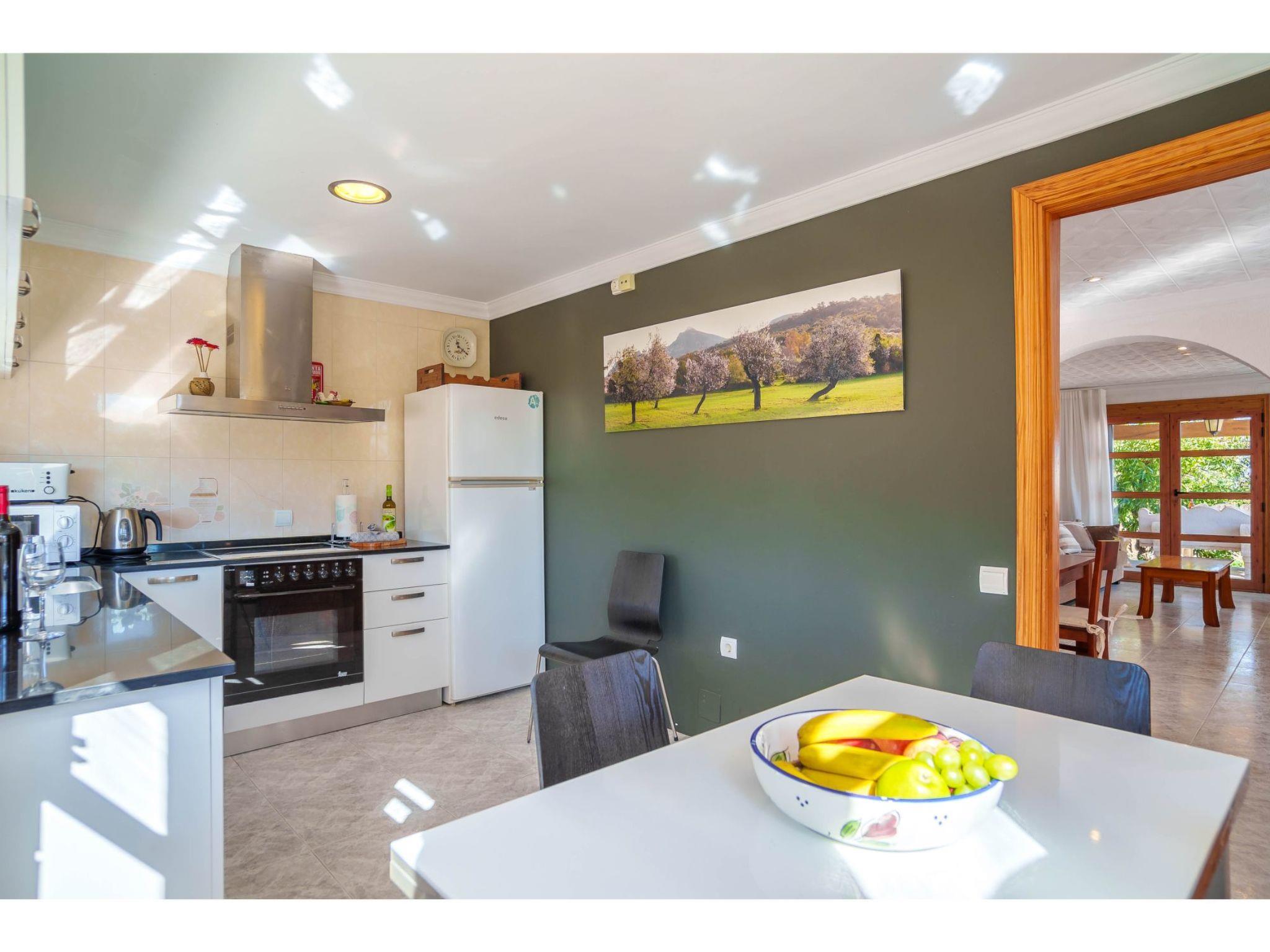 "Sa Olivera", 3-room house 80 m2 on 2 levels. Beautiful furnishings: living/dining room with dining table, satellite TV, digital TV, DVD, electric heating and air conditioning. Exit to the terrace. 1 room with 2 beds, electric heating and air conditioning. 1 room with 1 french bed (180 cm), electric heating and air conditioning. Kitchen (oven, dishwasher, 4 ceramic glass hob hotplates, toaster, kettle, microwave, freezer, electric coffee machine) with dining table. Bath/WC, shower/WC. Terrace 20 m2, roofed, terrace 15 m2. Terrace furniture, barbecue, deck chairs. Beautiful view of the garden. Facilities: washing machine, hair dryer. Internet (WiFi, free). Please note: non-smoking house. 2 extra beds in a separate “tower room”, accessible from outside. ET/2356 // Reg. Nr.: ESFCTU00000704300004275800000000000000000000ETV/23568