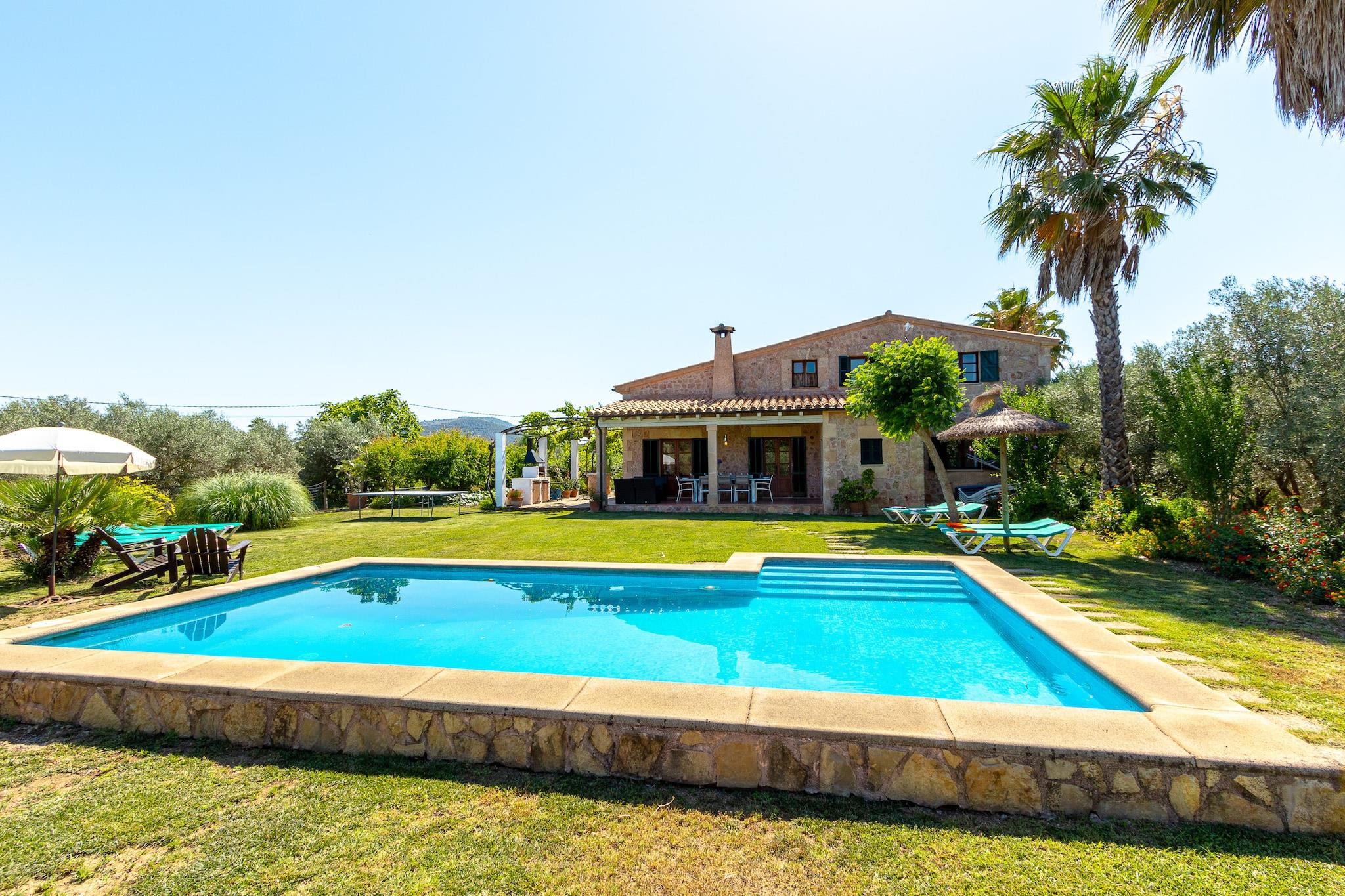 Denne romslige villaen har 4 komfortable soverom, med plass til opptil 8 gjester, og spenner over 200 m² med hjemmekoselig, godt designet plass. Det har et privat svømmebasseng omgitt av en hage, en 30 m² stor terrasse med utemøbler og en grill, noe som gjør det ideelt for å slappe av med familie eller venner. Villaen har klimaanlegg, satellitt-TV på flere språk og Wi-Fi på hele eiendommen. I tillegg er bekvemmeligheter som vaskemaskin, strykejern, hårføner, safe og peis tilgjengelig. Vær oppmerksom på at dette overnattingsstedet ikke er kjæledyrvennlig, noe som sikrer et rolig miljø for alle gjester. Denne villaen ligger i rolige landlige omgivelser, og har en perfekt beliggenhet for å utforske det beste av Alcudia. Den gylne sanden på Playa Puerto Alcudia ligger bare 2 km unna, mens den kjente klippestranden Aucanada og Club de Golf Alcanada er mindre enn 5 km unna. Familier vil sette pris på nærheten til Hidropark badeland, kun 4 km fra villaen, og naturelskere kan utforske den vakre Parc Natural de s'Albufera, som ligger 7 km unna. Villaen ligger også i nærheten av sjarmerende byer som Pollensa, 12 km unna, og har gode forbindelser til Aeropuerto Son San Joan, kun 61 km fra eiendommen. Villaens uavhengige kjøkken er fullt utstyrt med moderne apparater, inkludert kjøleskap, mikrobølgeovn, stekeovn, fryser, kaffemaskin og vannkoker, sammen med alt nødvendig servise og kjøkkenutstyr. Gjestene vil finne velutstyrte vaskerom, som sikrer komfort og bekvemmelighet under oppholdet.