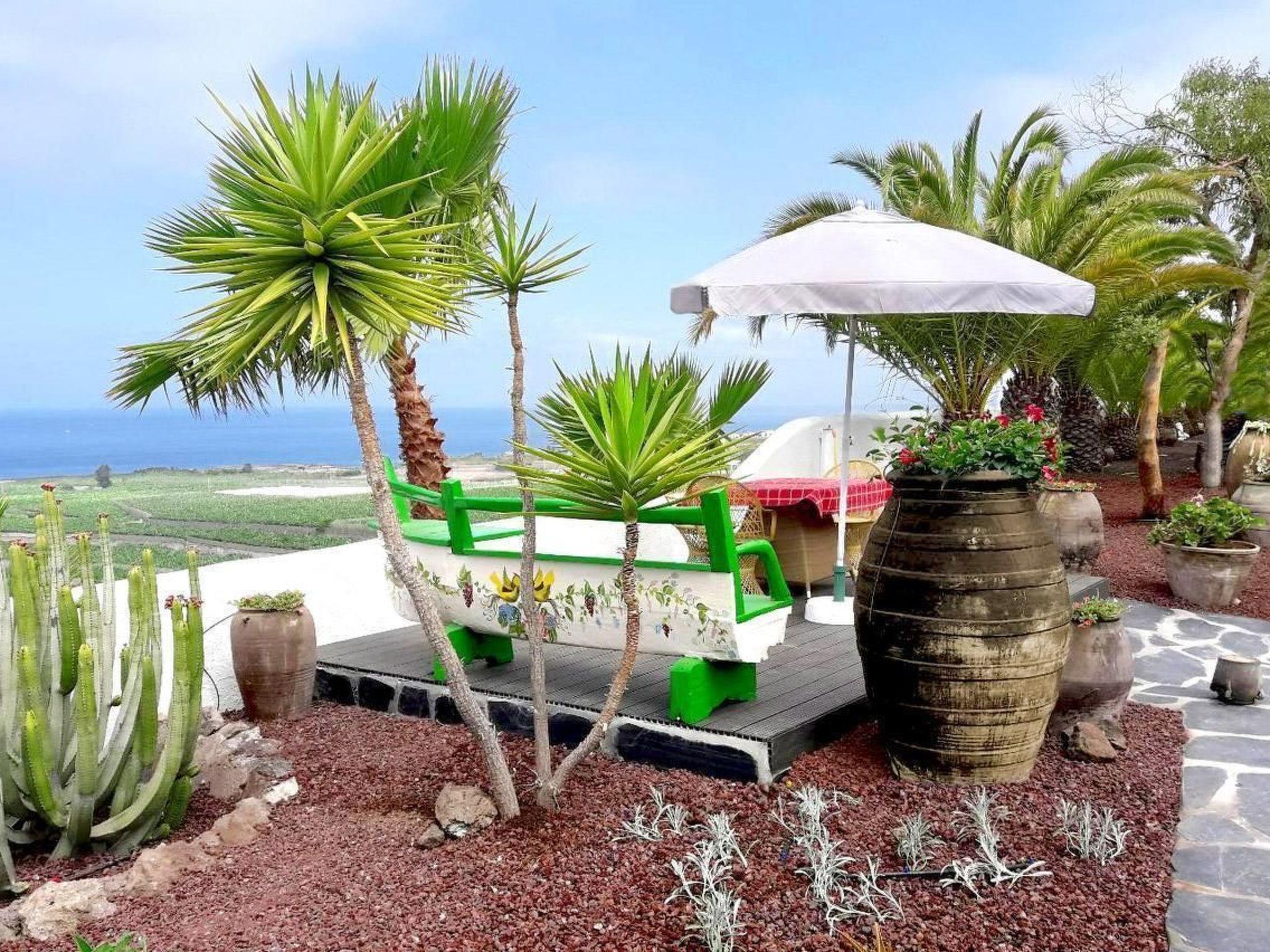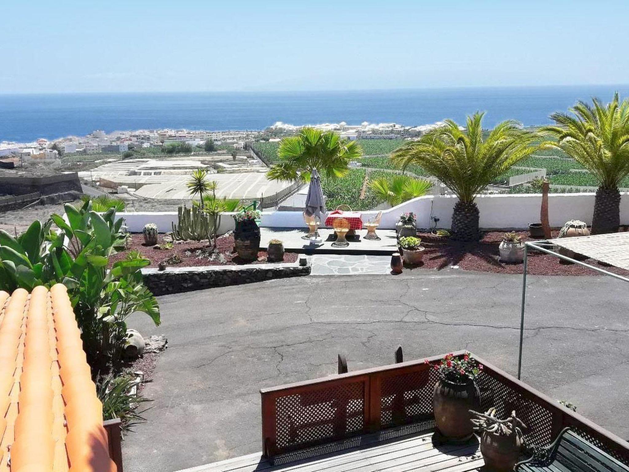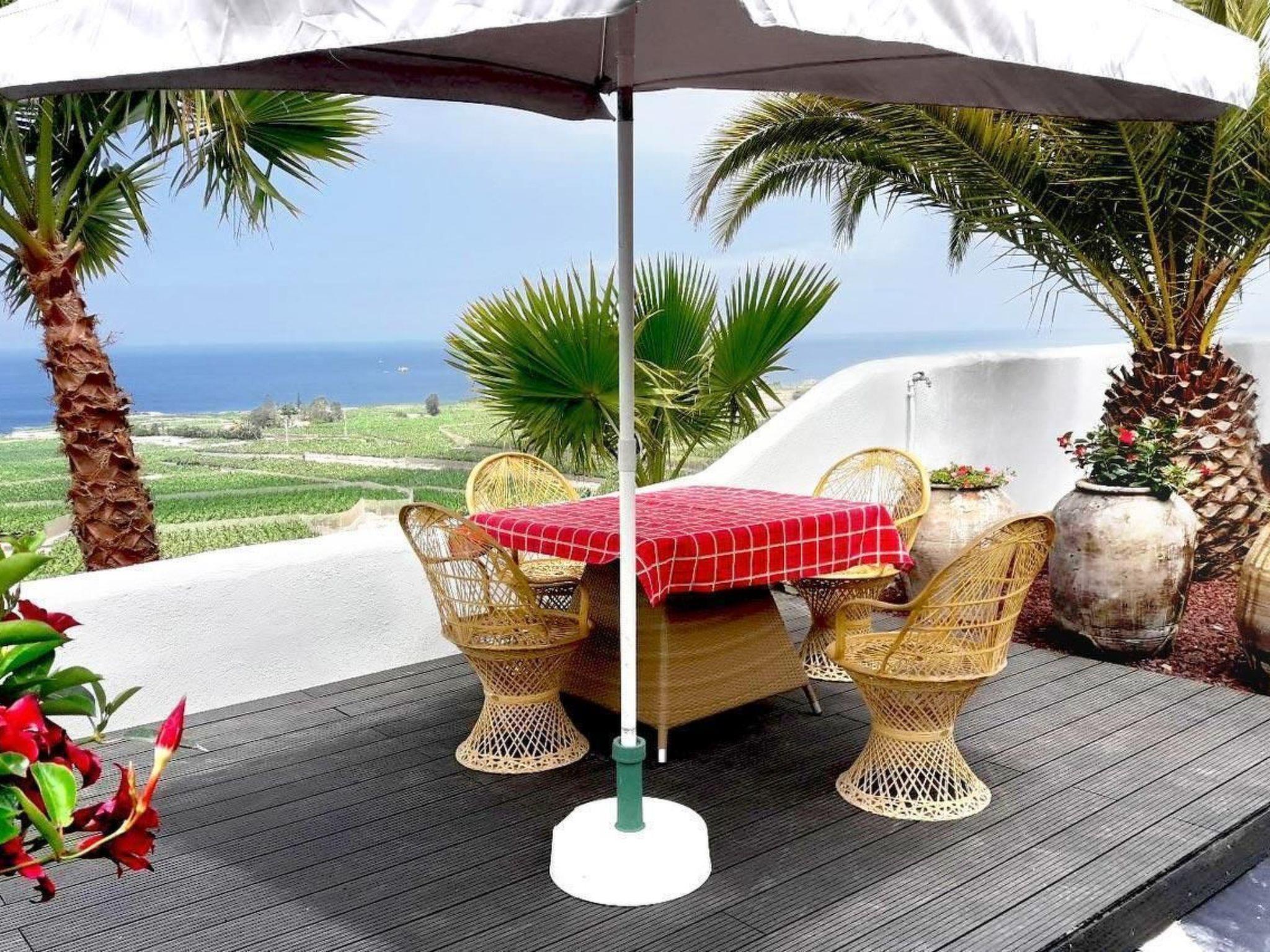 Outside, you will find a partially covered terrace in a sunny location, furnished with a table and four chairs, two sun loungers and a parasol. Here you can leave everyday life behind you and enjoy the sun and the breathtaking 180° view over the impressive landscape of Tenerife to the Atlantic Ocean in total discretion.
