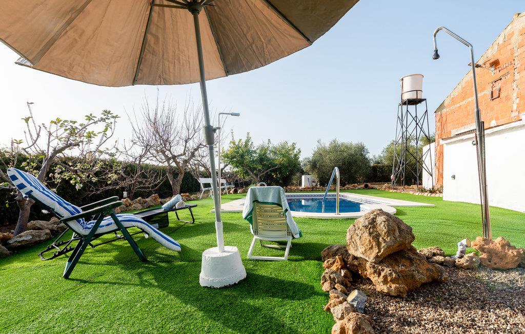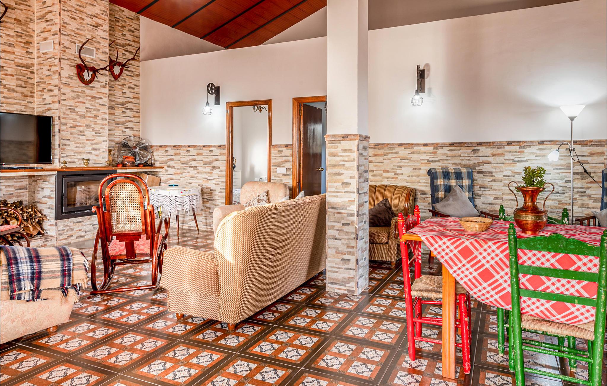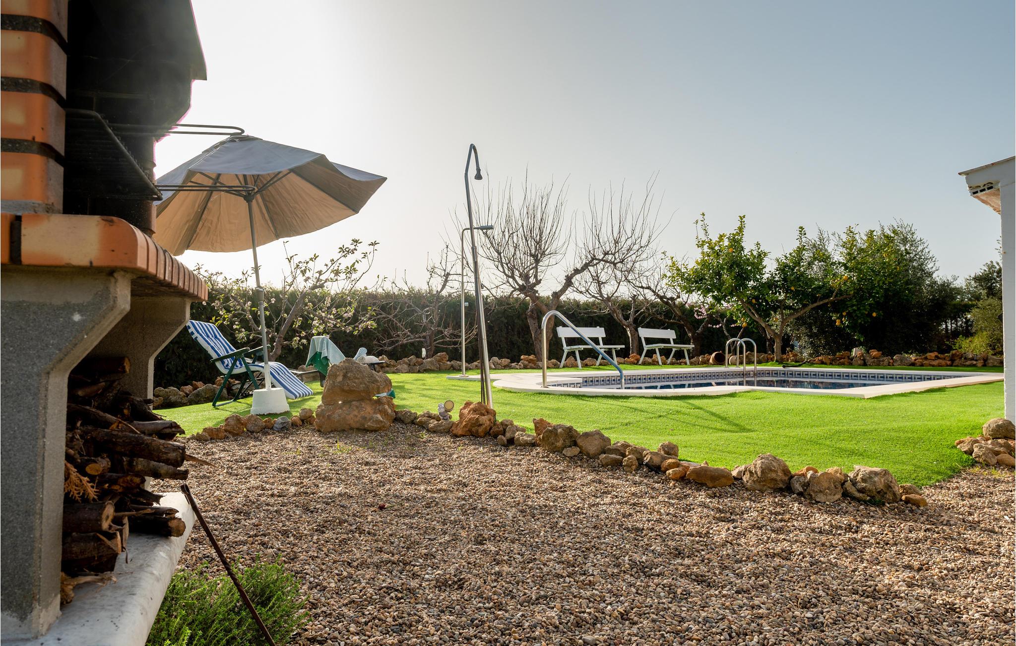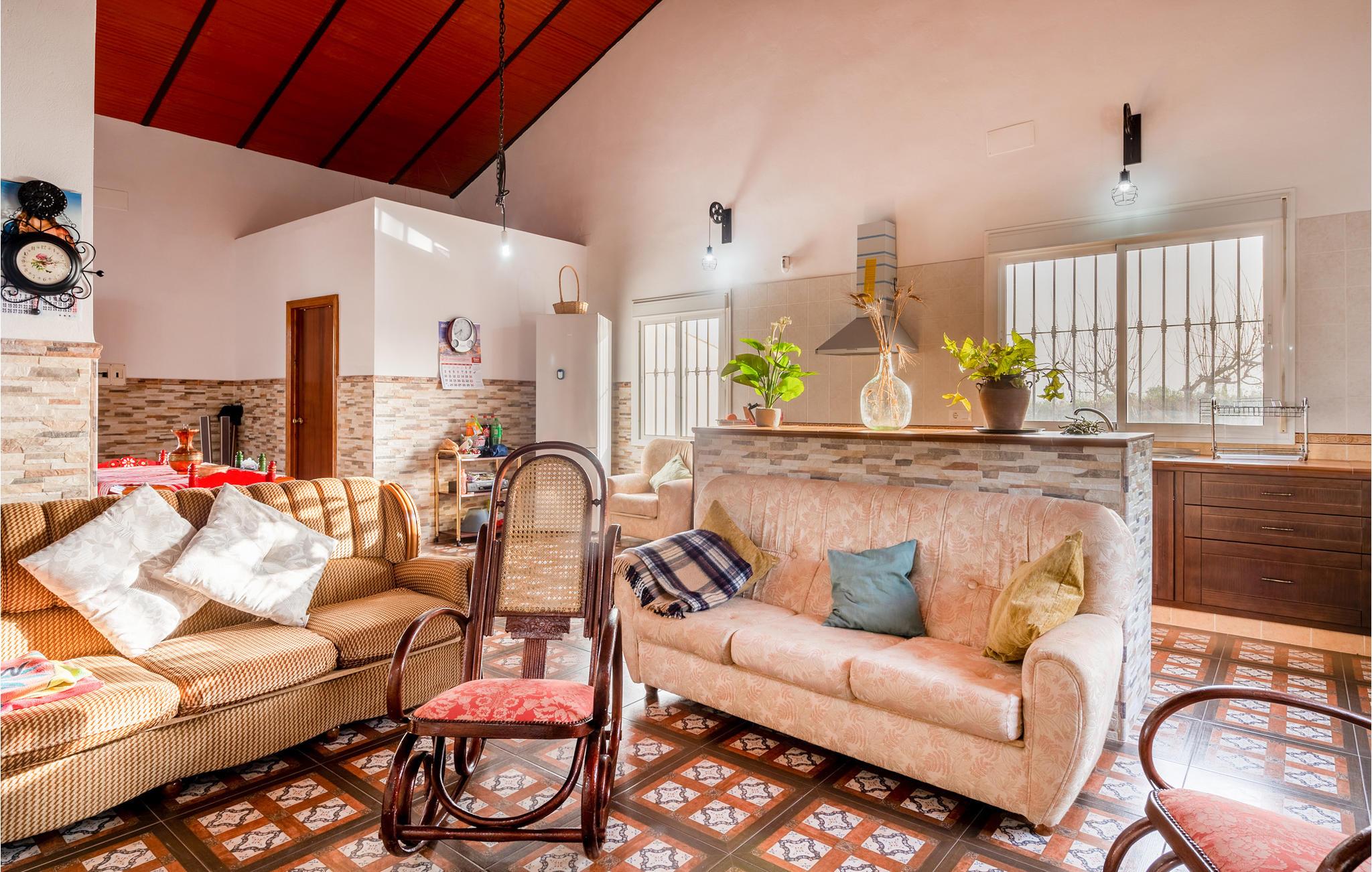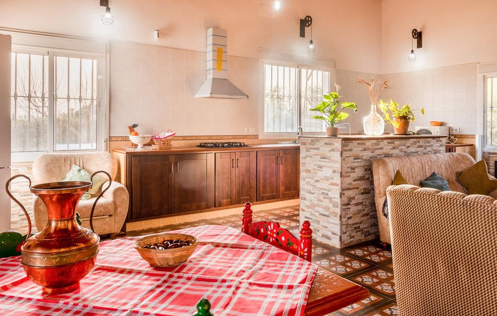 Gå inn i en utrolig romslig stue, hvor det velutstyrte kjøkkenet, stuen med komfortable møbler og spisestuen er koblet sammen. Kunstneriske fliser pryder hele gulvet i huset, samt møbler i rustikk og antikvarisk stil. Dette enetasjes huset gir deg nok plass til å virkelig føle deg hjemme. Du vil også ha tilgang til en stor tomt, med et grønt område, en solterrasse med privat basseng og noen komfortable solsenger slik at du kan lene deg tilbake og slappe av i varmen fra strålene. Videre kan du også møte sammen med dine kjære på utendørs verandaen og nyte frokosten, samt morgenkaffen og alt med sin tid og med fred og ro.