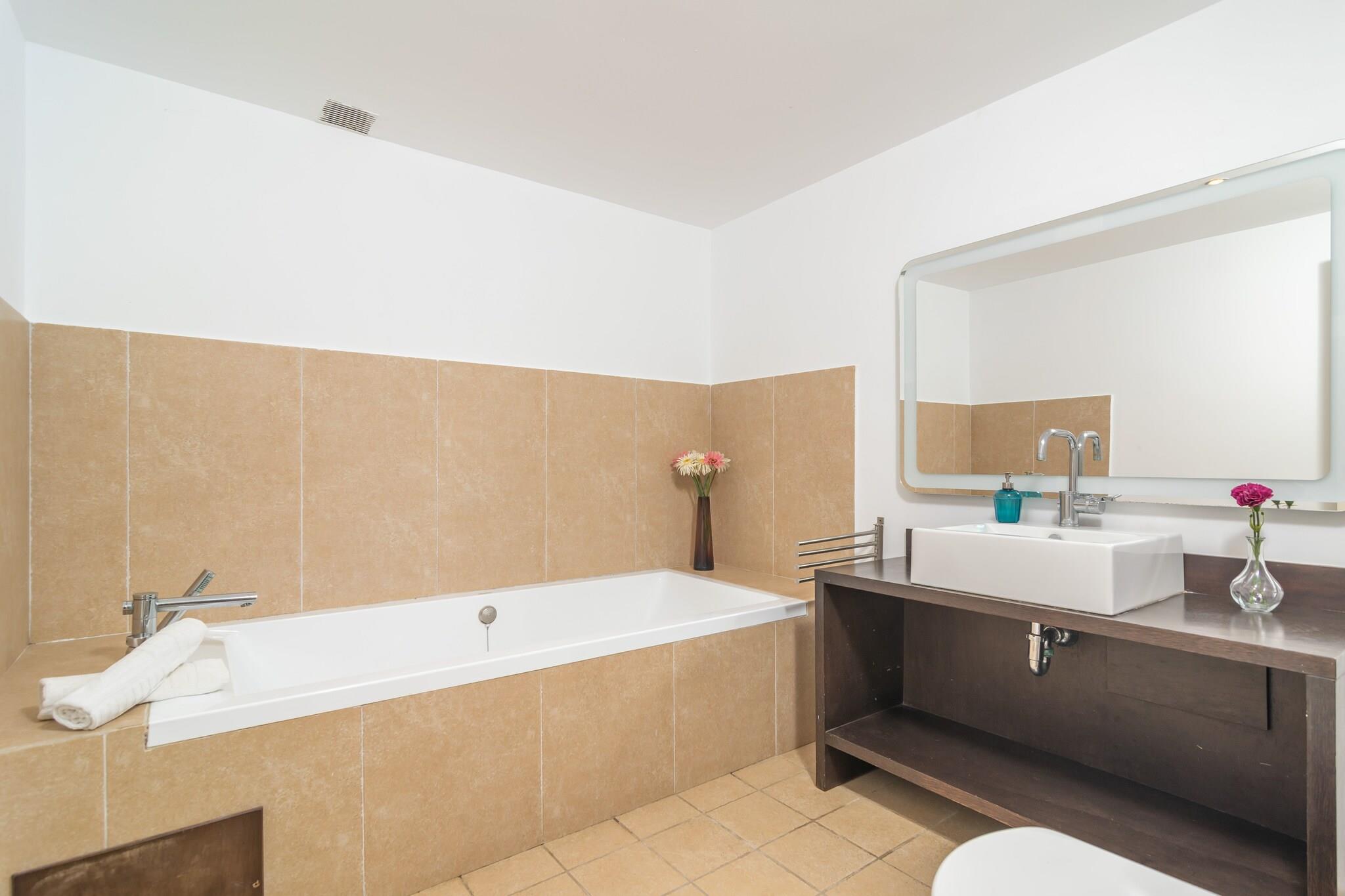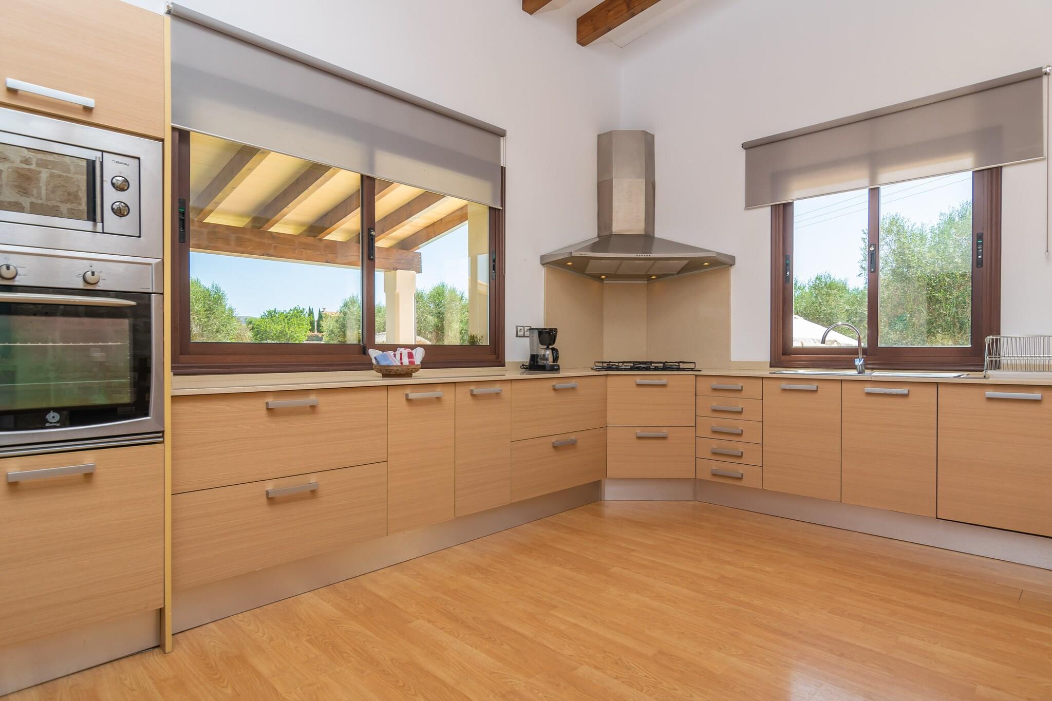 Kjøkken(komfyr, kaffetrakter), soveværelse(2x enkeltseng), soveværelse(enkeltseng, enkeltseng), soveværelse(dobbeltseng), soveværelse(dobbeltseng), bad, bad, stekovn, mikrobølgeovn, oppvaskmaskin, kjøleskap med fryser, badekar, dusj, håndvask, håndvask, toalett, toalett, klimaanlegg, klimaanlegg, klimaanlegg, klimaanlegg, hage, hagemøbler, 8x solsenge, grill, 2x Parasoll, svømmebasseng, babyseng/sprinkelseng, høy barnestol