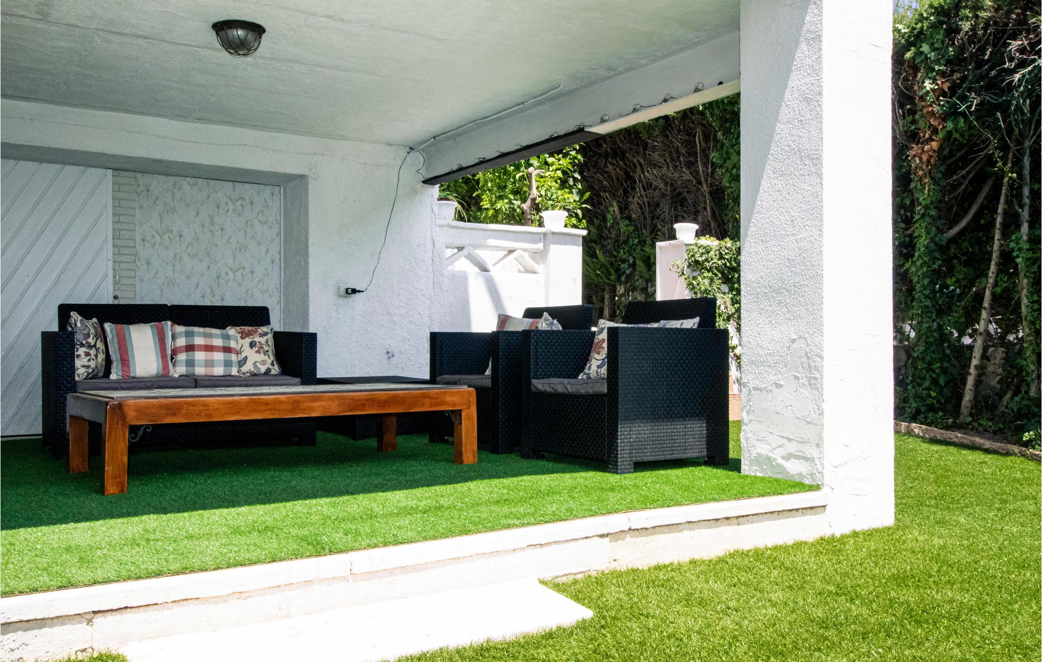 Slapp av på den overbygde terrassen og forfrisk deg i bassenget.