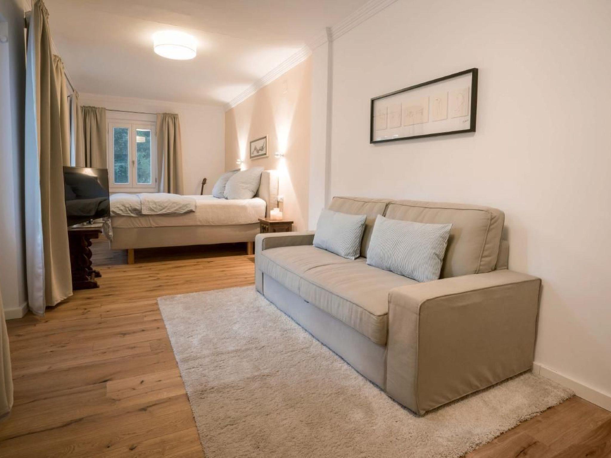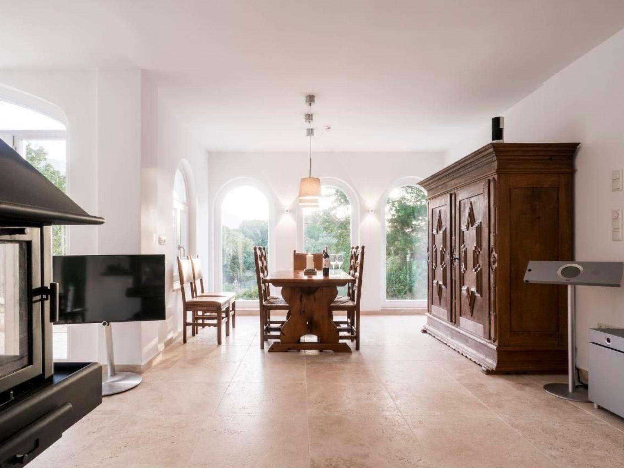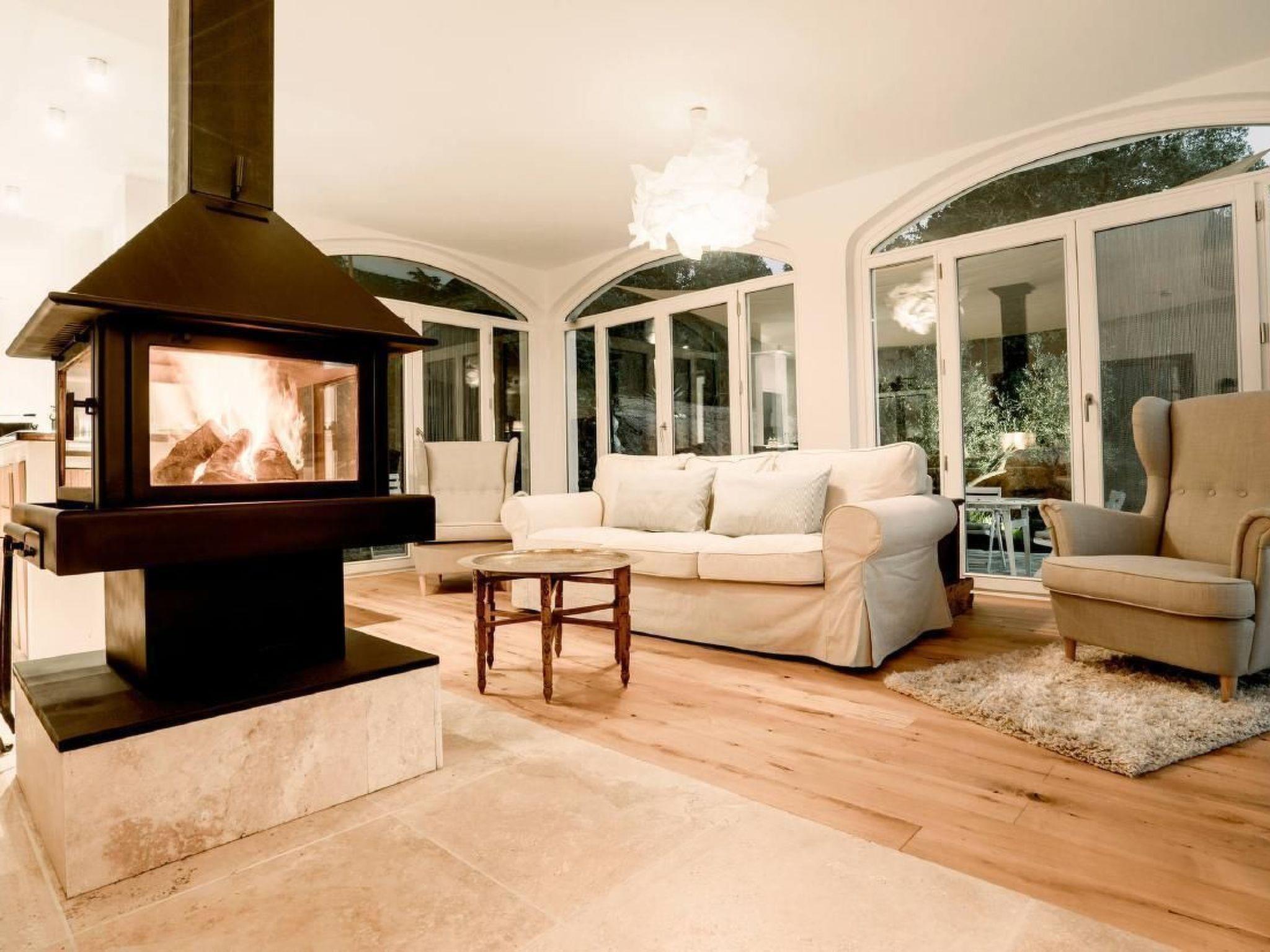 In the spacious living area with open-plan kitchen and seating for up to 8 people, glass doors lead to the terrace, where you can enjoy a delicious breakfast and the view in the morning. The living room with high-quality furnishings such as air conditioning, free-standing fireplace, underfloor heating, seating area, satellite TV, designer stereo system, brick-built kitchen with the latest Siemens electrical appliances, side-by-side fridge incl. ice crusher, water dispenser and screen, access to the terrace and garden.