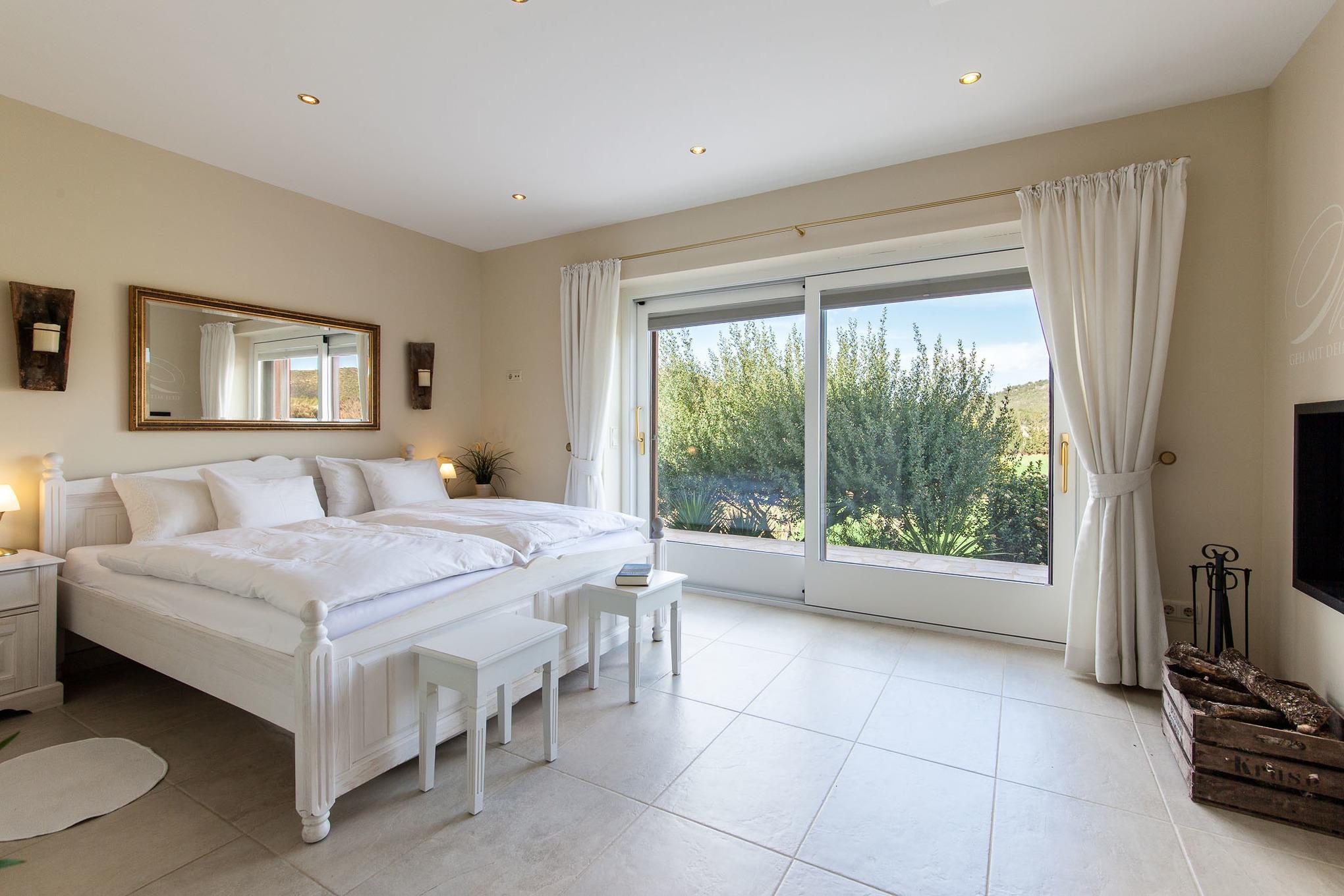 Das Hauptschlafzimmer mit Panoramablick über die Natur einem Flat TV und einem Tunnelkamin am Fussende bietet Gemütlichkeit pur.