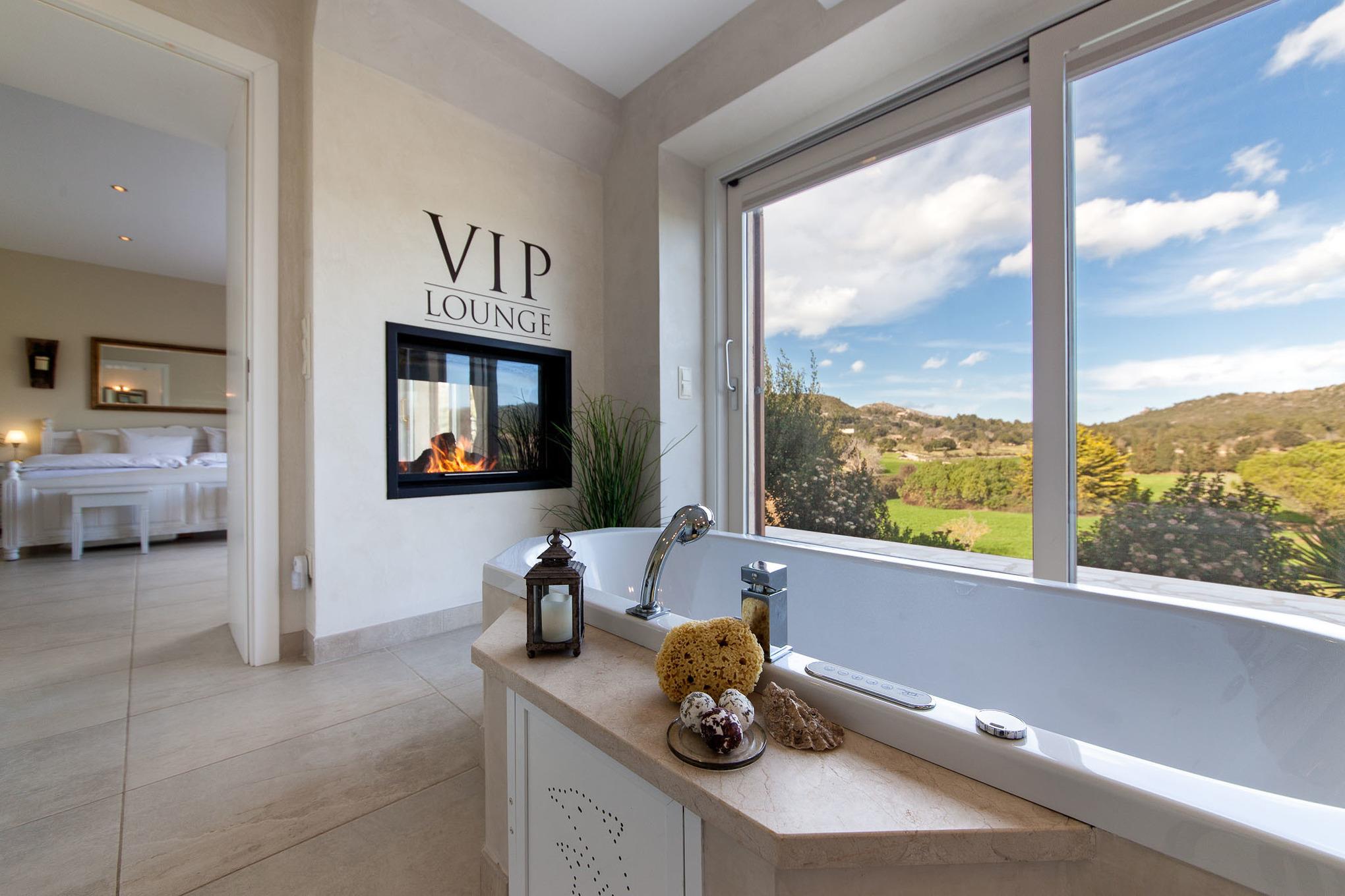 Das angrenzende Badezimmer mit freistehender Badewanne, Kamin, WC, Waschbecken mit hochwertigen Tischlereinbauten und großzügiger, ebenerdiger Dusche mit traumhaftem Blick ist einfach großartig..