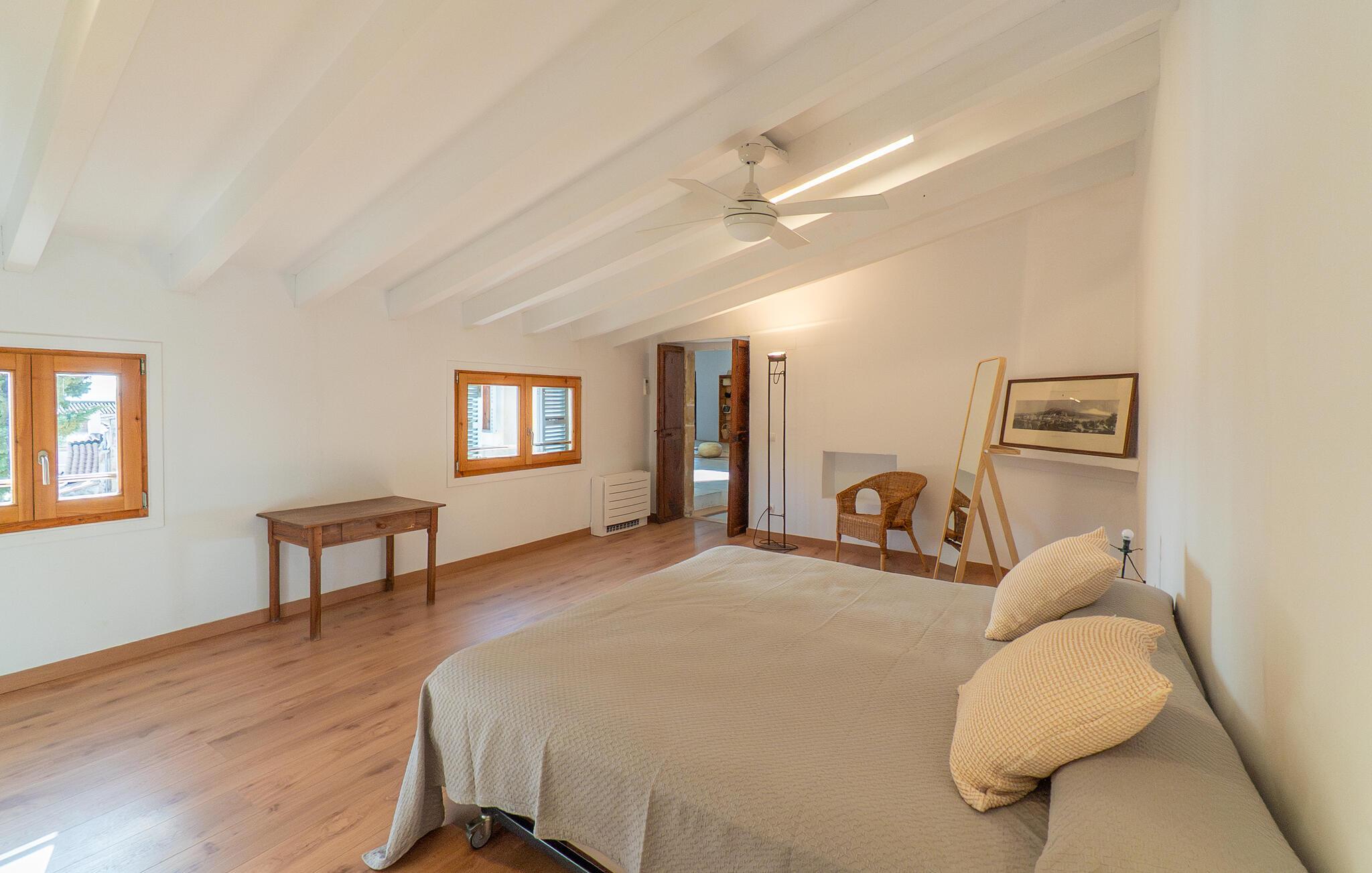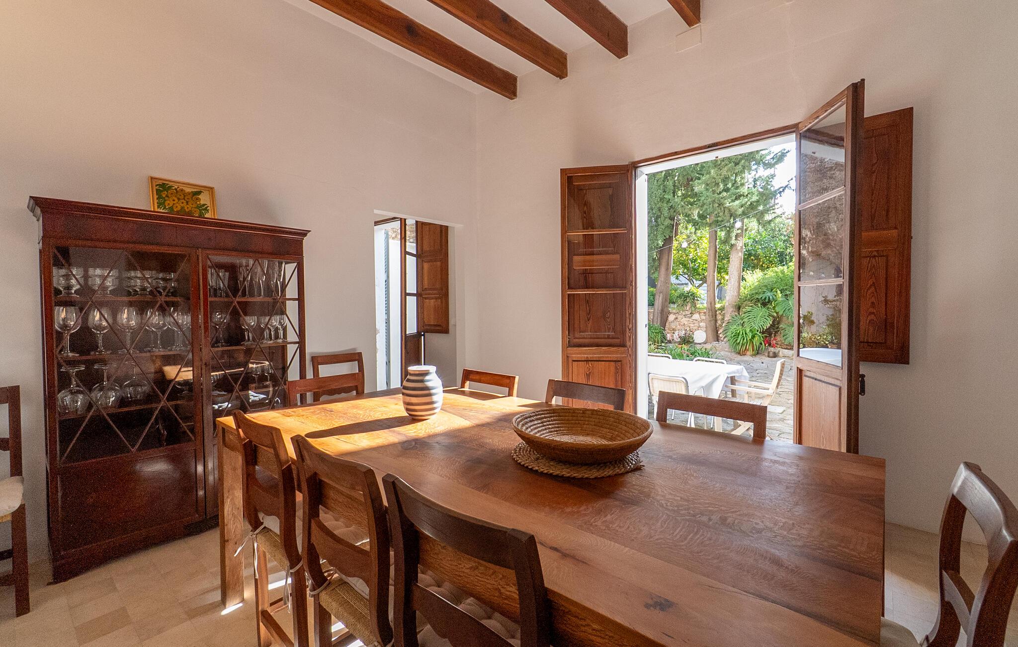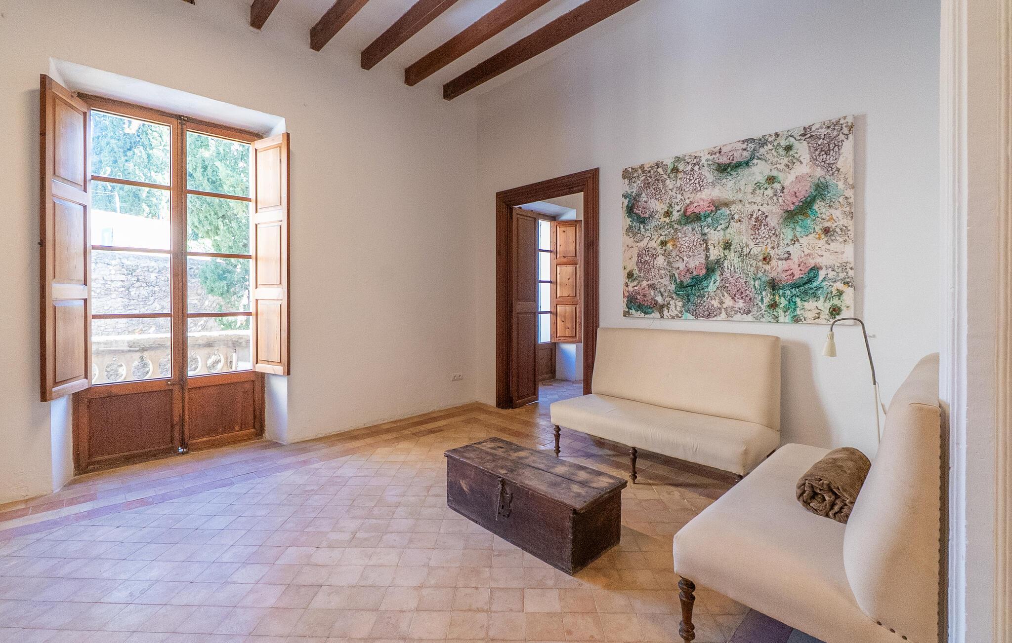 Nyt et uforglemmelig opphold i dette stilfulle feriehuset på Mallorca. Omgitt av en vakker hage, tilbyr dette huset historisk stil og moderne komfort. Stig inn i det elegante interiøret med stor takhøyde, synlige trebjelker og stilfulle møbler. Finn deg til rette i de romslige oppholdsrommene og slapp av i den store sofaen. Det romslige kjøkkenet inviterer dere til å tilberede regionale spesialiteter sammen. Bruk de mange store områdene i huset til morgenyogaøvelsene dine.