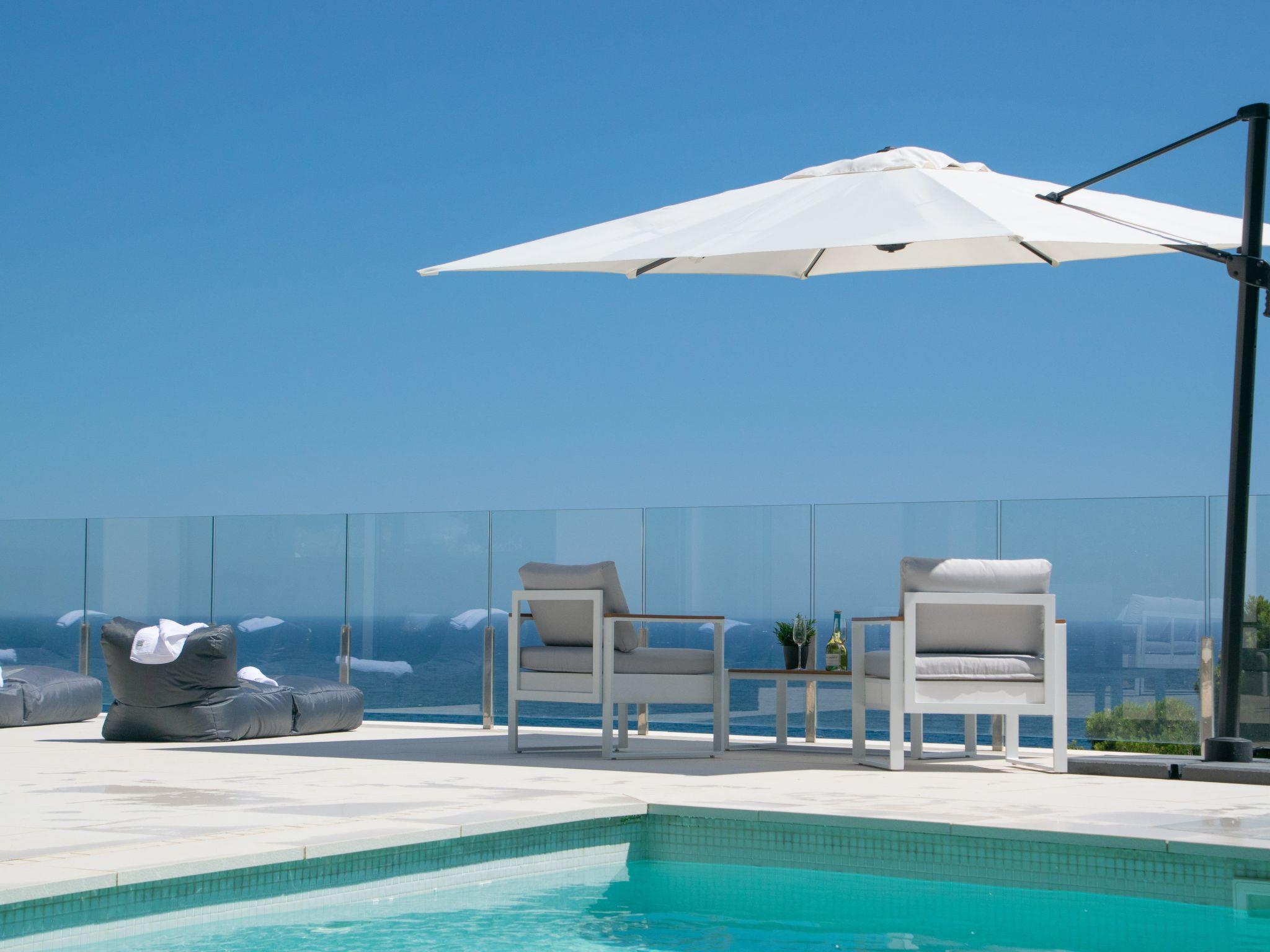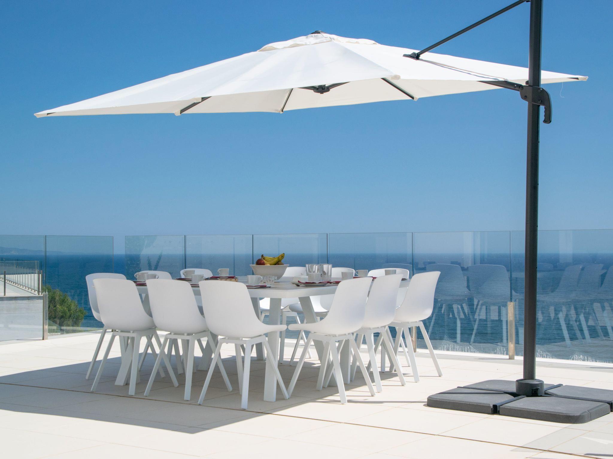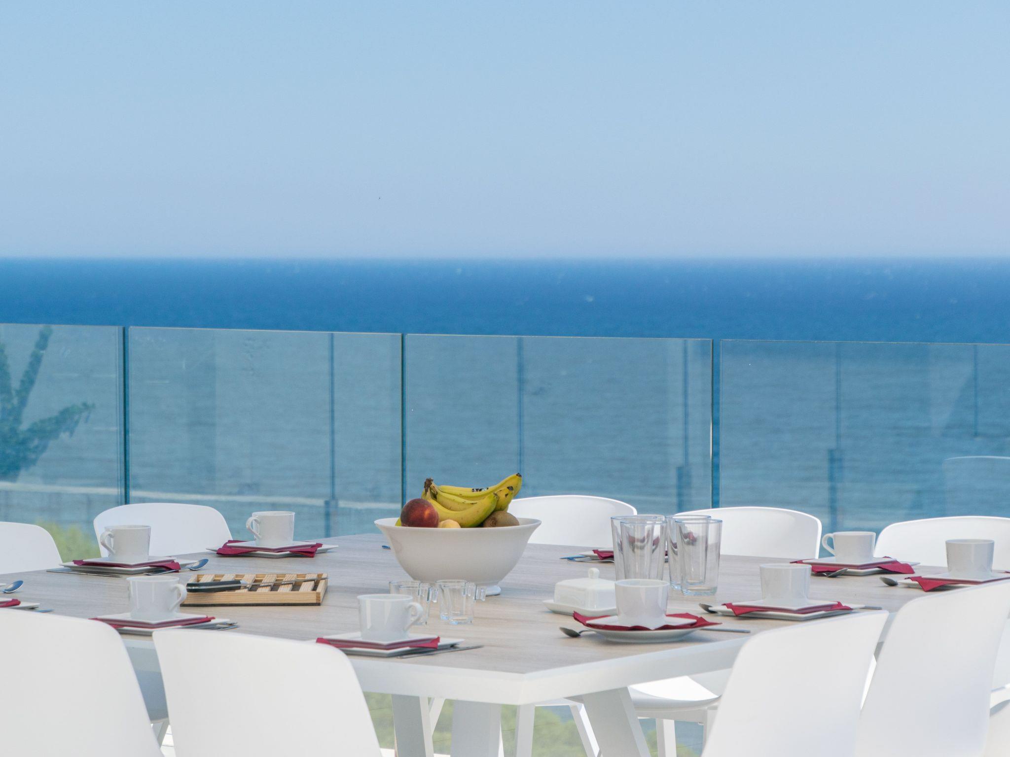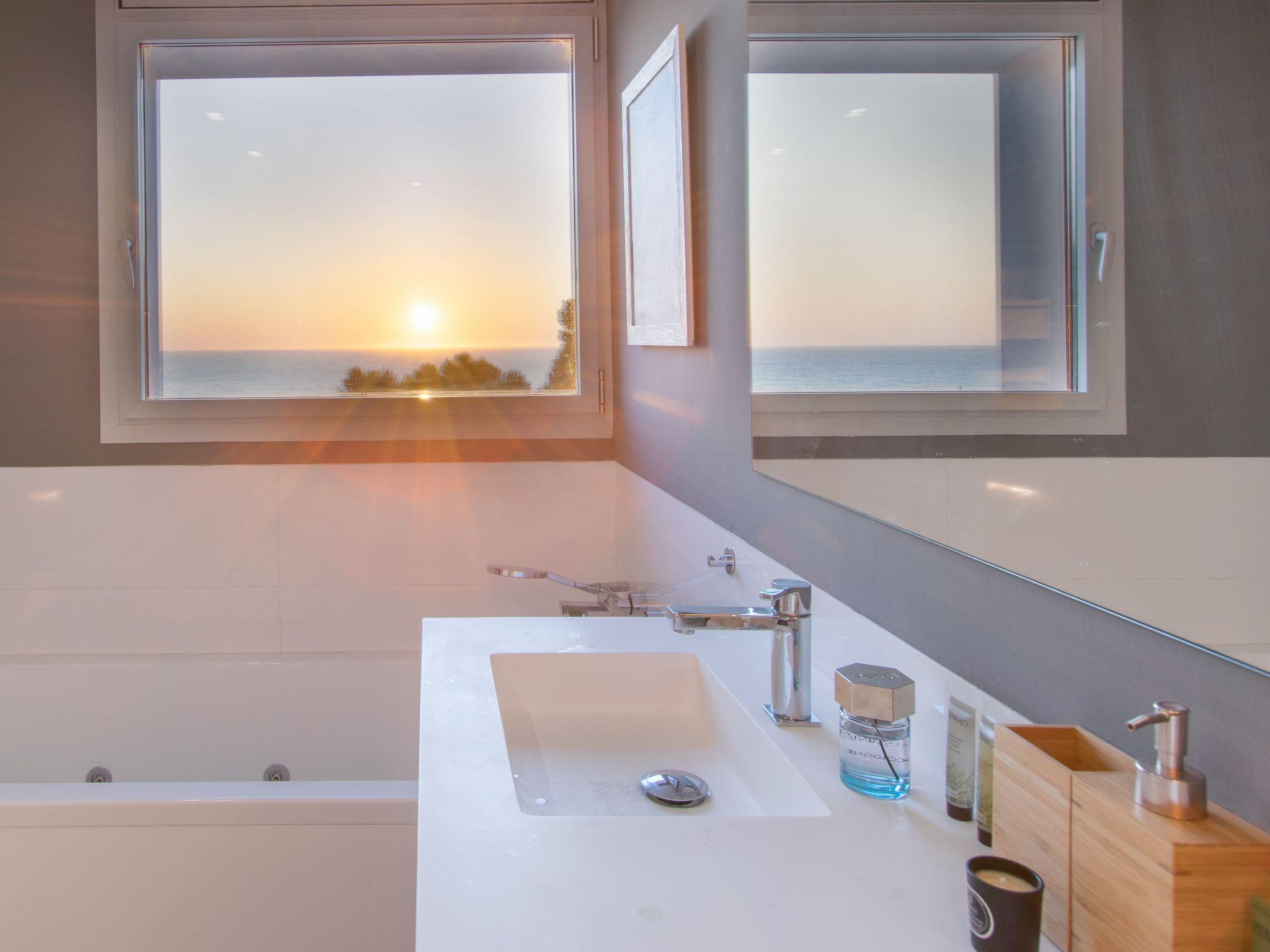 As soon as you enter the house, you will enjoy an exceptional view of the sea. As you go down one floor, you will find on your right the dining room with an oak table for 12 people, then the living room with its sofas and big screen TV. On the left there is a toilet and a large, fully-equipped kitchen with a central island, double fridge, microwave and traditional oven, dishwasher, Nespresso, and a dining table. All the rooms have sea views and direct access to the terrace of over 120m2. A garden table and 12 chairs await you to enjoy this space facing the sea. The swimming pool is to the right of the terrace, out of sight. Fatboy sun loungers allow you to enjoy the space around the pool.