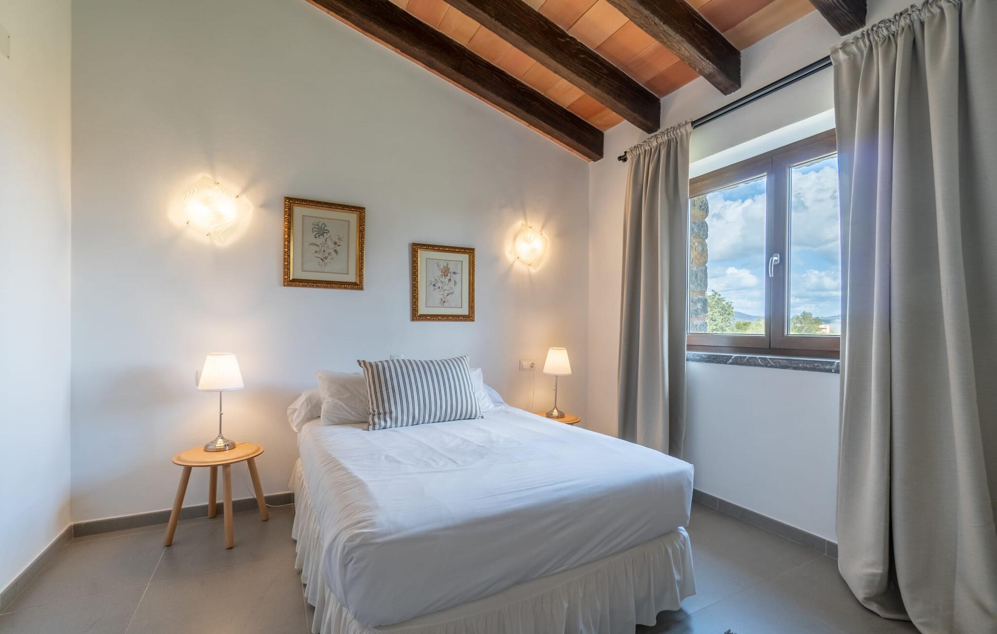Stuen i første etasje imponerer med sin originale arkitektur og sofistikerte rominndeling. Den åpne stue-/spisestuen danner midtpunktet mellom to symmetrisk plasserte fløyer. Den koselige atmosfæren preges av stor takhøyde, en høy vegg av naturstein, rikelig med naturlig dagslys og smakfulle møbler. Det moderne, romslige kjøkkenet ligger i en av fløyene, adskilt fra oppholdsrommet og er utstyrt med høy standard. Hver fløy rommer to romslige soverom med dobbeltseng og stor takhøyde, samt et bad. Det er også en garasje i den ene fløyen. Fincaen har stabil WiFi, godt mobildekning og er ideell for hjemmekontor. Finca Bellpuig ligger ca. 150 meter fra landeveien Ma-15, så bilstøyen er hørbar her og der. Samtidig gjør de gode forbindelsene det mulig med spontane turer til stranden og shoppingturer.