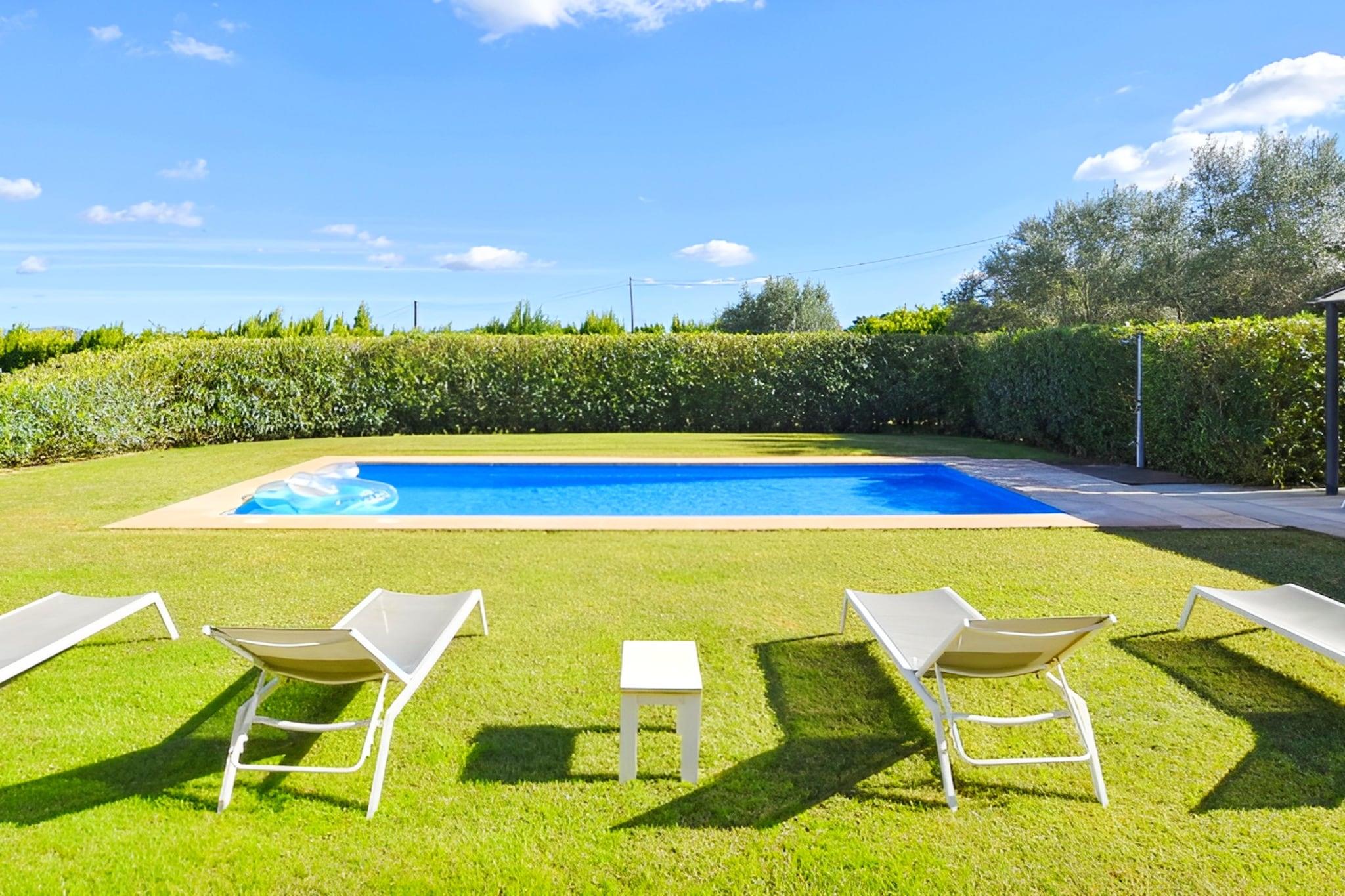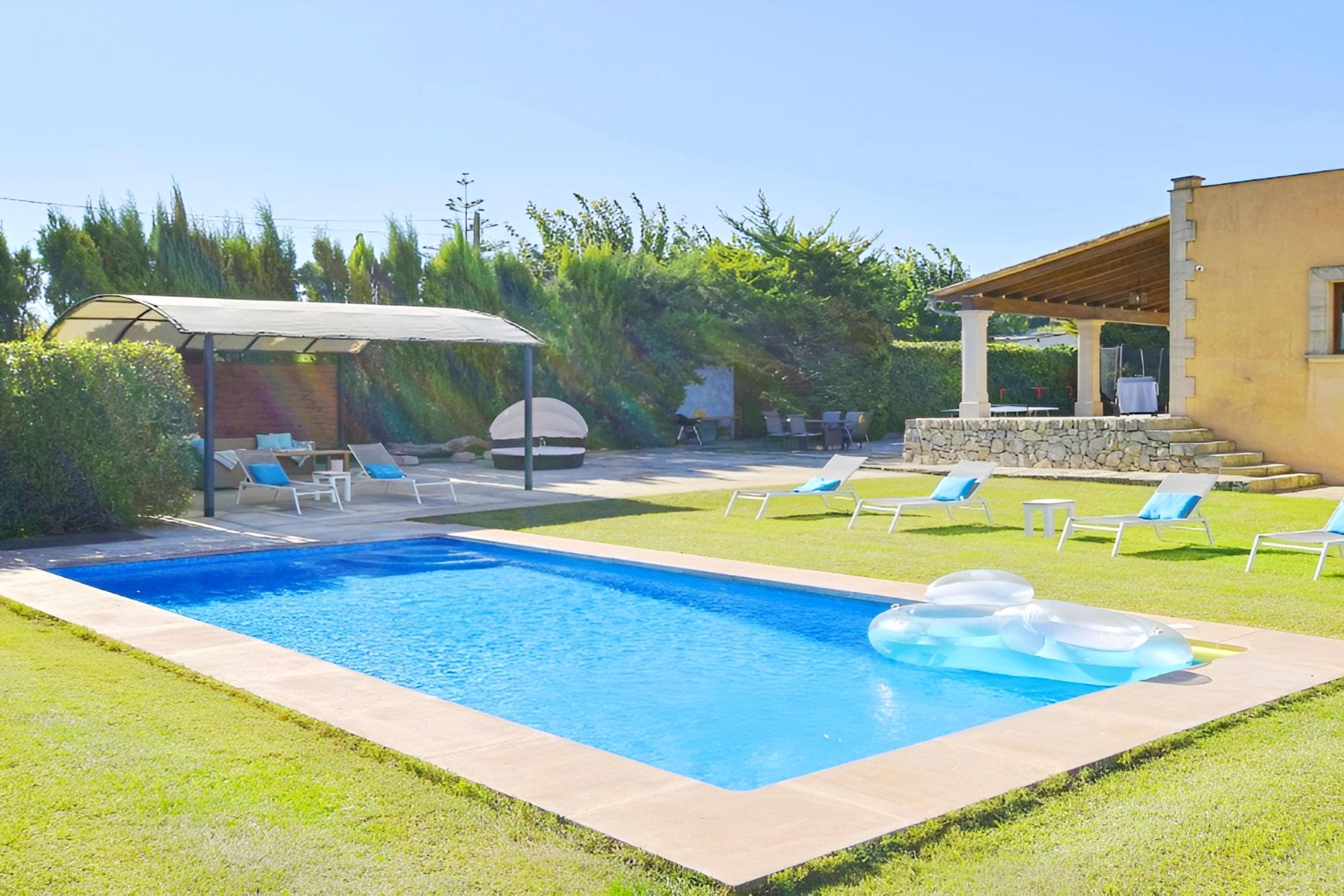 Dette sjarmerende landlige hjemmet er omgitt av åpent landskap nær Manacor, og tilbyr et fredelig tilfluktssted for opptil seks gjester som søker avslapning vekk fra de travle kystferiestedene på Mallorca. Det er perfekt for familier eller små grupper, og byr på rolige omgivelser samtidig som det holder seg beleilig nær lokale fasiliteter og det berømte Rafa Nadal-akademiet, noe som gjør det til et utmerket utgangspunkt for både fritidsopphold og aktivitetsfokuserte besøk. Innvendig har eiendommen tre komfortable soverom som er innredet for å imøtekomme fleksible sovebehov for gruppeopphold. Den lyse stuen inkluderer en sittegruppe med TV for avslappende kvelder innendørs etter en dag med utforsking av øya. Et fullt utstyrt kjøkken inkluderer kjøleskap, stekeovn, komfyrtopp, mikrobølgeovn, oppvaskmaskin og viktige kokekar, slik at gjestene enkelt kan tilberede måltider under hele oppholdet. Klimaanlegg er tilgjengelig i utvalgte rom, noe som bidrar til å opprettholde komforten i de varmere sommermånedene, mens Wi-Fi-tilkobling støtter hverdagens bekvemmelighet. Badene har både dusj og badekar, noe som er praktisk etter strandturer eller turer på landet. Gjestene kan gå ut på en privat terrasse med utsikt over de omkringliggende hagene, noe som skaper en ideell setting for delte måltider eller rolig hvile. Et privat svømmebasseng innbyr til forfriskende dukkerter hele dagen, mens uteservering og grillområde gjør det enkelt å nyte utendørs servering. Privat parkering på stedet er også tilgjengelig for ekstra bekvemmelighet ved ankomst. Dette landets hjem ligger i kort kjøreavstand fra Manacors butikker, restauranter og sandstrender, og tilbyr muligheter for å utforske Mallorcas naturlandskap og kulturelle høydepunkter året rundt.