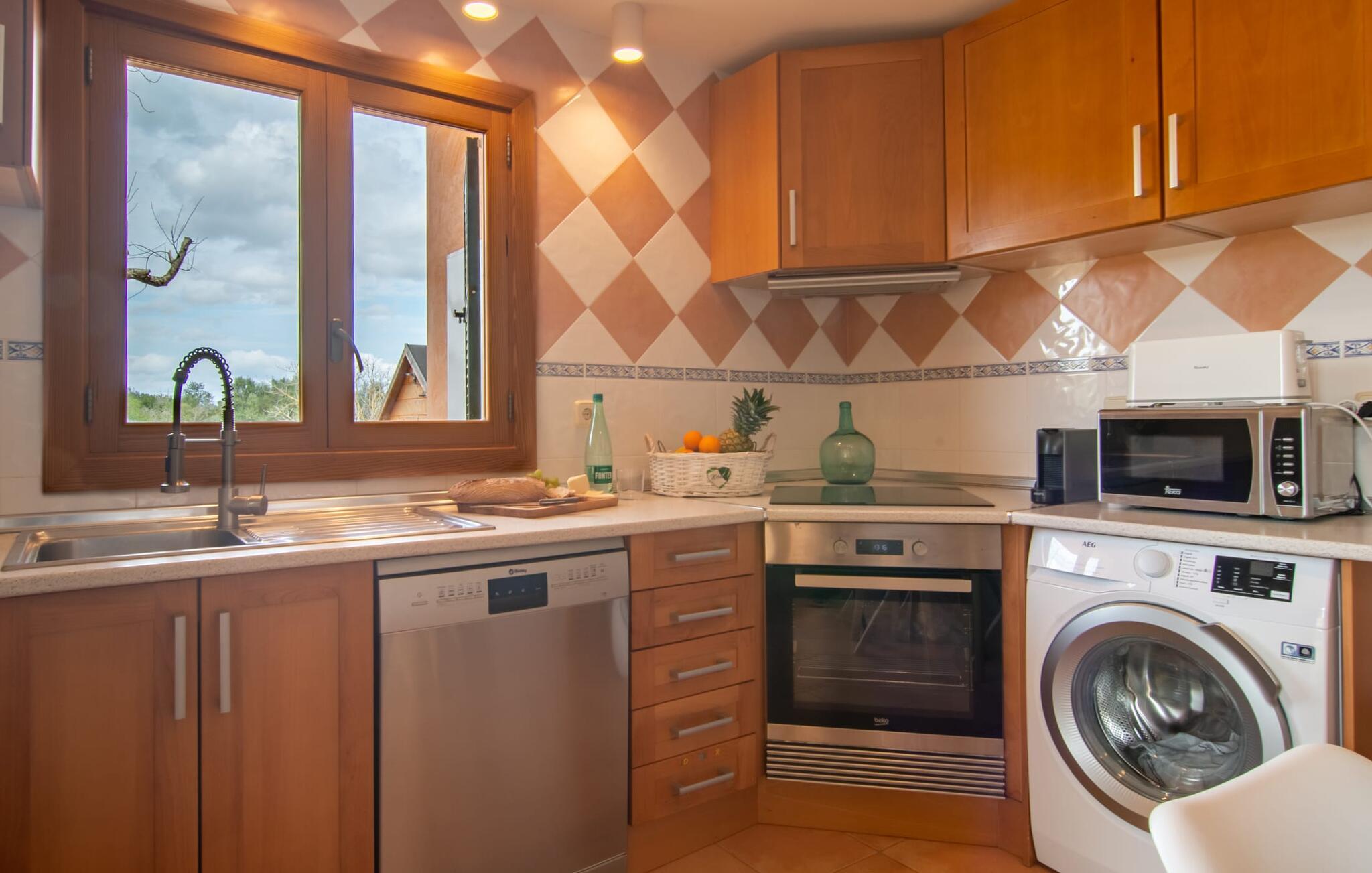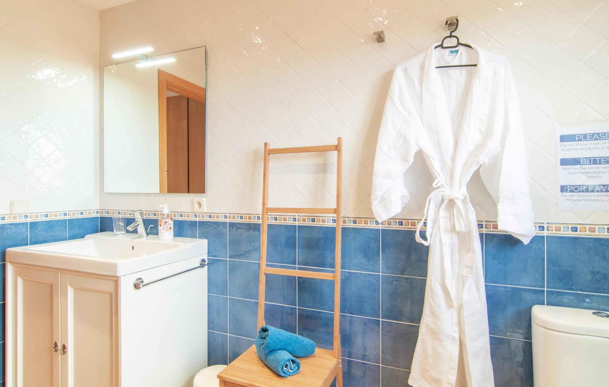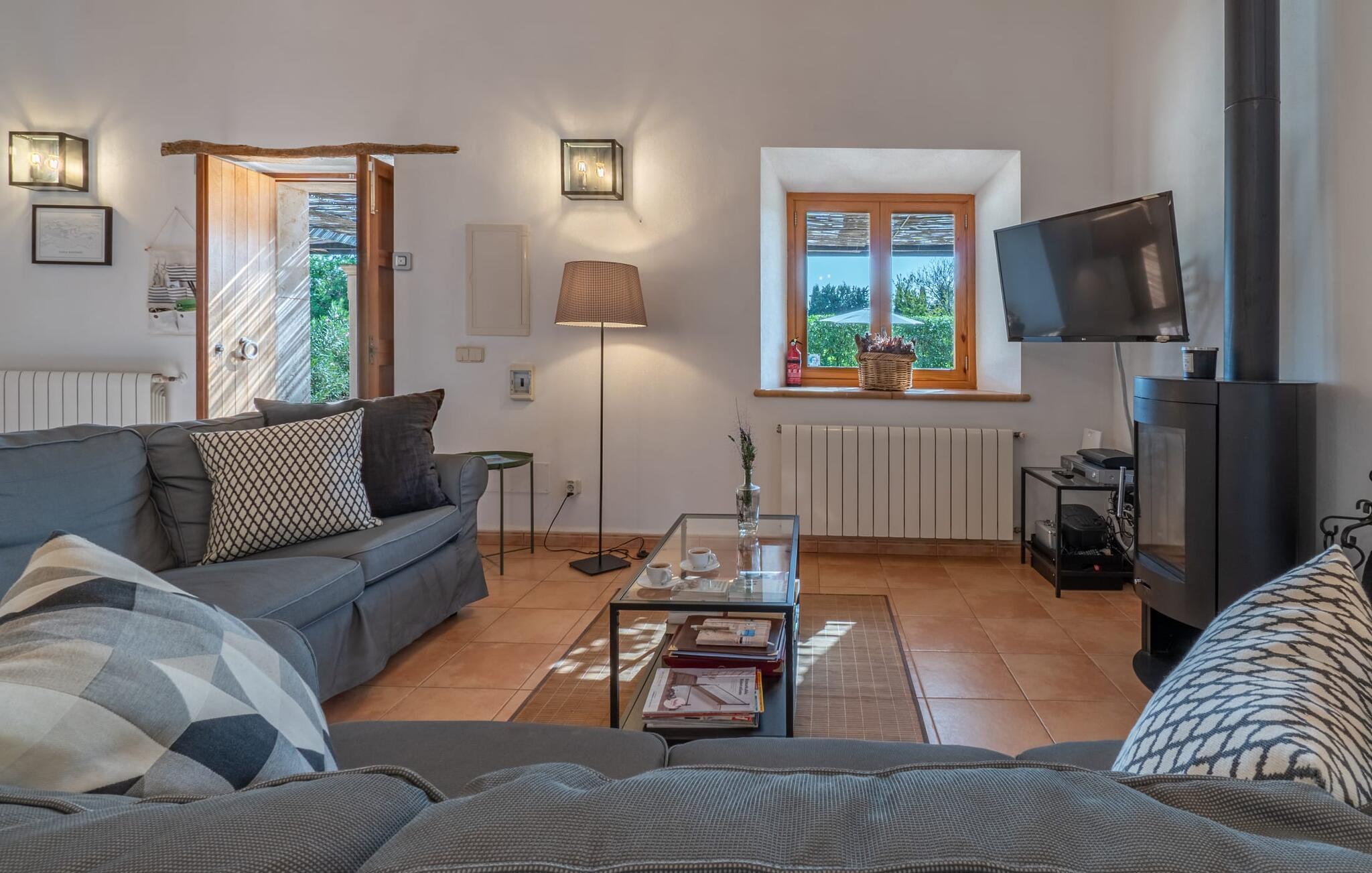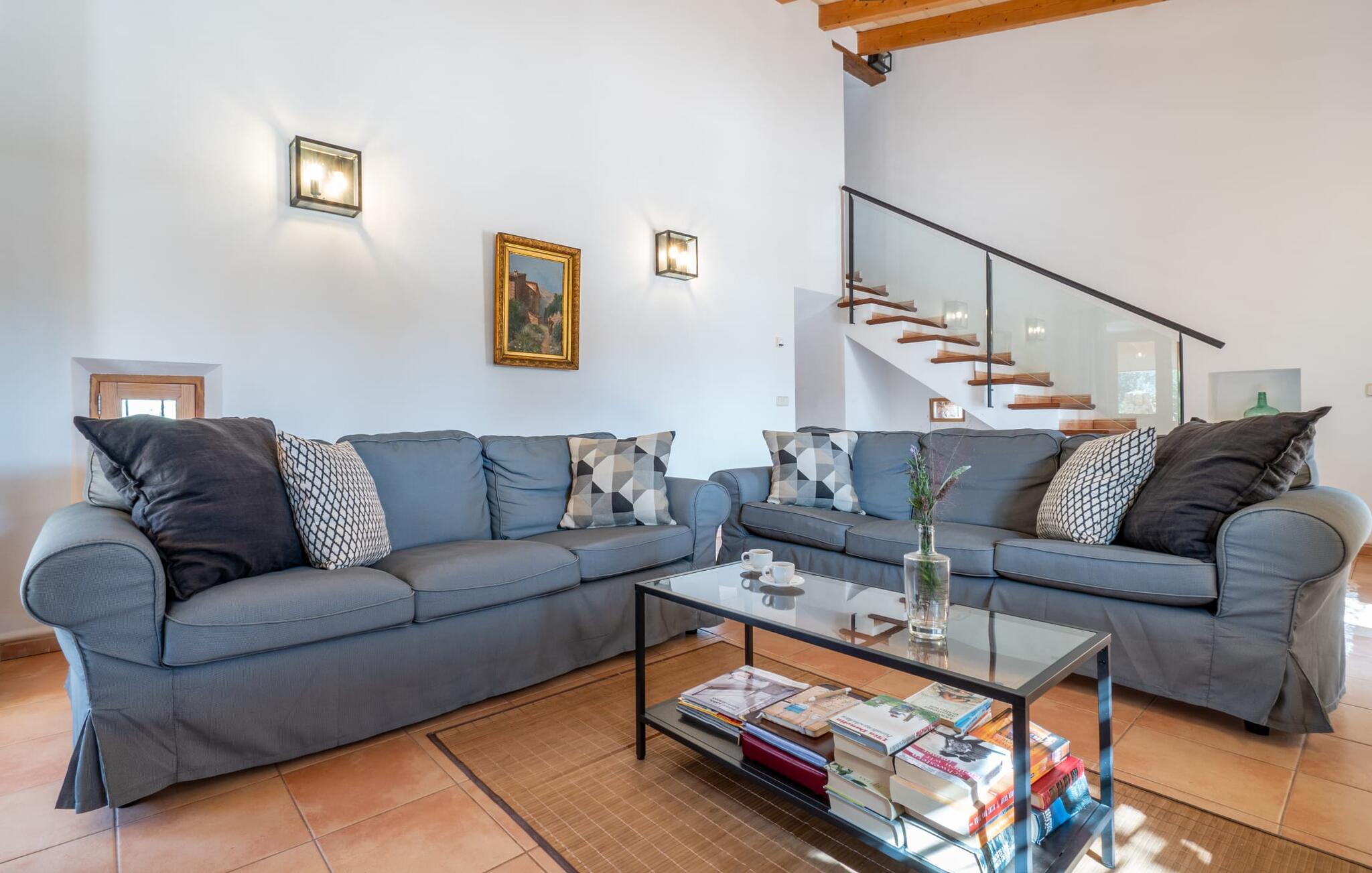 Mens uteområdet på Binitaref har et rustikt utseende i typisk villastil, er interiøret moderne, lyst og vennlig. Den romslige første etasje har også en koselig stue med to komfortable sofaer hvor du enten kan se på den knitrende peisen eller bare se på TV. Et stilig spisebord er beleilig plassert på kjøkkenet, slik at du ikke trenger å reise langt med fulle brett. Når du er mett og sliten, kan du trekke deg tilbake til ett av de tre hyggelige og diskrete dobbeltrommene med klimaanlegg. To av dem ligger i første etasje, ett i andre etasje og nås via en luftig trapp. To elegante bad, begge med badekar og ett med eget bad, avrunder den absolutt overbevisende bokomforten i feriehuset ditt.