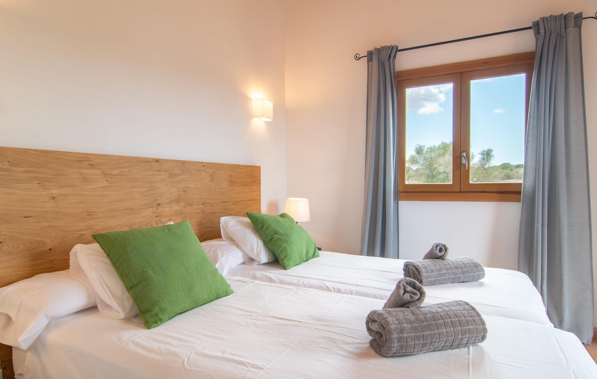 Hvis du liker å tilbringe tid utendørs, gå, vandre og sykle, er Binitaref det ideelle utgangspunktet. Det er bare å begynne å gå eller sykle, de landlige omgivelsene er fantastiske! Sineu, Costitx (med sitt observatorium), Sencelles, Sant Joan og Lloret de Vistalegre regnes som Mallorcas sanne hjerte! Du tror kanskje ikke på myten om at verdensaksen ligger under klokketårnet på Sineu kirke. Det vi vet, er at denne pittoreske, lille landsbyen har alt feriegjester kan ønske seg: gamle legender, kulturarv, gode restauranter som Moli Den Pau, som ligger i en vindmølle, og mange vinkjellere, hvorav noen også serverer solide mallorkinske retter. Besøkende fra hele øya strømmer til det ukentlige kvegmarkedet på onsdager, og fra den sentrale Sa Plaça fører skilt til interessante severdigheter som klostre, kirker og herregårder. Åkre, vindmøller, olivenlunder og vingårder preger øyas sentrum, som også kan utforskes på sykkel. Og for dem som ikke vil gå glipp av en dag på stranden: Strendene i Badia d'Alcúdia, rundt 27 km unna, er innen rekkevidde... Moderne bolig i landlige omgivelser: Villa Binitaref i hjertet av Mallorca er bygget på en herlig solrik sørvendt beliggenhet omgitt av åkrer og enger - ideelt for lange gå- og sykkelturer. Men eiendommen har også mye å by på: Du kan enten kjøle deg ned i det skrånende bassenget, spille volleyball eller bare nyte den søte lediggang i en av de komfortable utestolene på den overbygde terrassen. Den nærmeste stranden ligger bare 27 km unna.