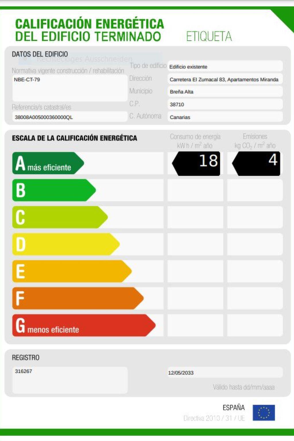 This property has been awarded a class A building energy efficiency label (energy label). It was issued and granted in 2023 by the General Directorate of the Government of the Canary Islands.