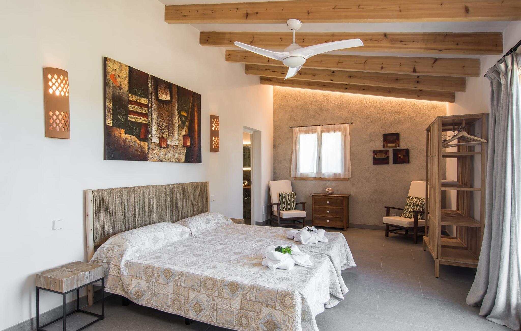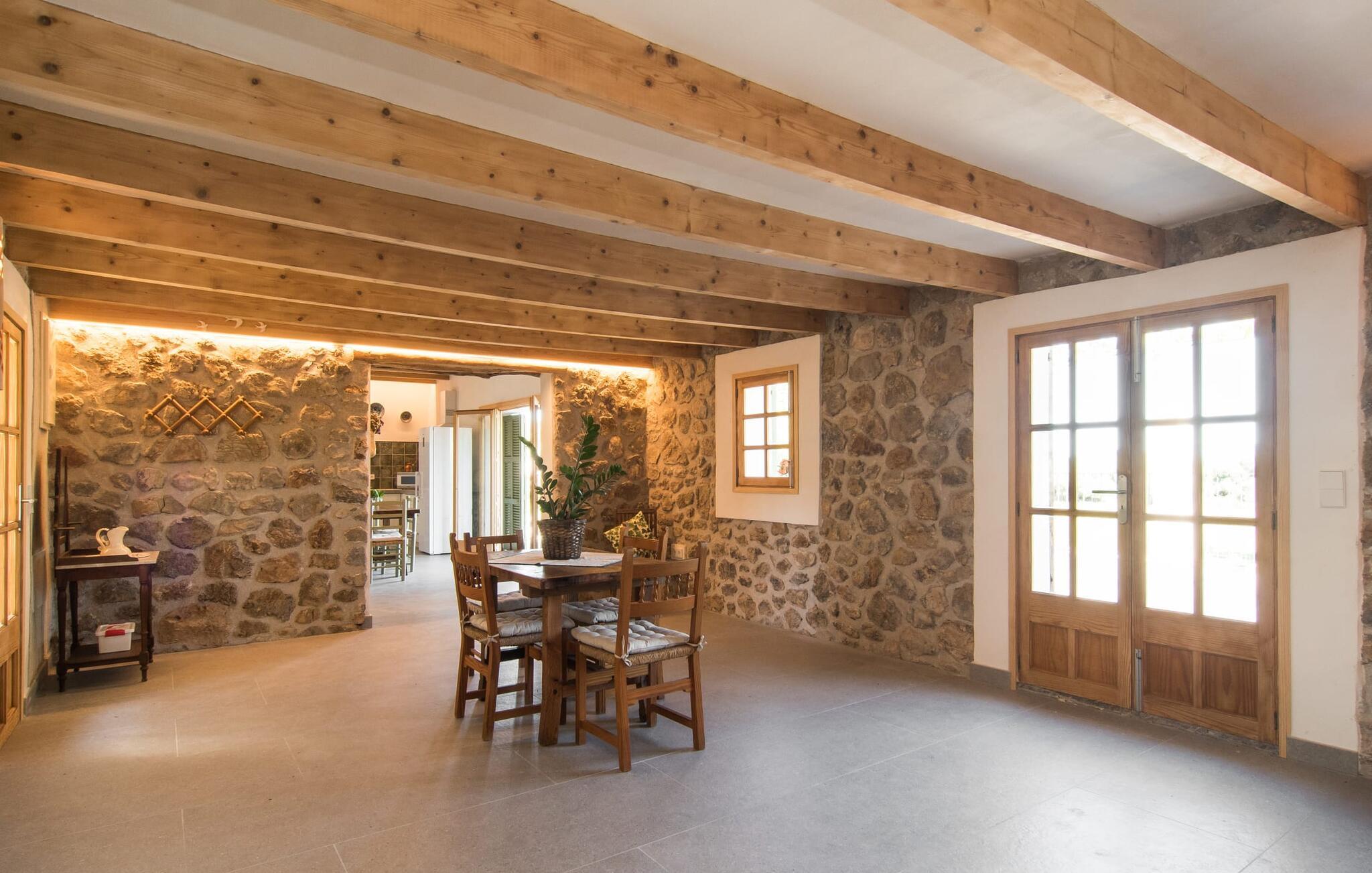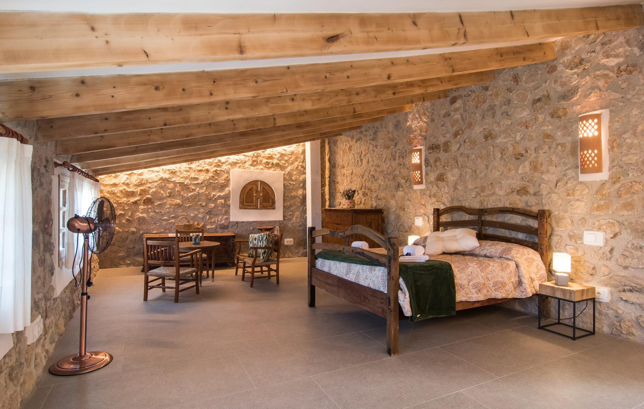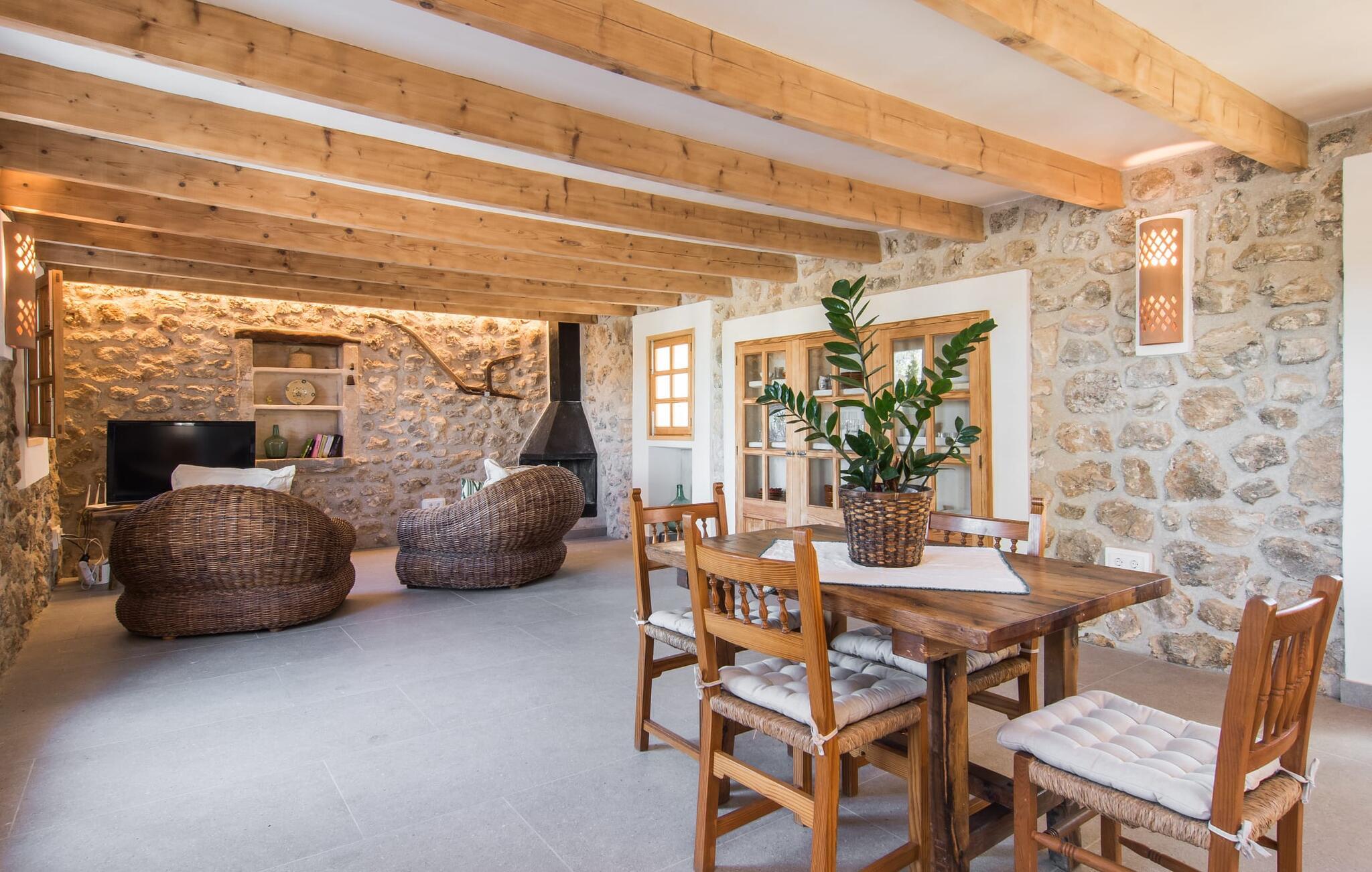 Fincaen er stilfull og rustikk, og kombinerer treverk, vakre gulvfliser og smart belysning for å skape en ekte oase av velvære. Den romslige stuen/spisestuen, med koselig peis og vegger i naturstein, har flere innbydende steder å oppholde seg. Det fullt utstyrte kjøkkenet med spisebord er perfekt for snacks eller en velduftende kaffe. Ovenpå er det to komfortable soverom (det ene med to enkeltsenger, det andre med en 1,5 meter dobbeltseng) og to dusjrom som gir god plass og privatliv. Det er også et gjestetoalett i første etasje.
