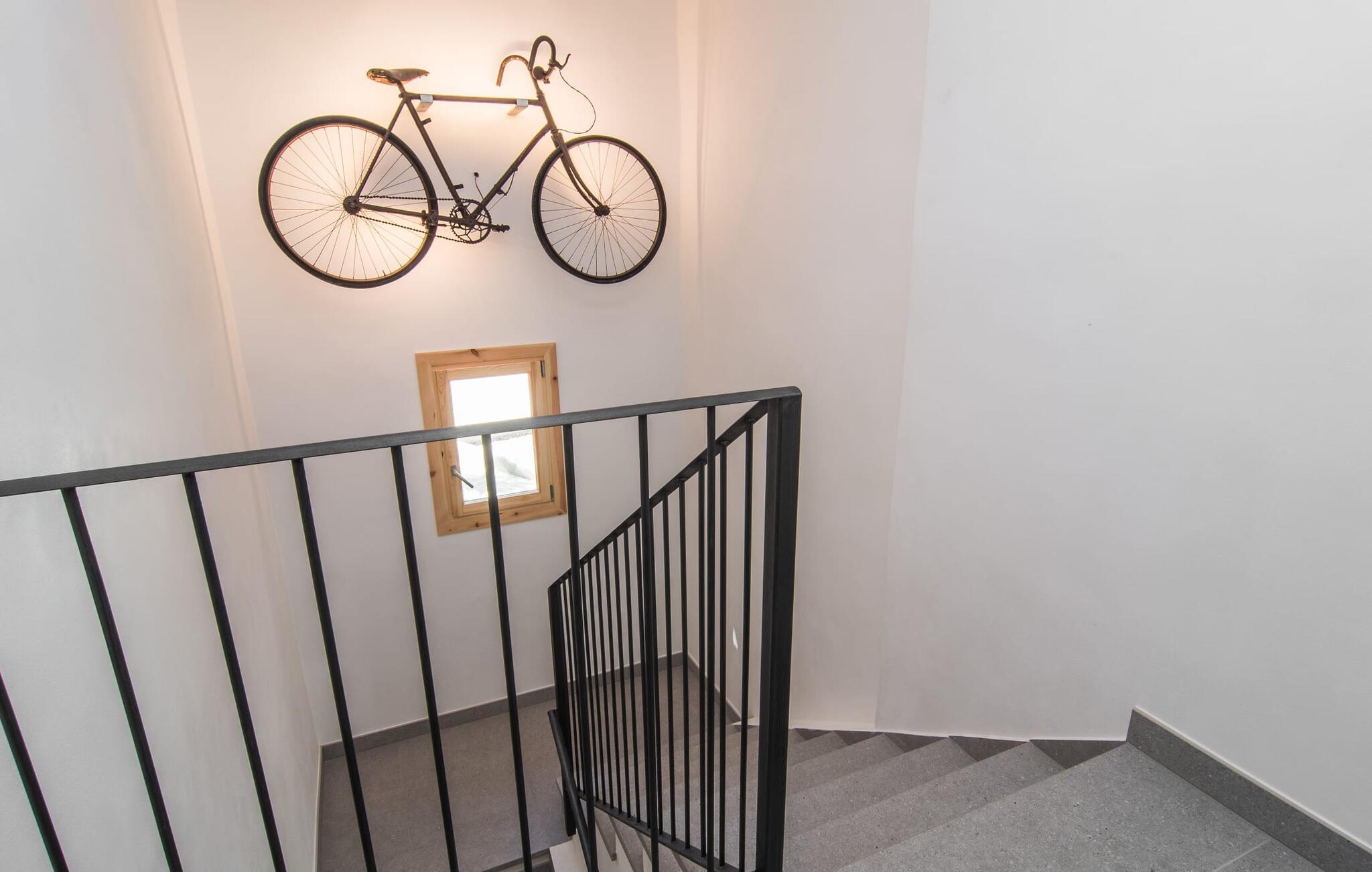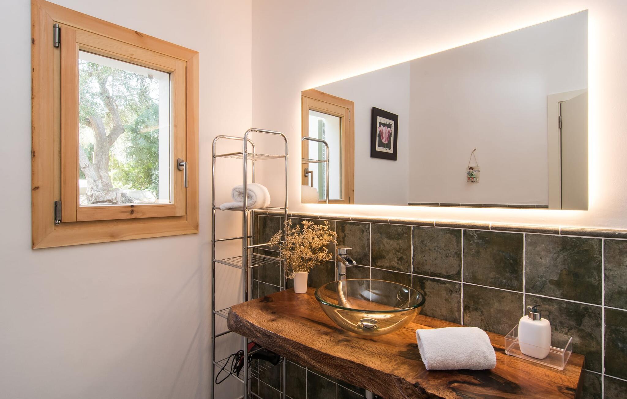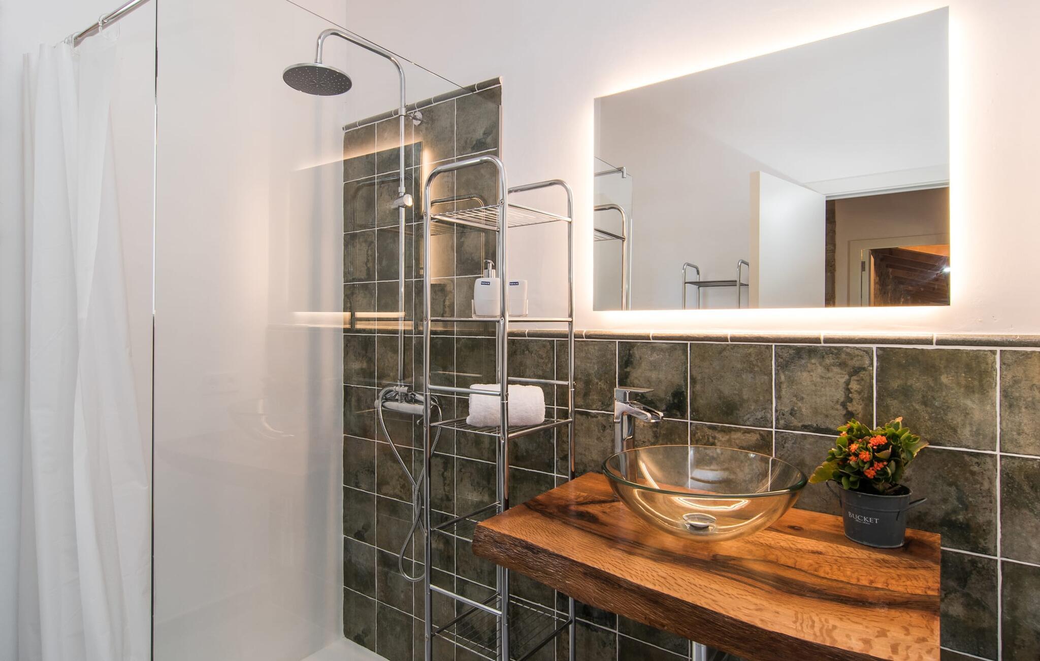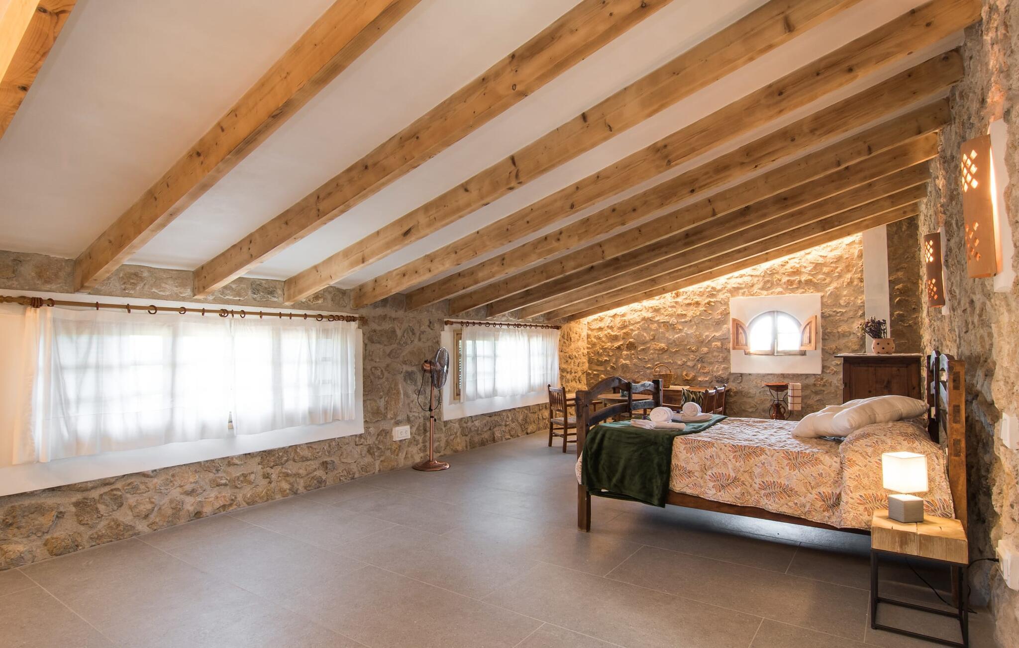 Fincaen er stilfull og rustikk, og kombinerer treverk, vakre gulvfliser og smart belysning for å skape en ekte oase av velvære. Den romslige stuen/spisestuen, med koselig peis og vegger i naturstein, har flere innbydende steder å oppholde seg. Det fullt utstyrte kjøkkenet med spisebord er perfekt for snacks eller en velduftende kaffe. Ovenpå er det to komfortable soverom (det ene med to enkeltsenger, det andre med en 1,5 meter dobbeltseng) og to dusjrom som gir god plass og privatliv. Det er også et gjestetoalett i første etasje.