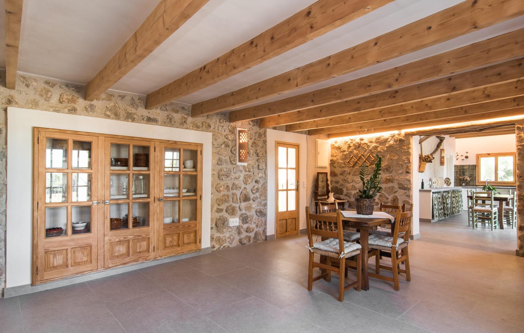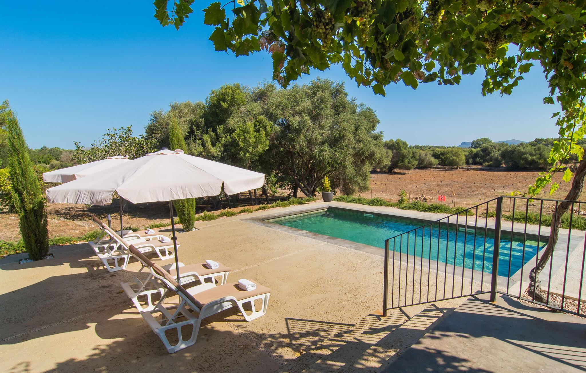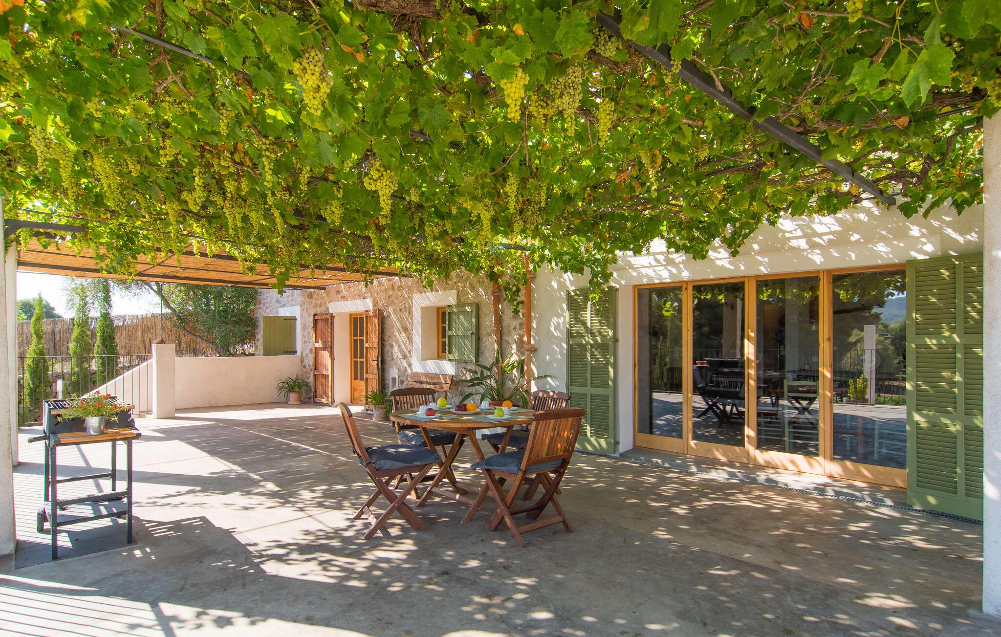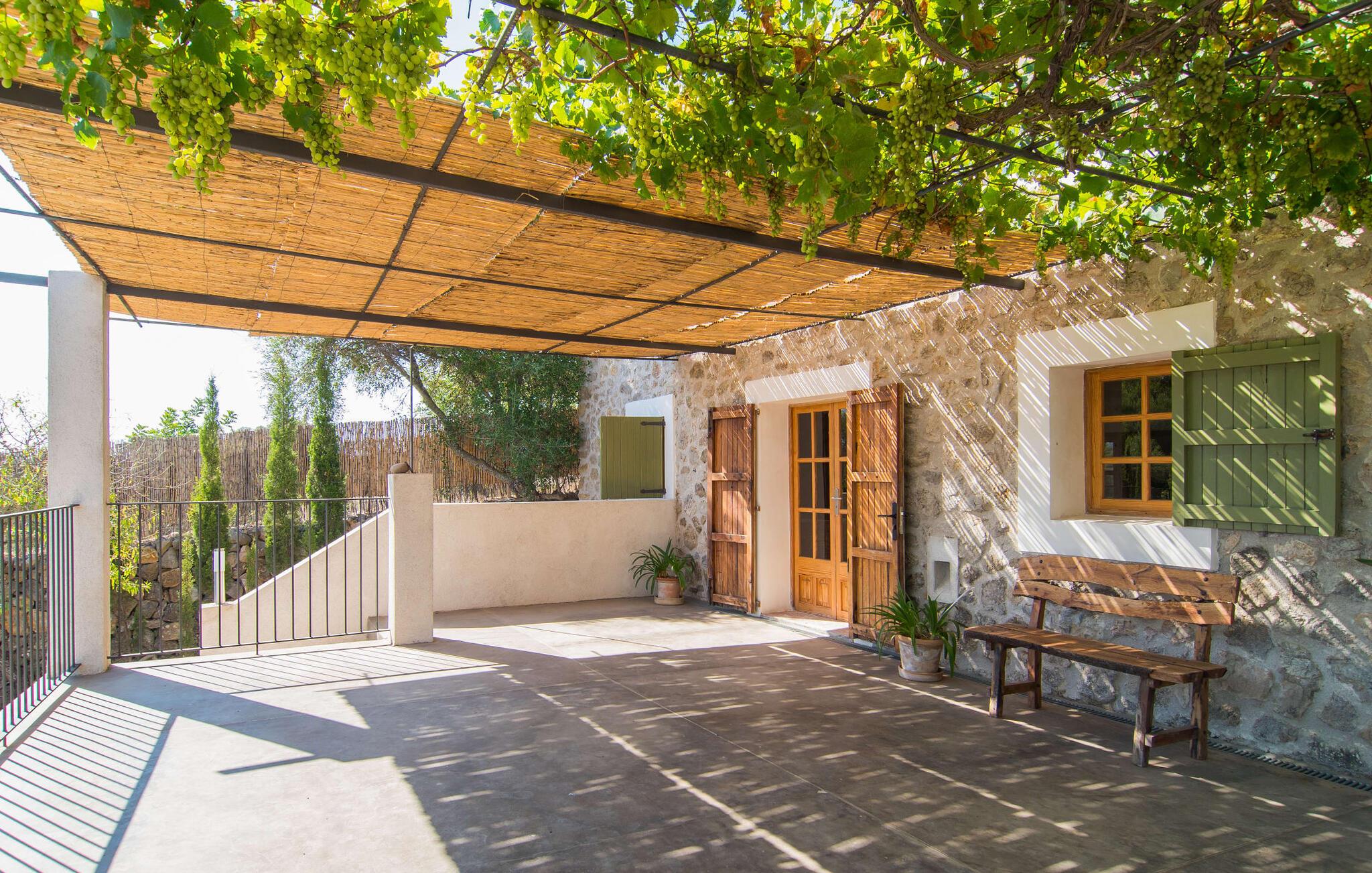 Den sjarmerende terrassen, som er skyggelagt av en vinranke, har et nydelig spisebord som er ideelt for frokost eller en ettermiddagskaffe med utsikt over bassenget, og er lett tilgjengelig via en hjørnetrapp. Enten du nyter et glass vin på den rustikke benken eller slapper av etter en travel dag, gjør denne fincaen feriedrømmer til virkelighet.