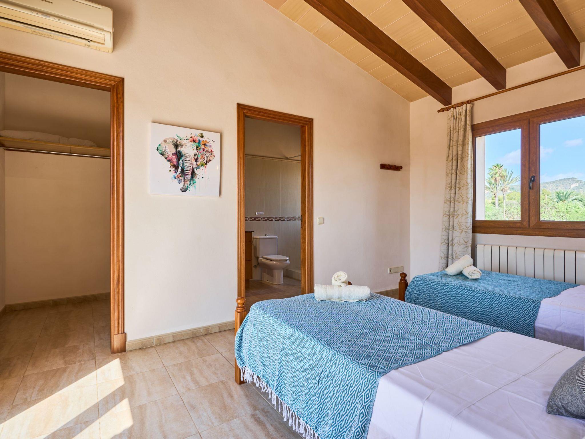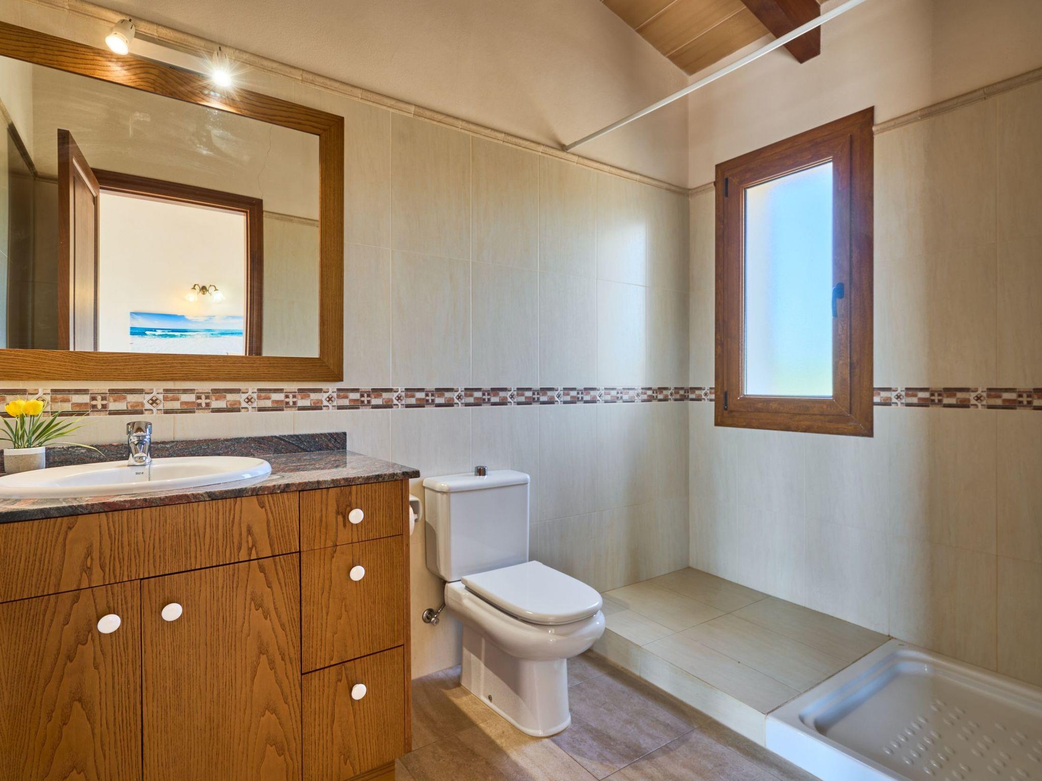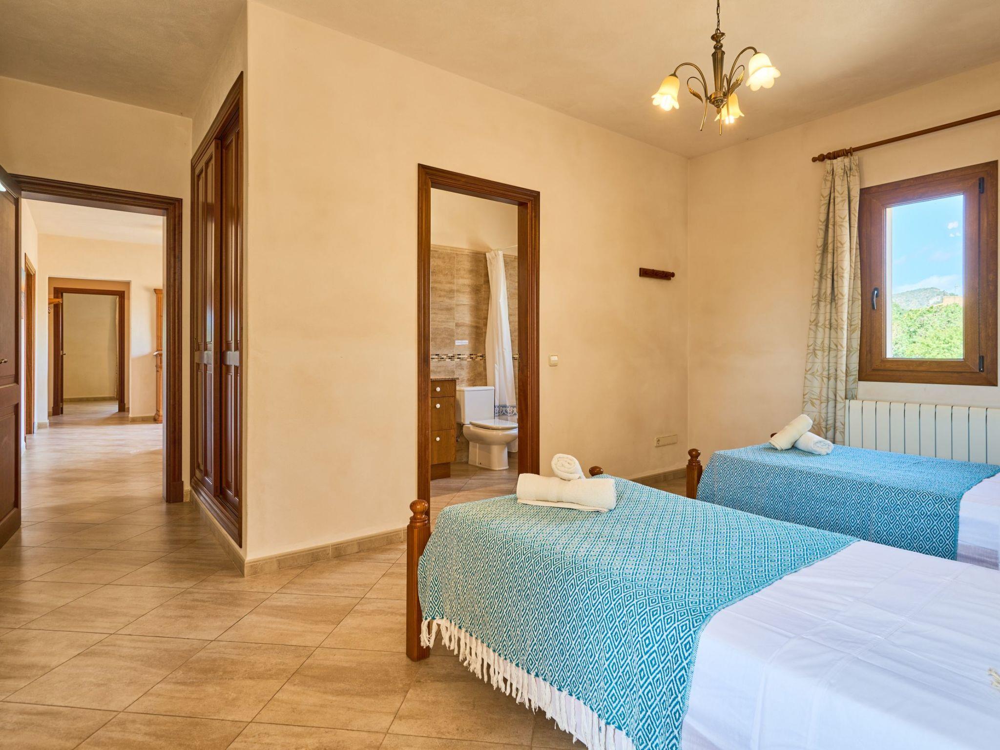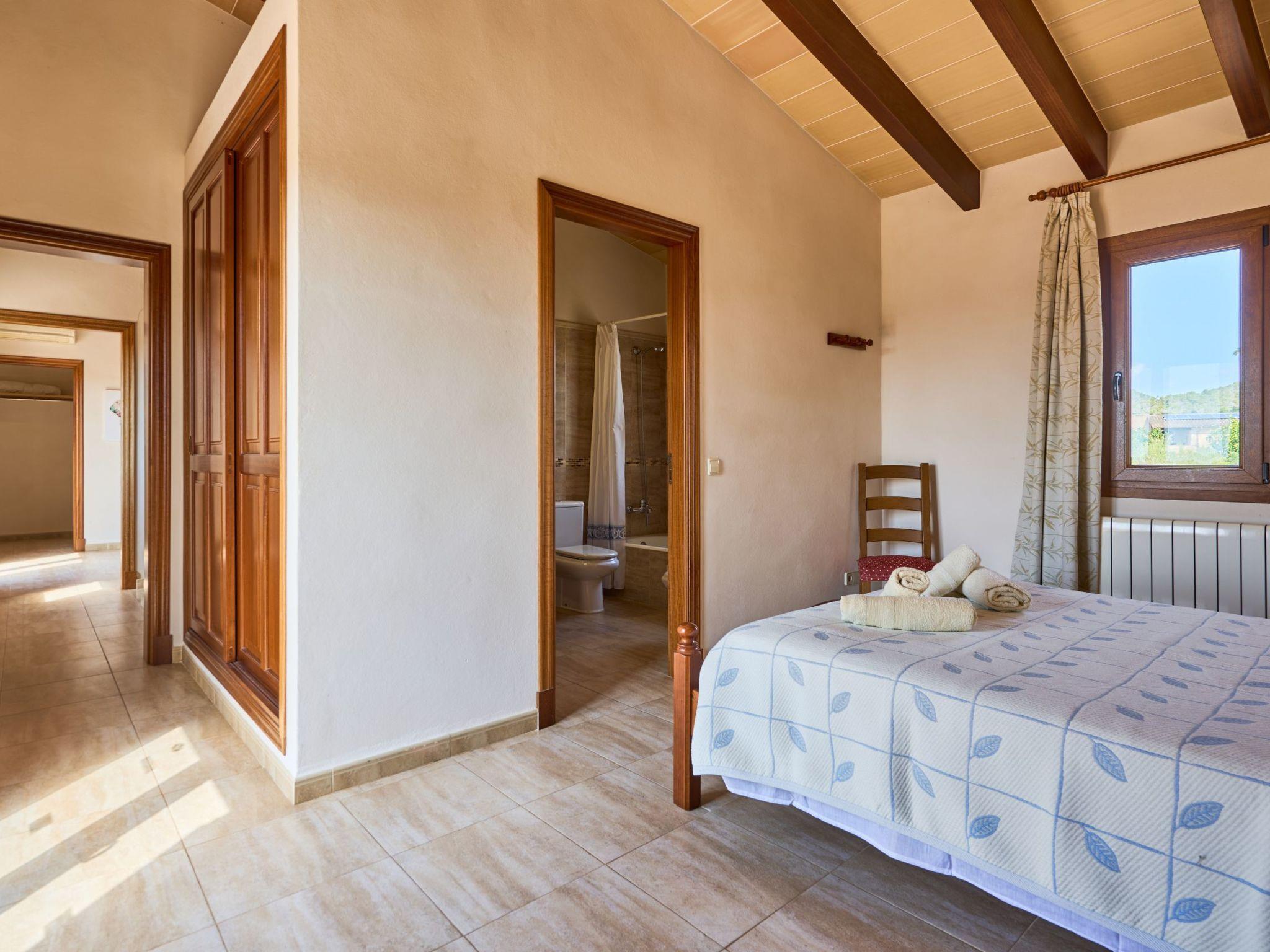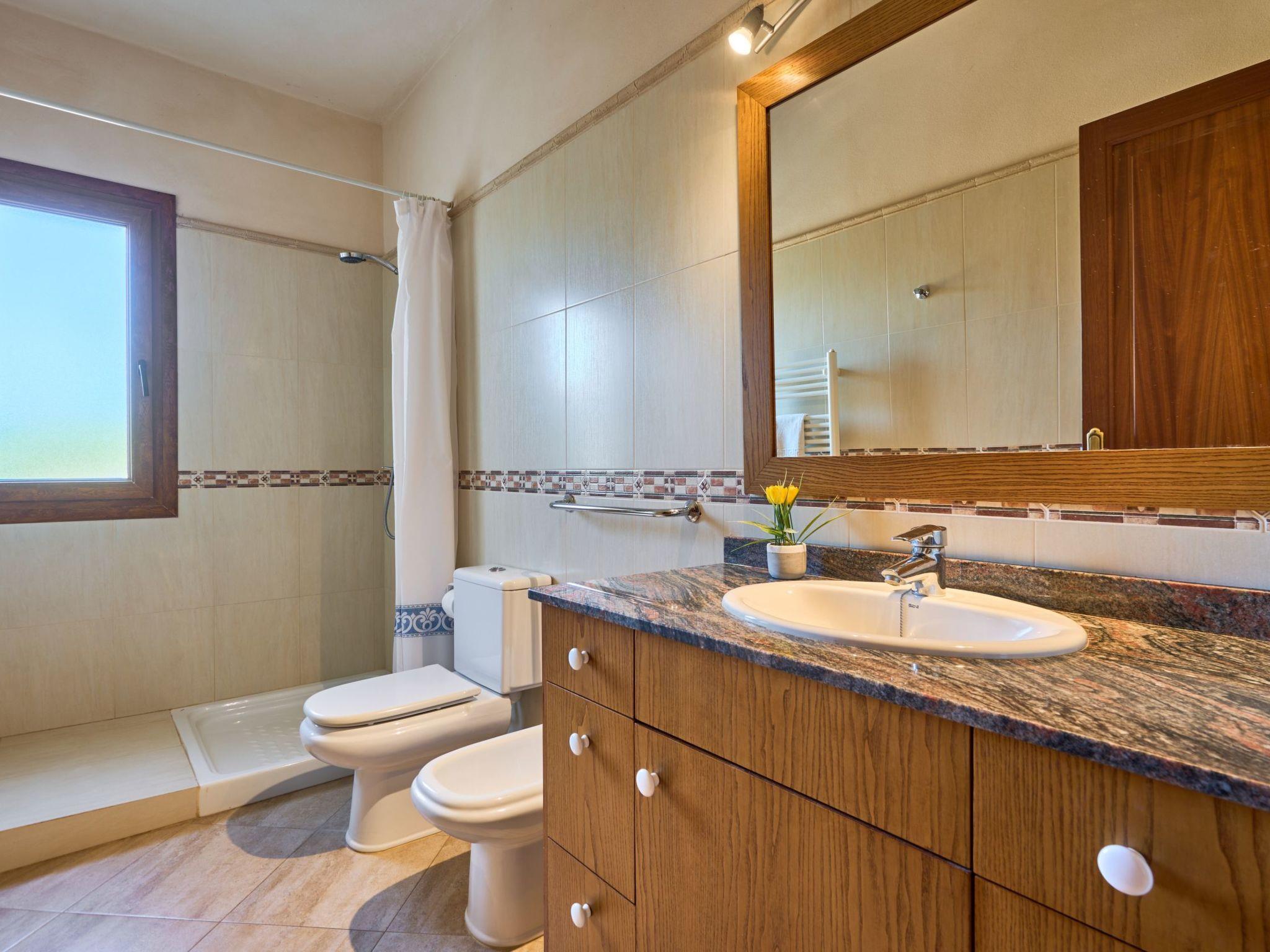 From the entrance area, we enter the bright open-plan living/dining area with access to the covered terrace and pool area. The kitchen is spacious and well equipped. There is a large dining table and access to the covered terrace. There are two bedrooms on the ground floor. One of them has two single beds and an ensuite bathroom, the other has a double bed and an adjoining shower room. On the upper floor there are two further bedrooms, both with access to the terrace and views of the pool and the surrounding area. One is furnished with two single beds and has an en-suite shower room, the other has a double bed and en-suite bathroom.