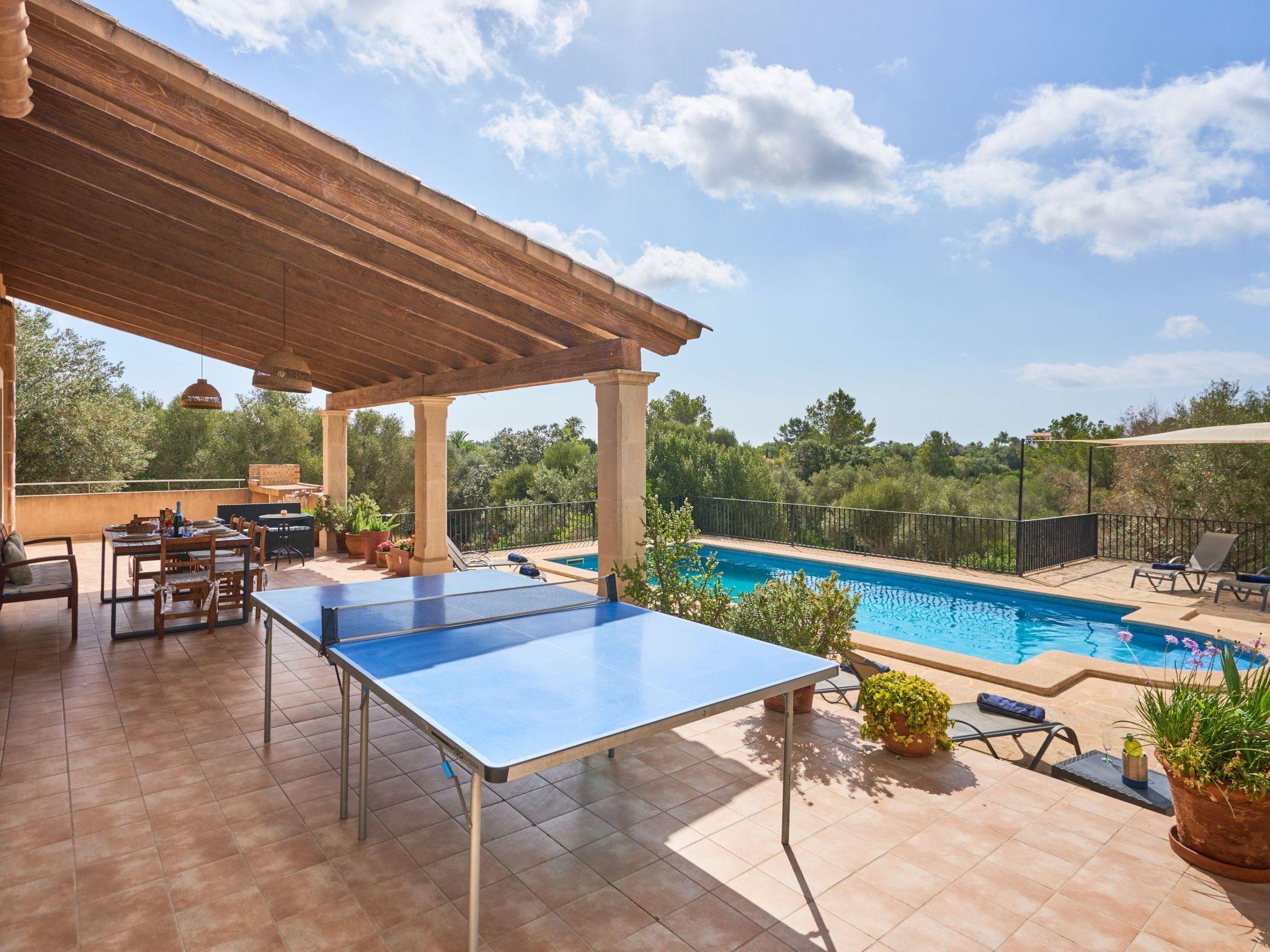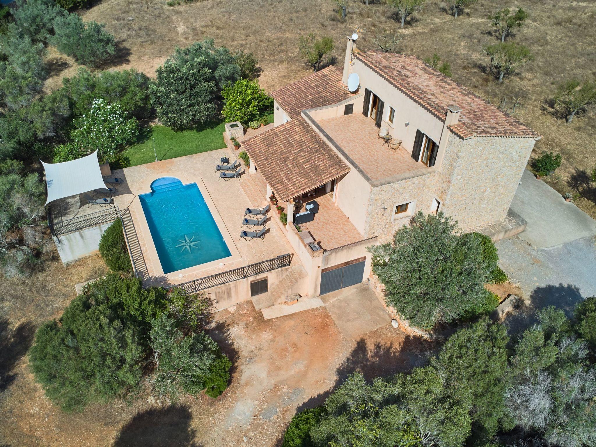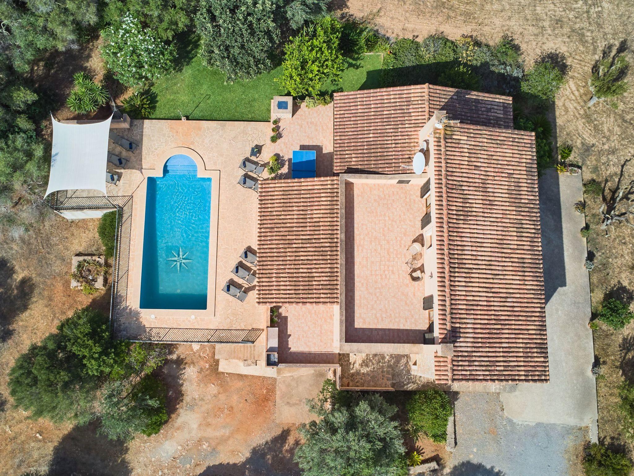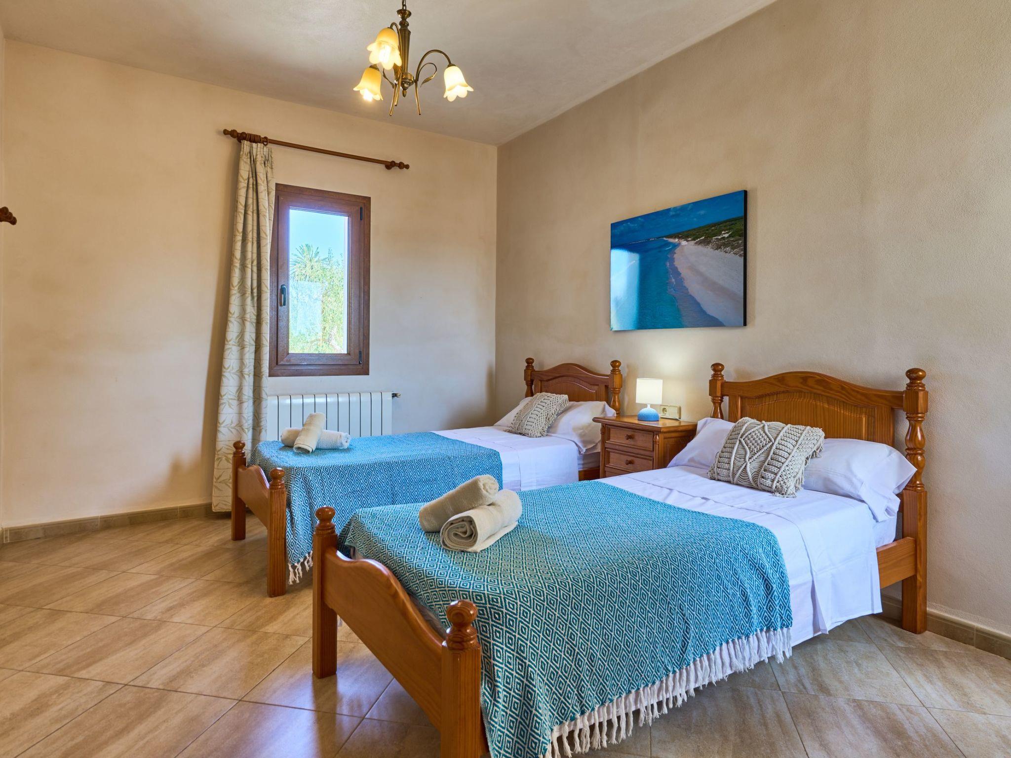 From the entrance area, we enter the bright open-plan living/dining area with access to the covered terrace and pool area. The kitchen is spacious and well equipped. There is a large dining table and access to the covered terrace. There are two bedrooms on the ground floor. One of them has two single beds and an ensuite bathroom, the other has a double bed and an adjoining shower room. On the upper floor there are two further bedrooms, both with access to the terrace and views of the pool and the surrounding area. One is furnished with two single beds and has an en-suite shower room, the other has a double bed and en-suite bathroom.