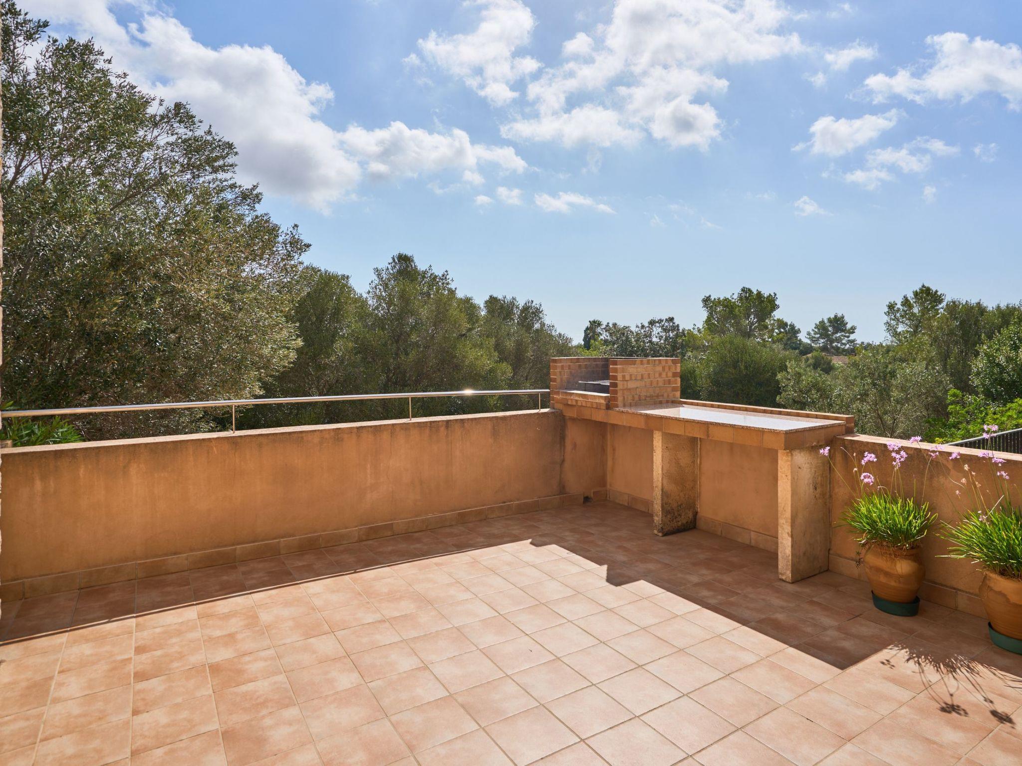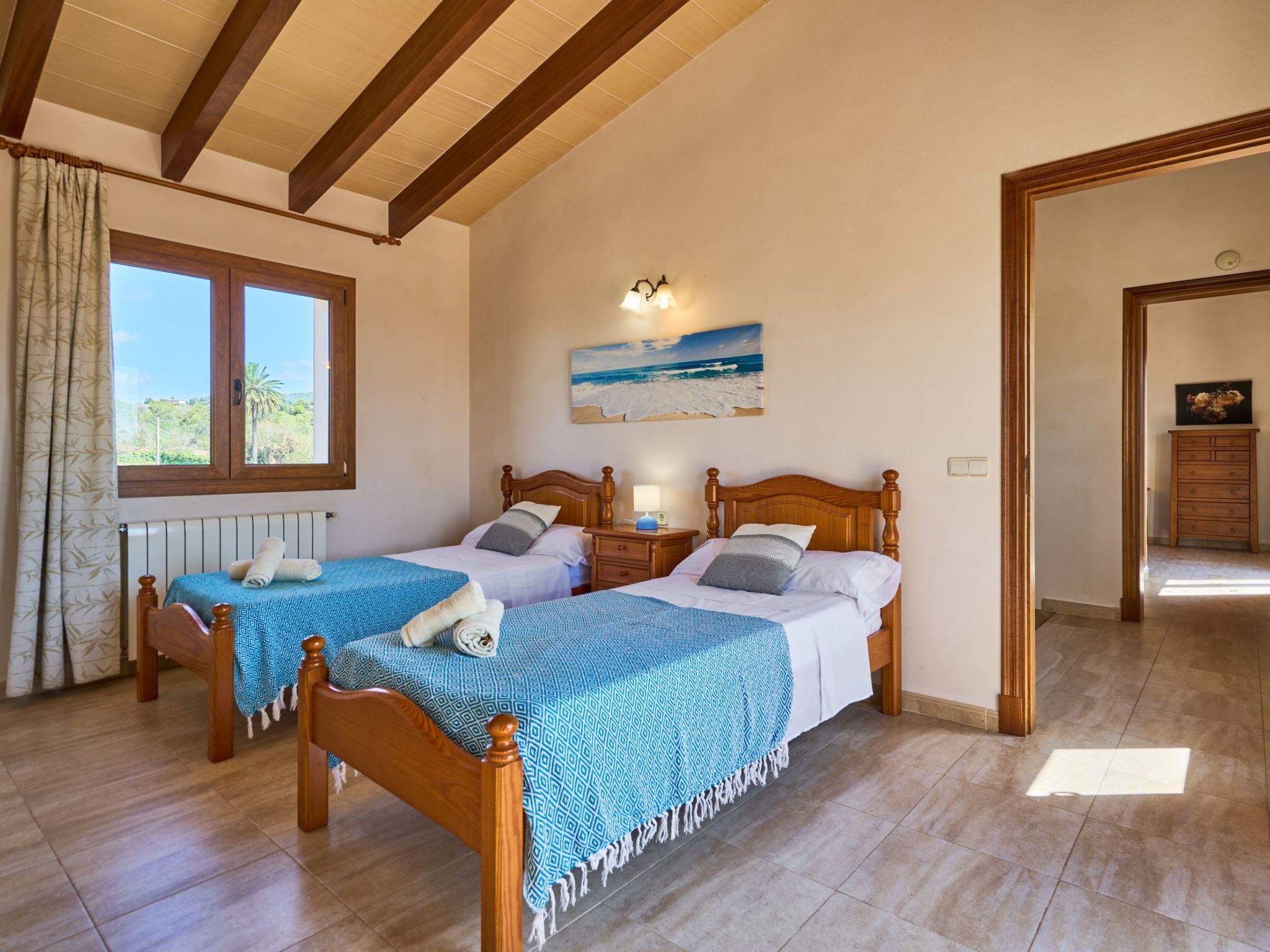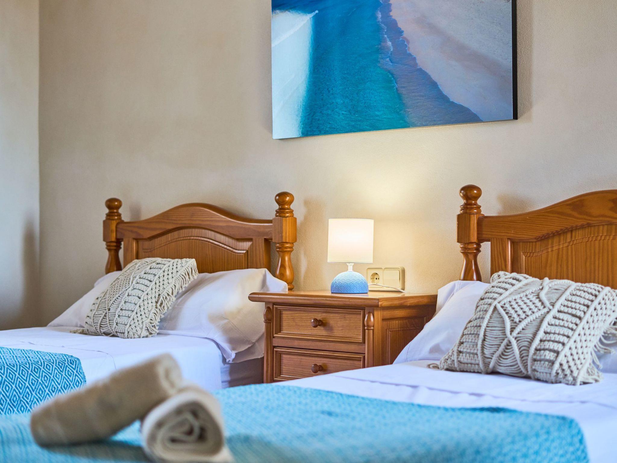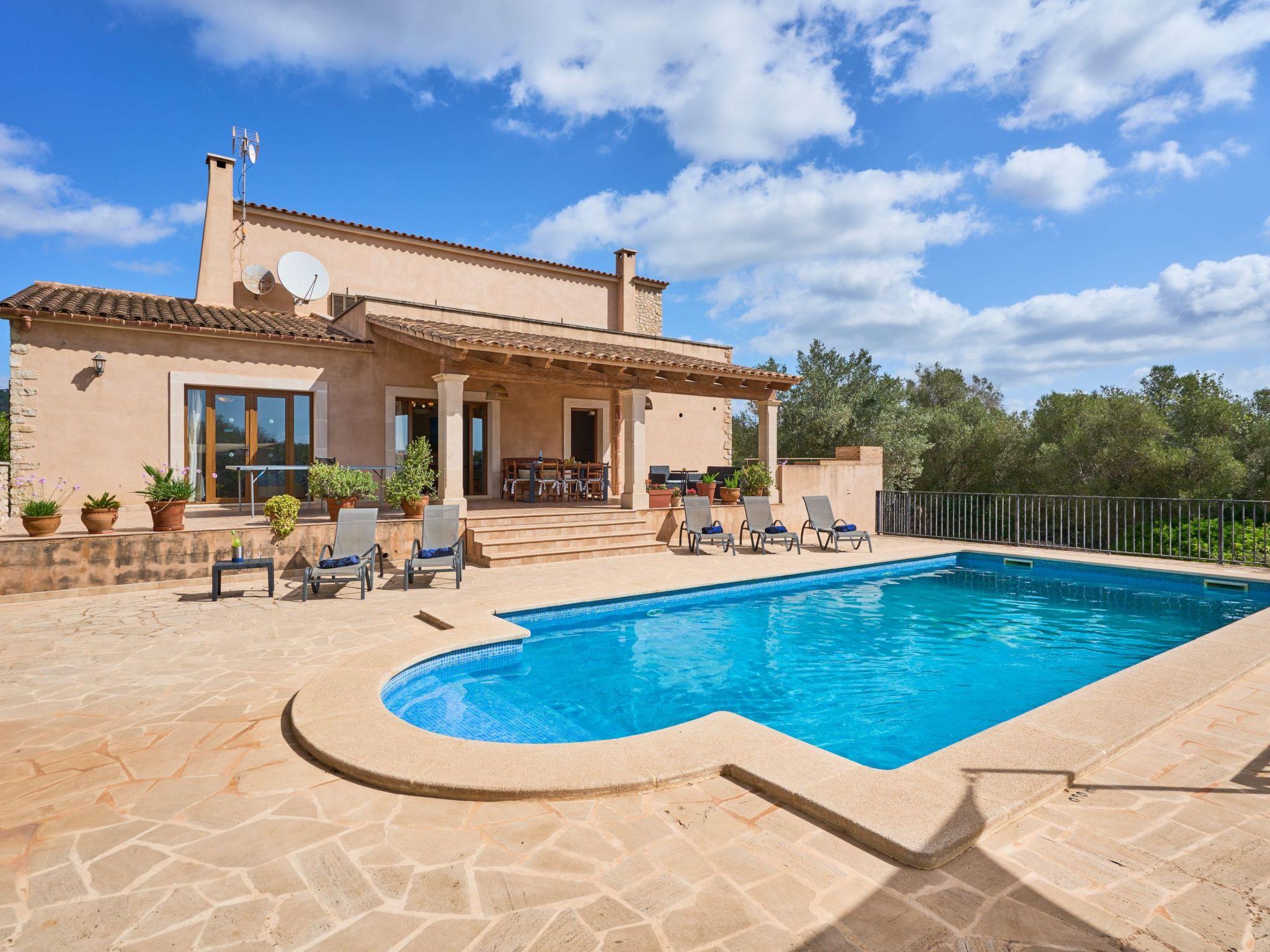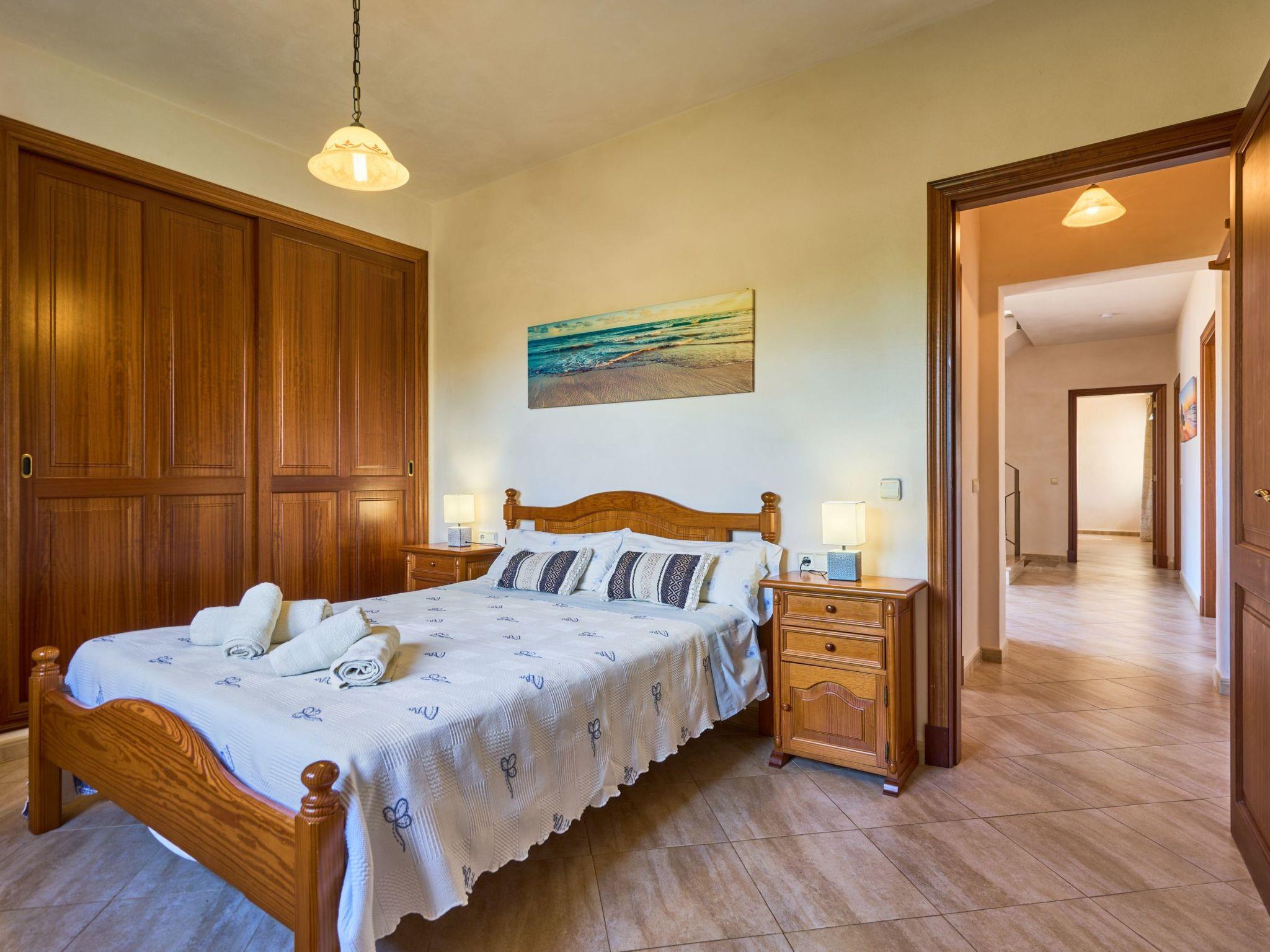 From the entrance area, we enter the bright open-plan living/dining area with access to the covered terrace and pool area. The kitchen is spacious and well equipped. There is a large dining table and access to the covered terrace. There are two bedrooms on the ground floor. One of them has two single beds and an ensuite bathroom, the other has a double bed and an adjoining shower room. On the upper floor there are two further bedrooms, both with access to the terrace and views of the pool and the surrounding area. One is furnished with two single beds and has an en-suite shower room, the other has a double bed and en-suite bathroom.