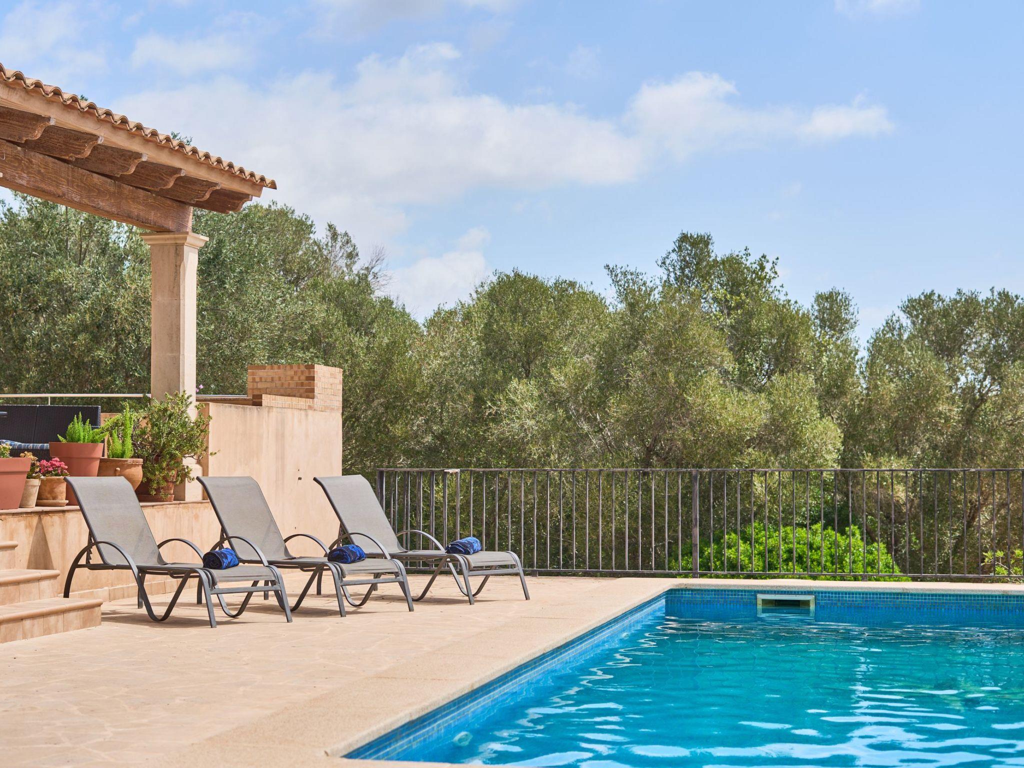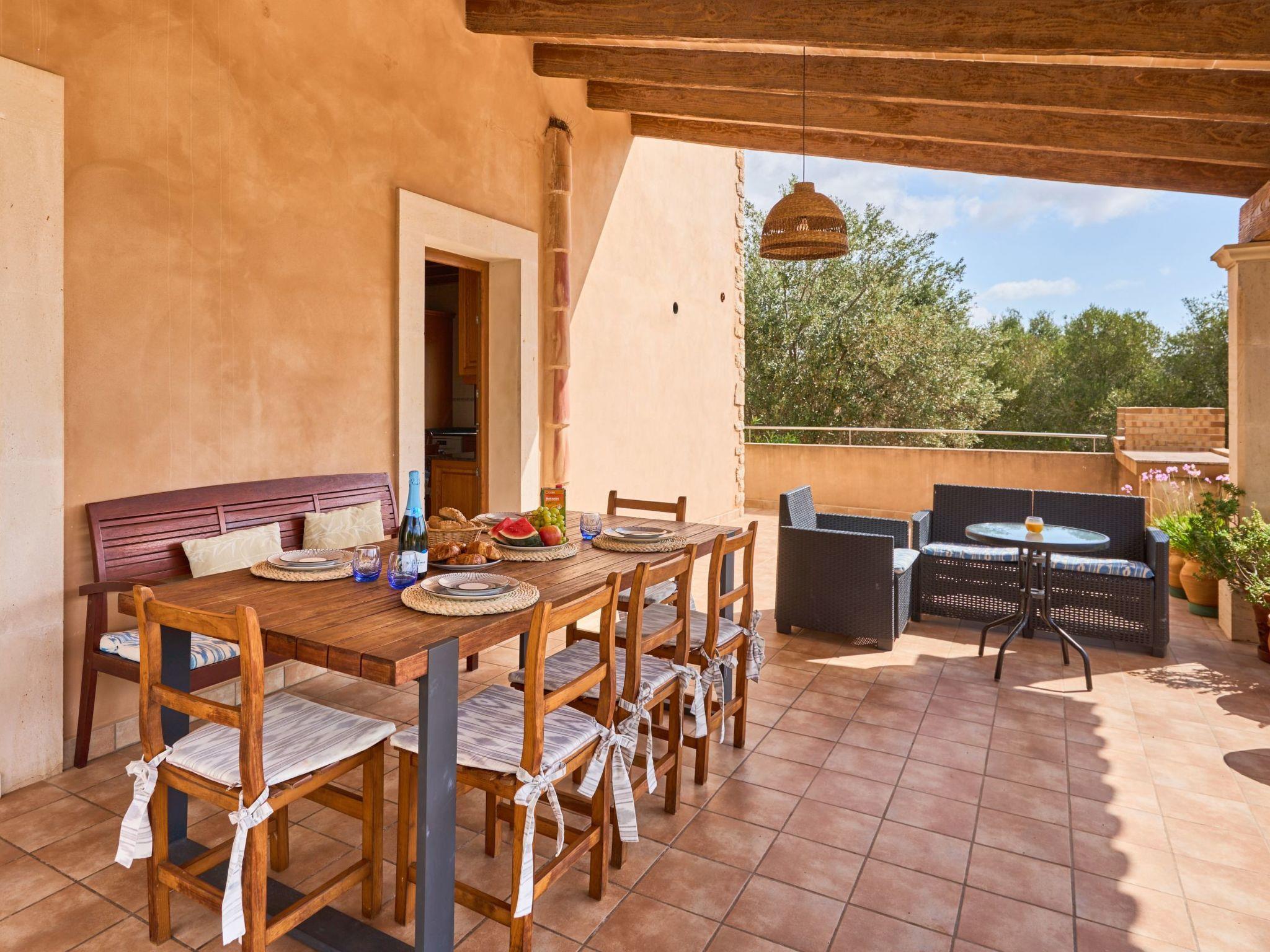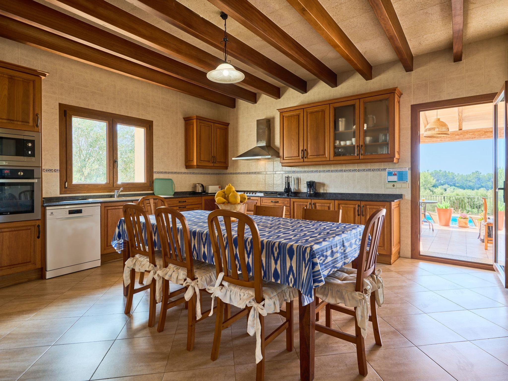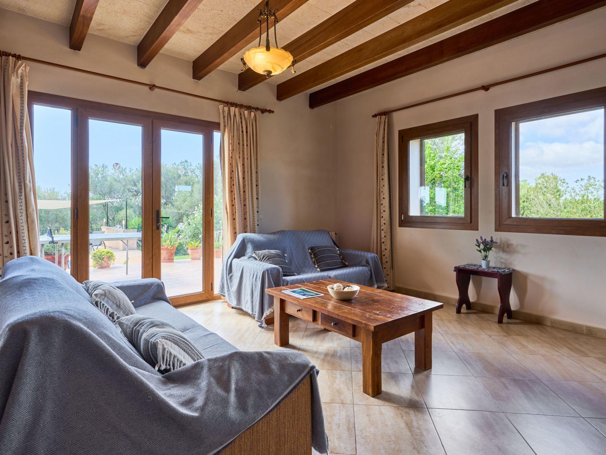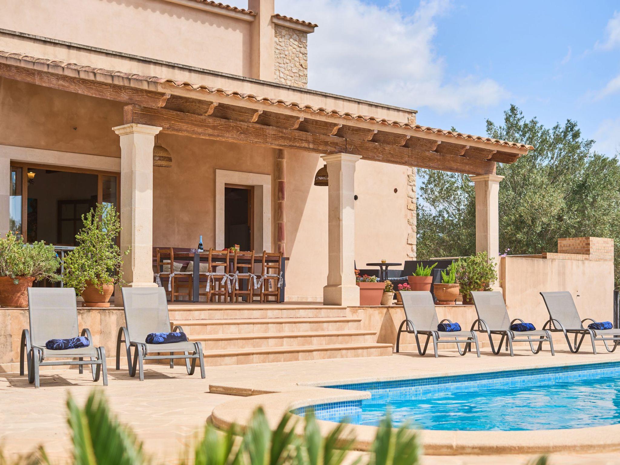 From the entrance area, we enter the bright open-plan living/dining area with access to the covered terrace and pool area. The kitchen is spacious and well equipped. There is a large dining table and access to the covered terrace. There are two bedrooms on the ground floor. One of them has two single beds and an ensuite bathroom, the other has a double bed and an adjoining shower room. On the upper floor there are two further bedrooms, both with access to the terrace and views of the pool and the surrounding area. One is furnished with two single beds and has an en-suite shower room, the other has a double bed and en-suite bathroom.