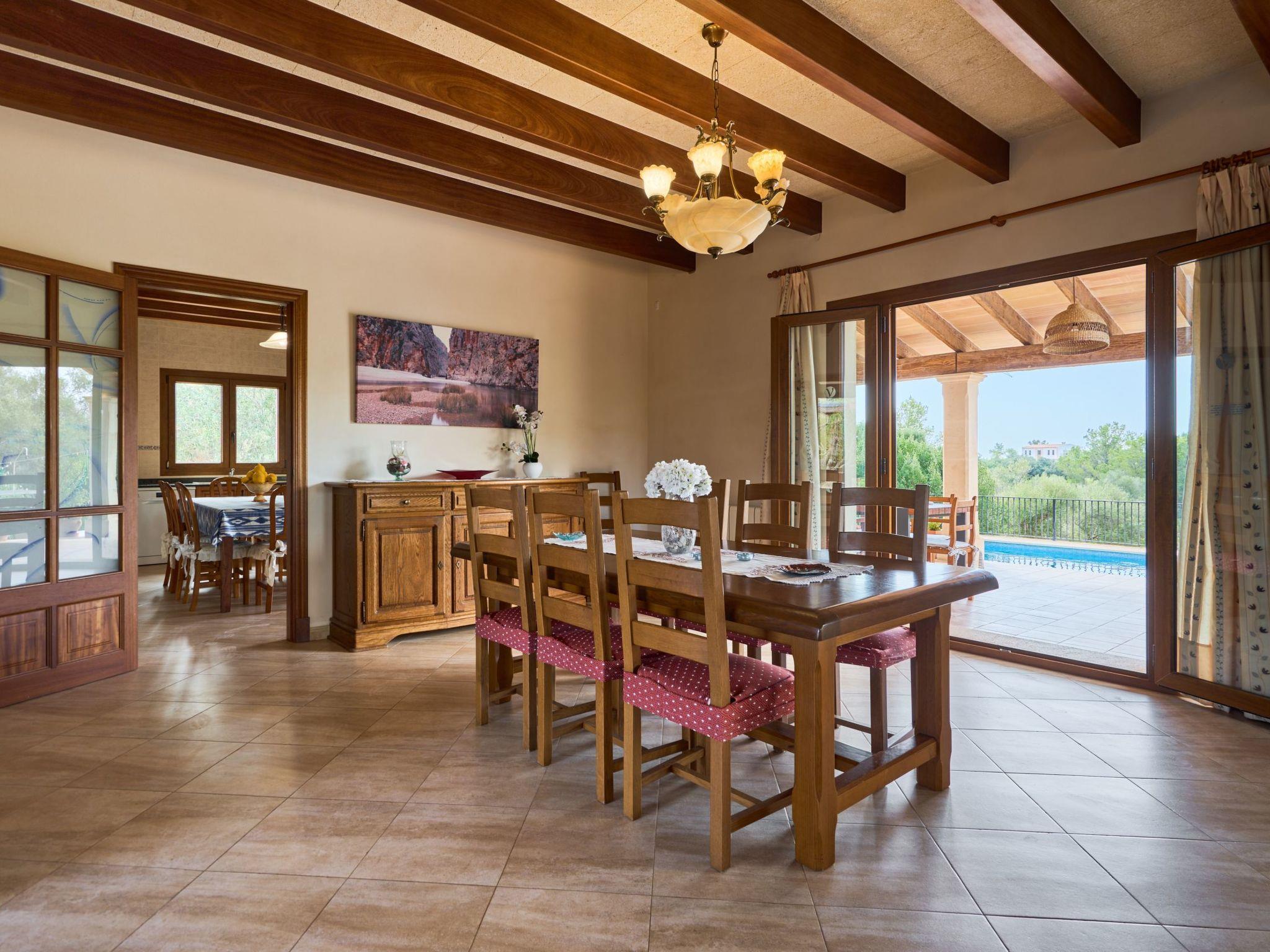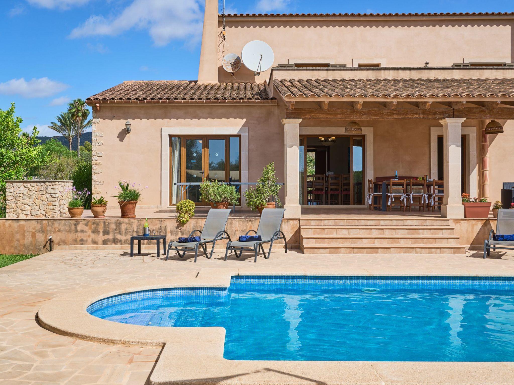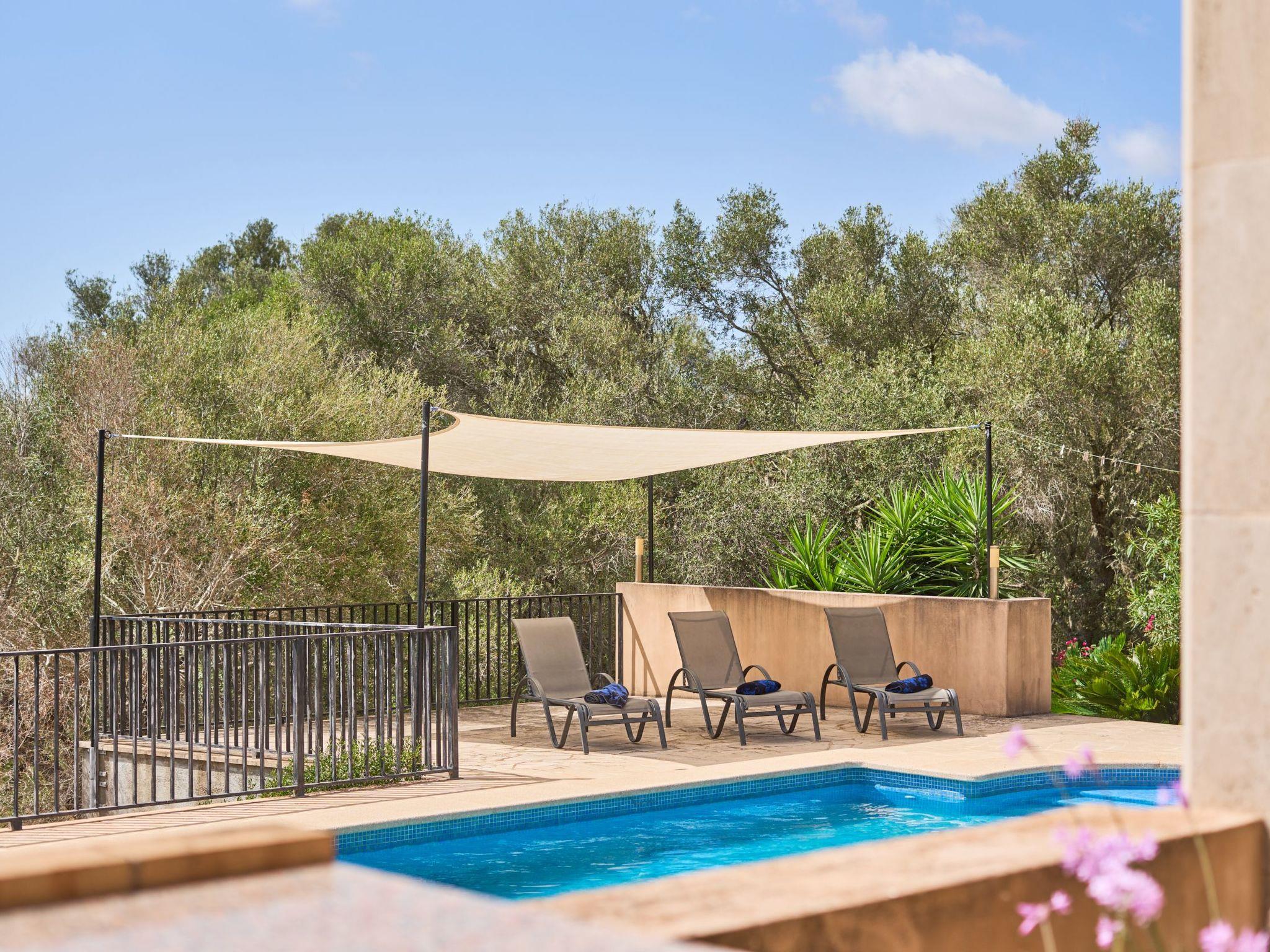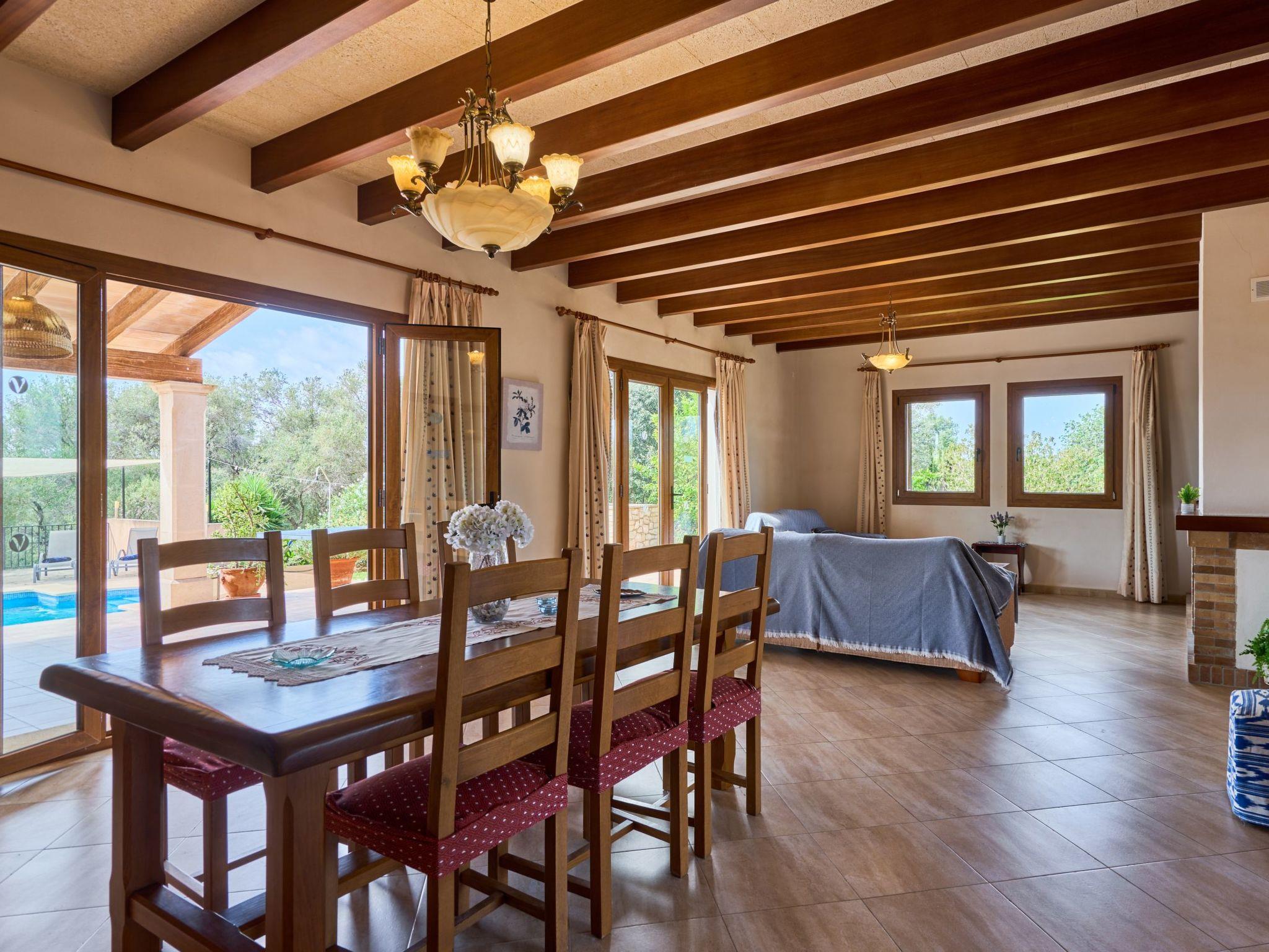 From the entrance area, we enter the bright open-plan living/dining area with access to the covered terrace and pool area. The kitchen is spacious and well equipped. There is a large dining table and access to the covered terrace. There are two bedrooms on the ground floor. One of them has two single beds and an ensuite bathroom, the other has a double bed and an adjoining shower room. On the upper floor there are two further bedrooms, both with access to the terrace and views of the pool and the surrounding area. One is furnished with two single beds and has an en-suite shower room, the other has a double bed and en-suite bathroom.
