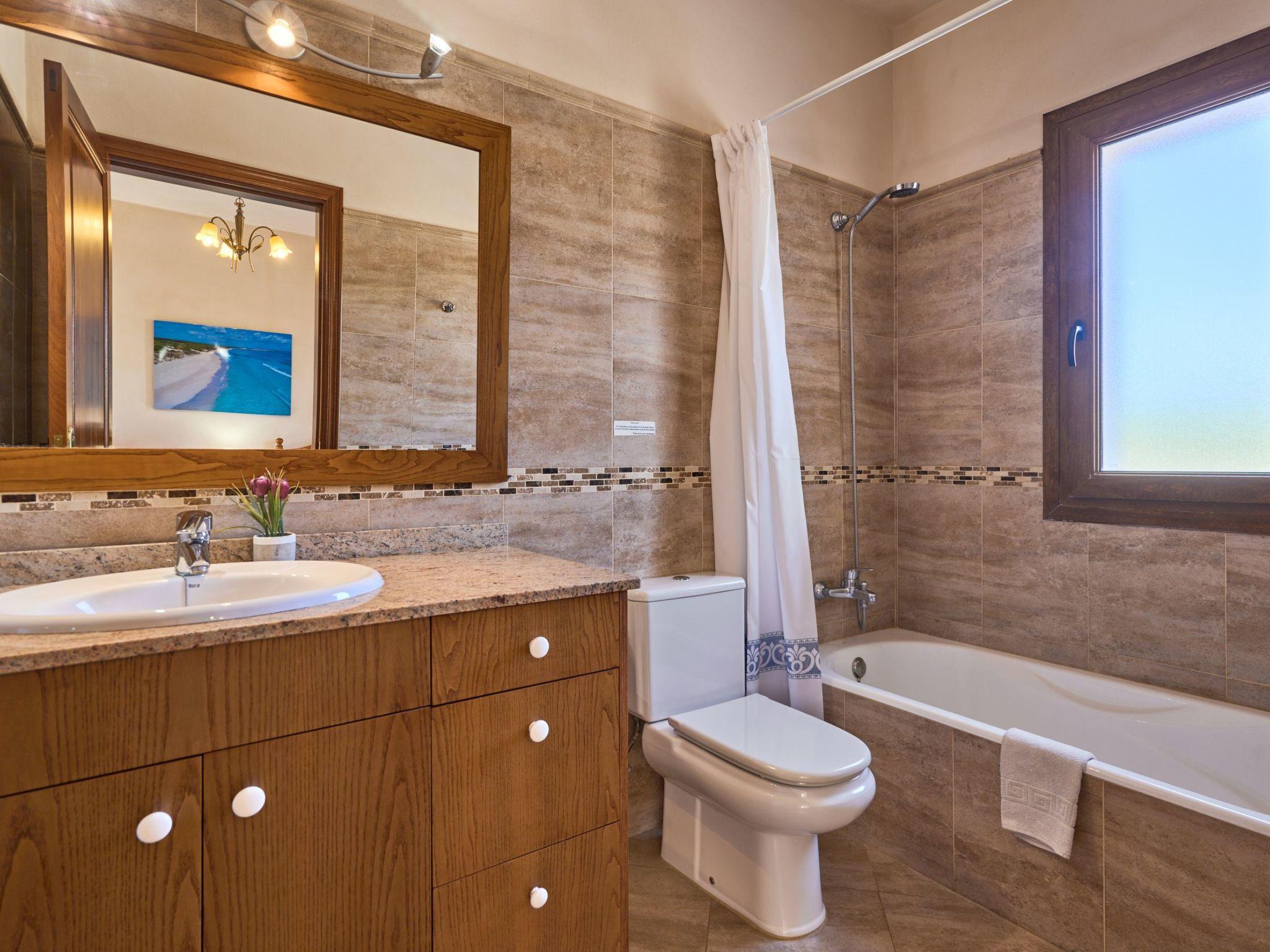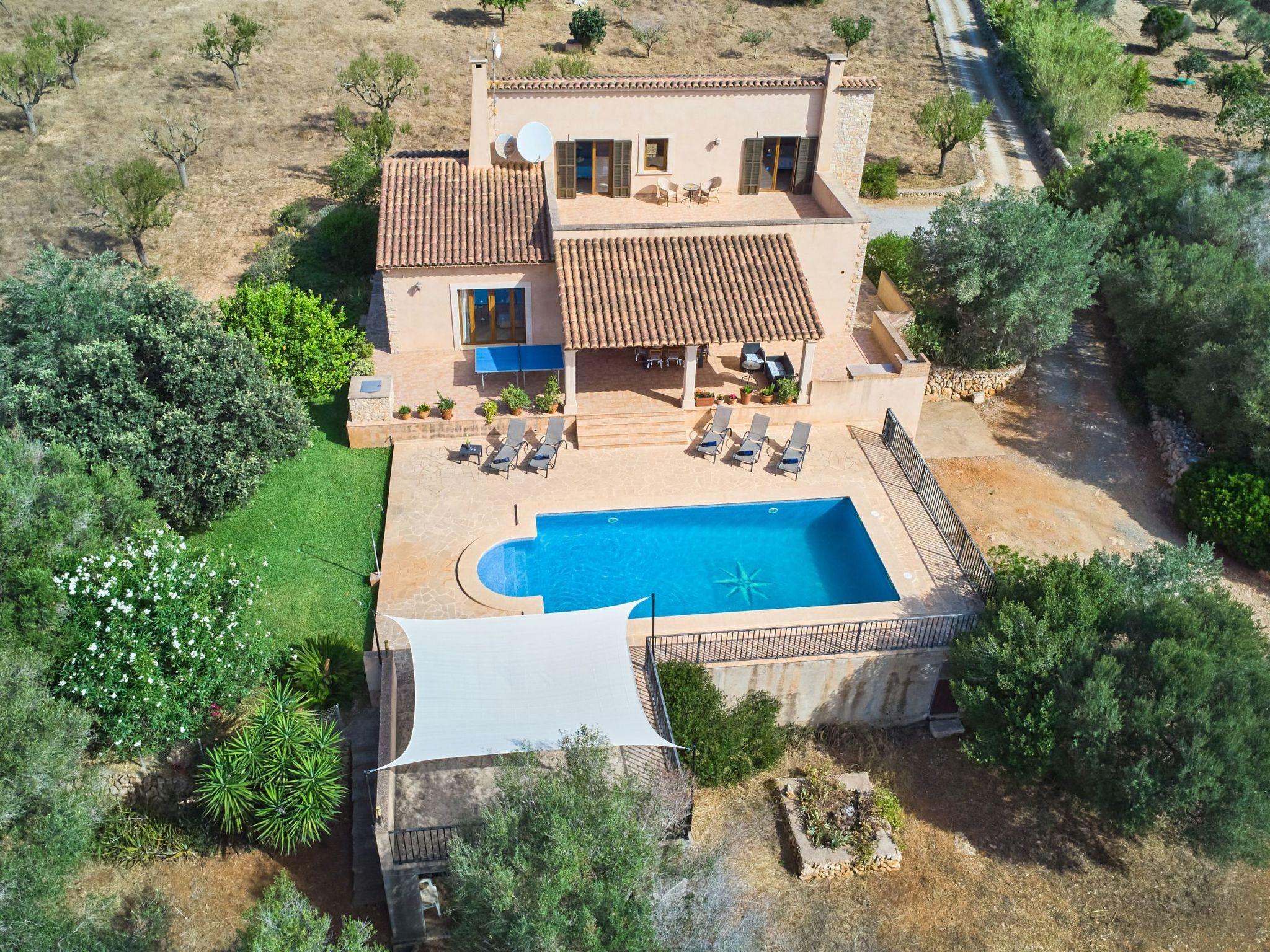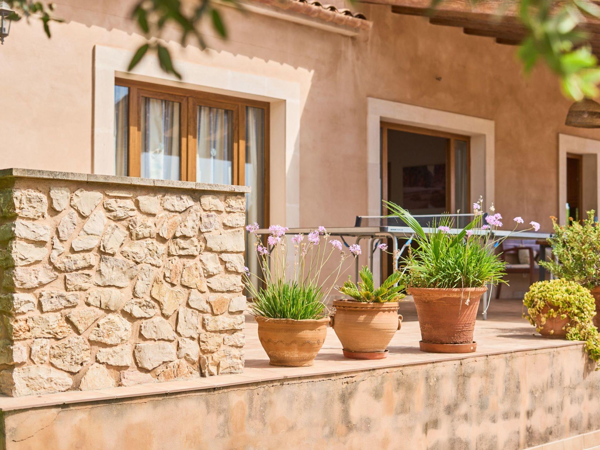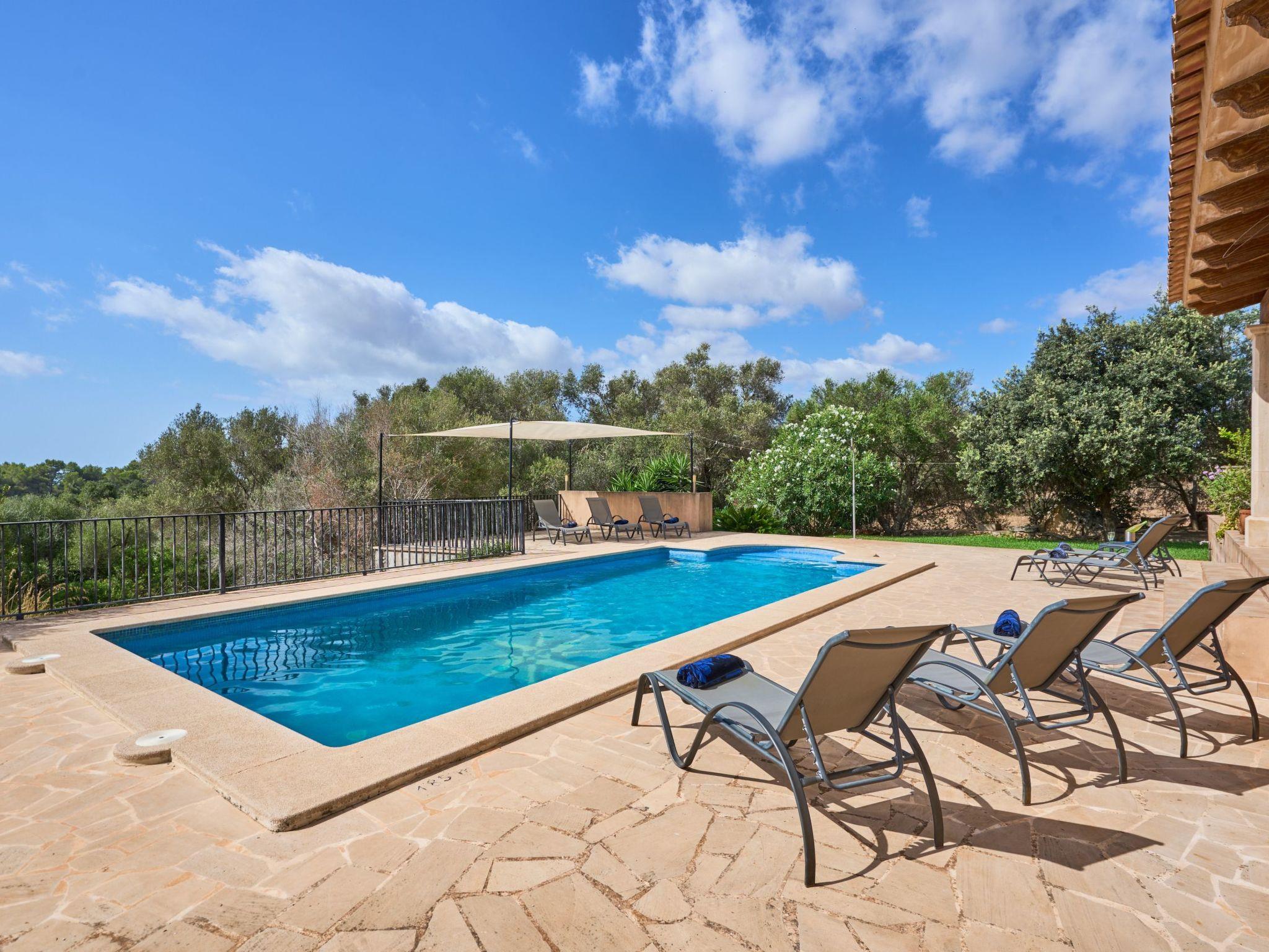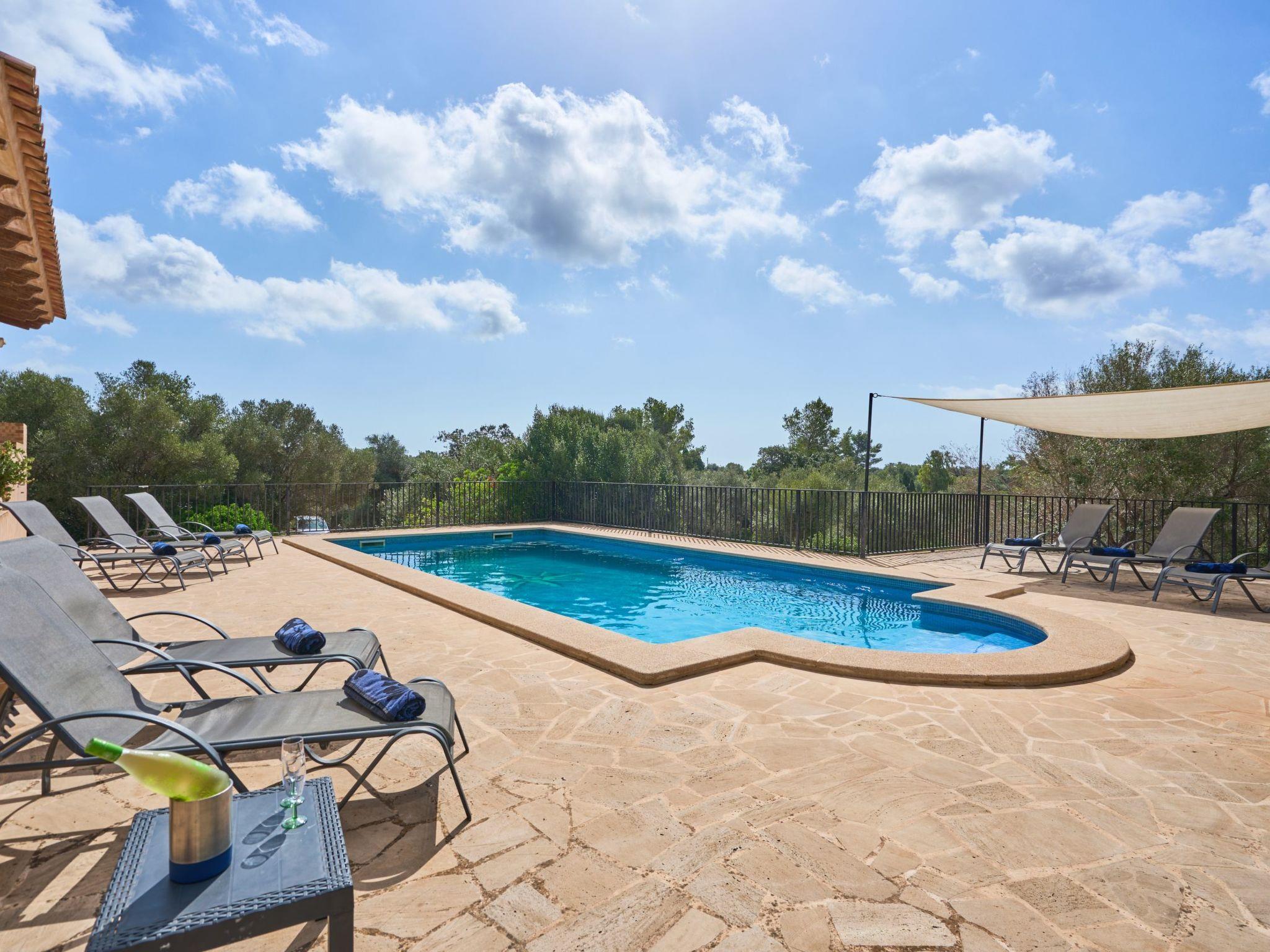 From the entrance area, we enter the bright open-plan living/dining area with access to the covered terrace and pool area. The kitchen is spacious and well equipped. There is a large dining table and access to the covered terrace. There are two bedrooms on the ground floor. One of them has two single beds and an ensuite bathroom, the other has a double bed and an adjoining shower room. On the upper floor there are two further bedrooms, both with access to the terrace and views of the pool and the surrounding area. One is furnished with two single beds and has an en-suite shower room, the other has a double bed and en-suite bathroom.