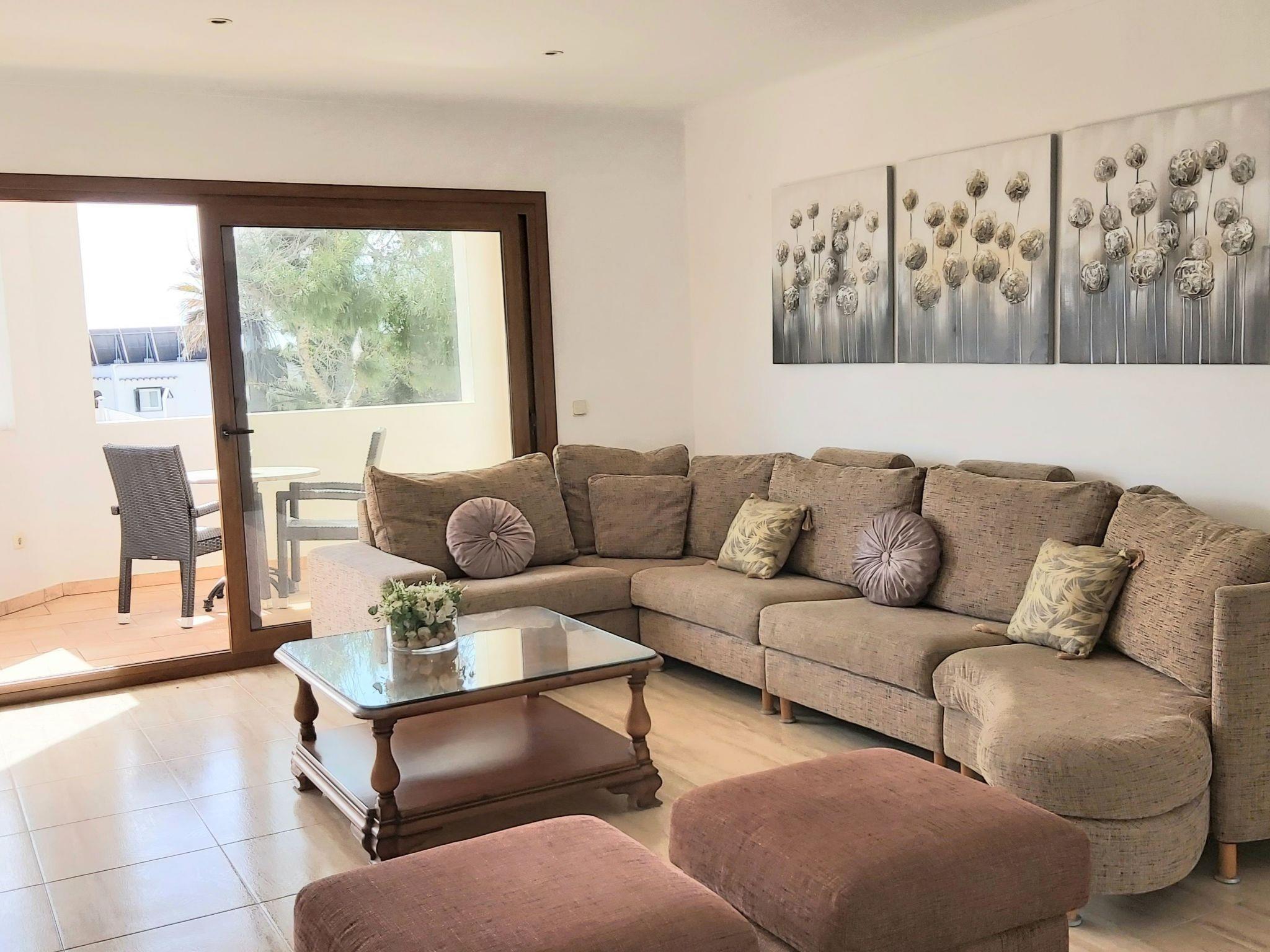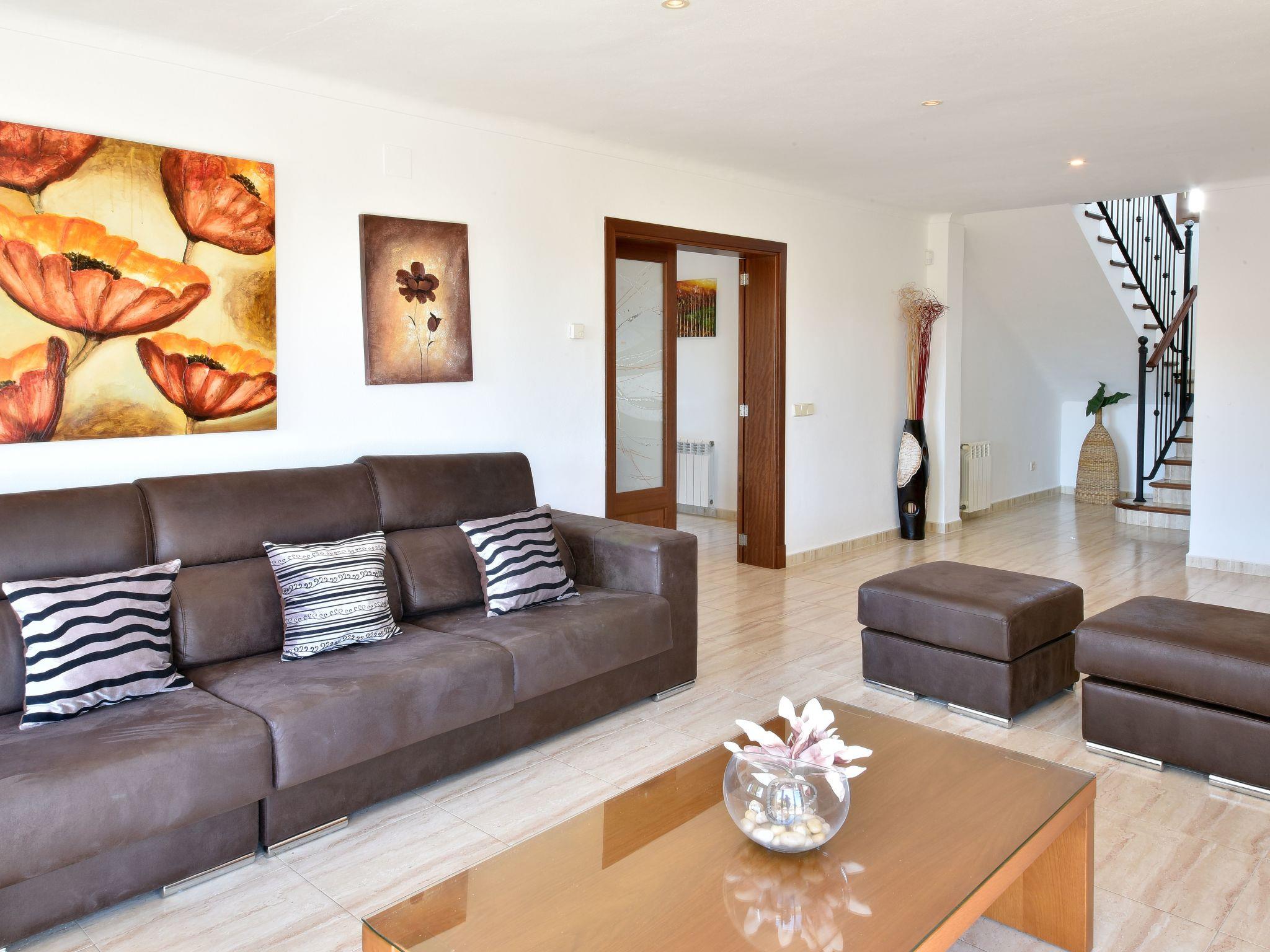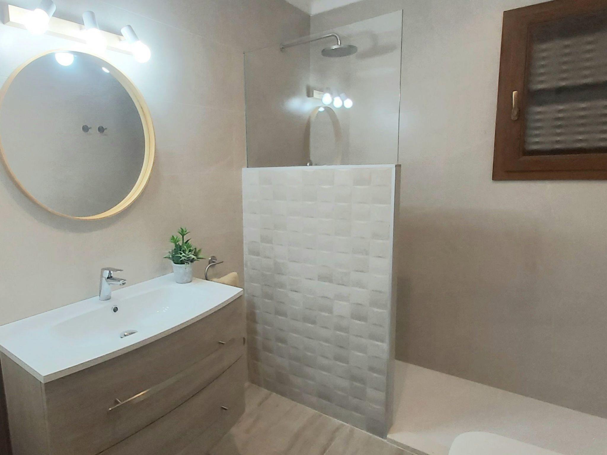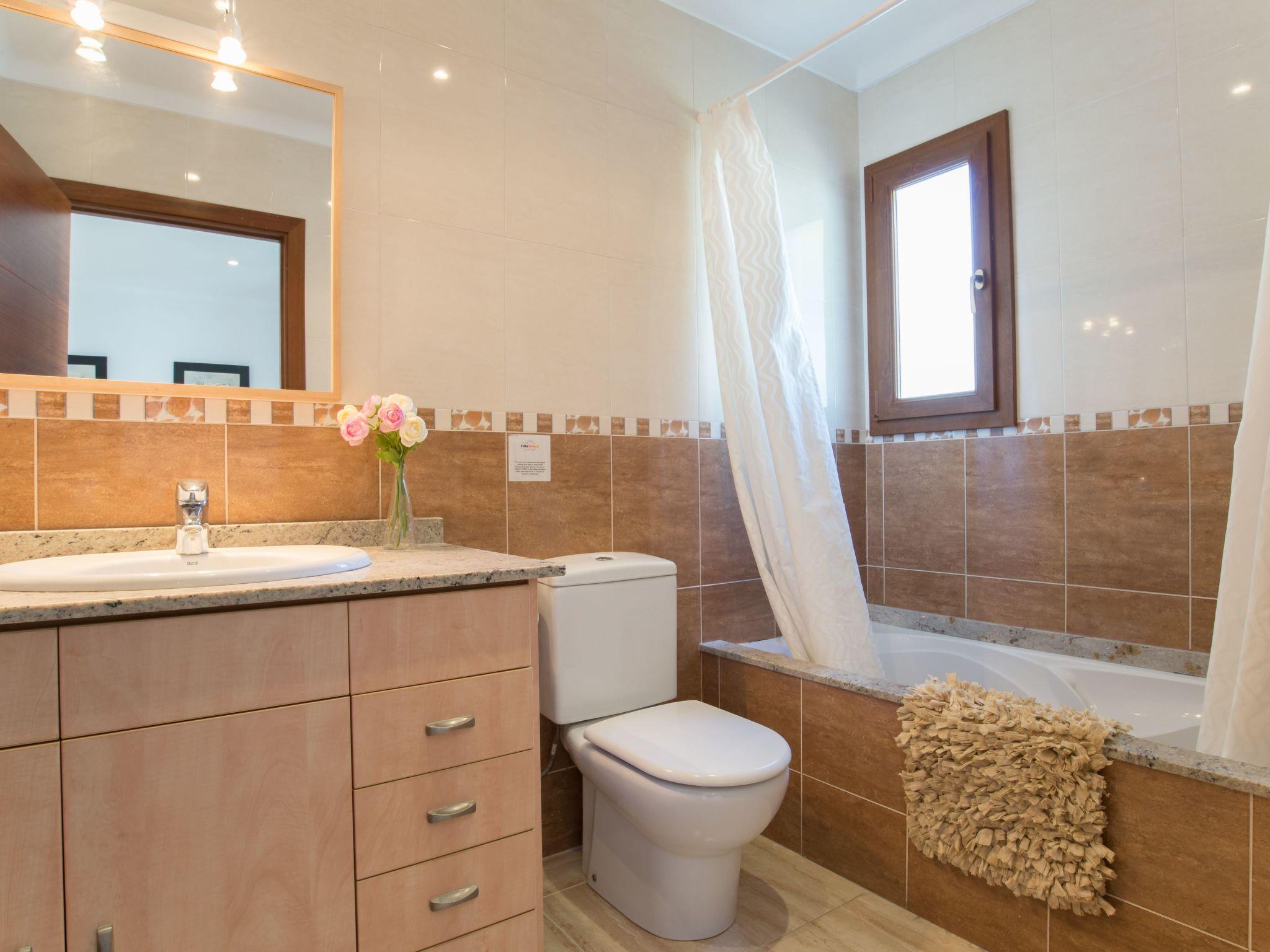 The villa offers a living room and dining room on the ground floor, each with a door to the pool terrace. From the dining room there is access to the spacious kitchen. There are also 2 bedrooms, one with a double bed and the other with two single beds. Both have an en-suite bathroom. On the upper floor there is a second living room with access to a small terrace and 3 bedrooms each with en-suite bathroom. Two bedrooms are equipped with 2 single beds and one with a double bed, the bedrooms have air conditioning with sensors, they only work when the doors and windows are completely closed, air conditioning with fixed and limited hours of use.