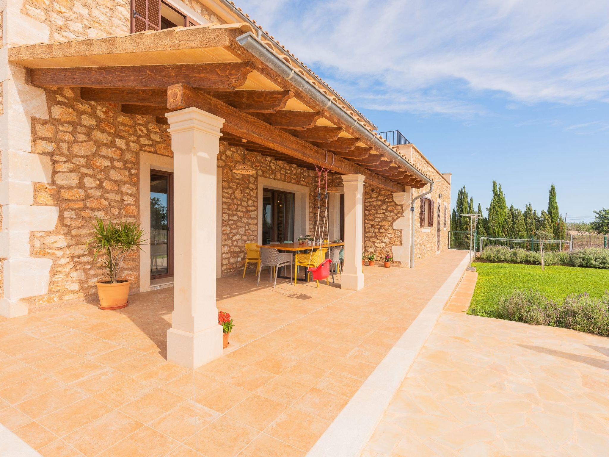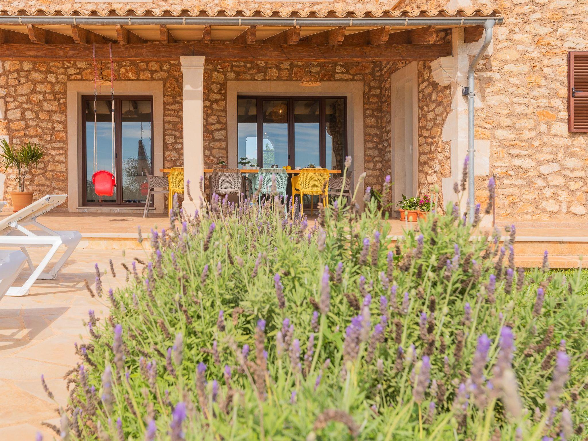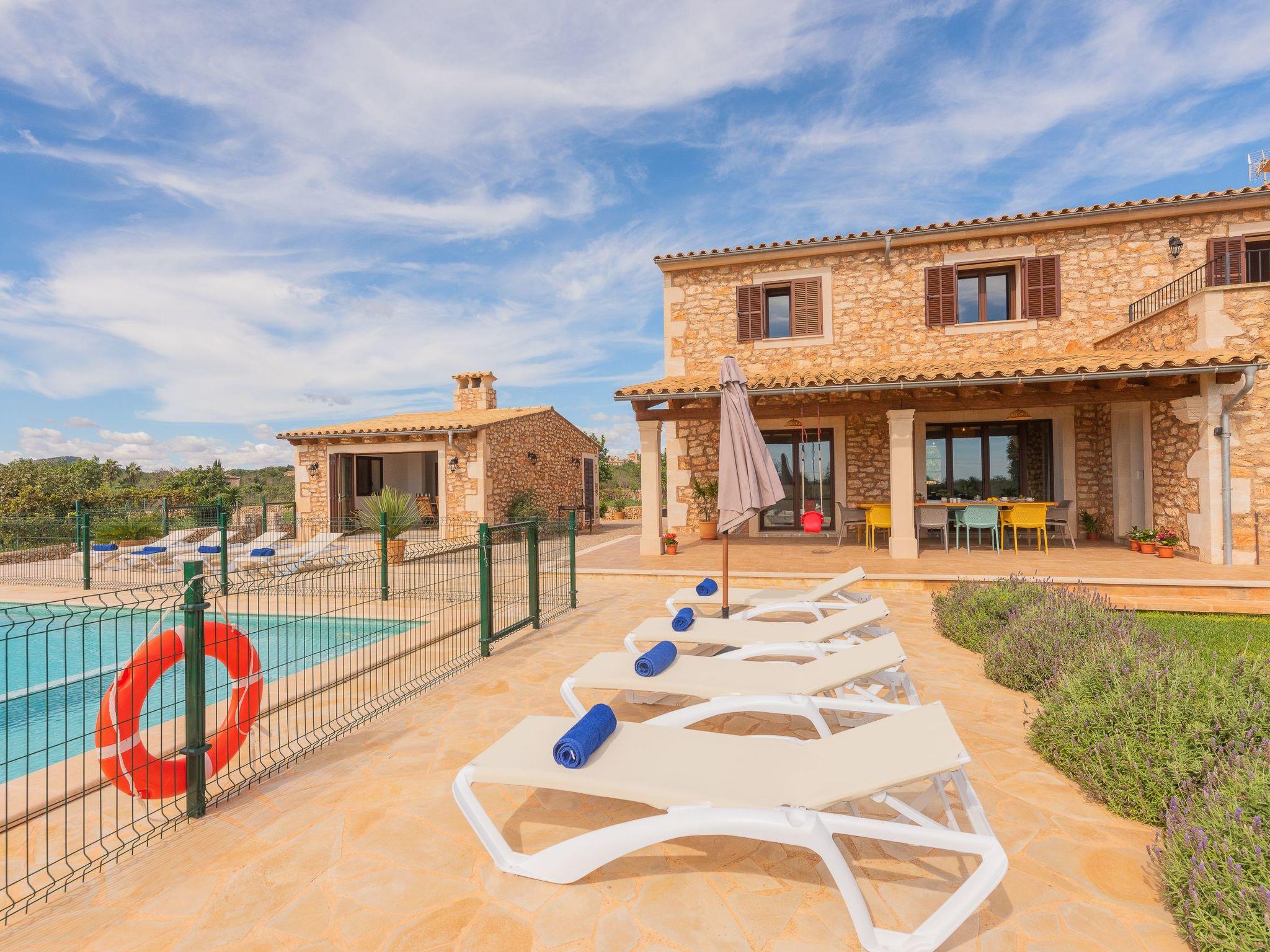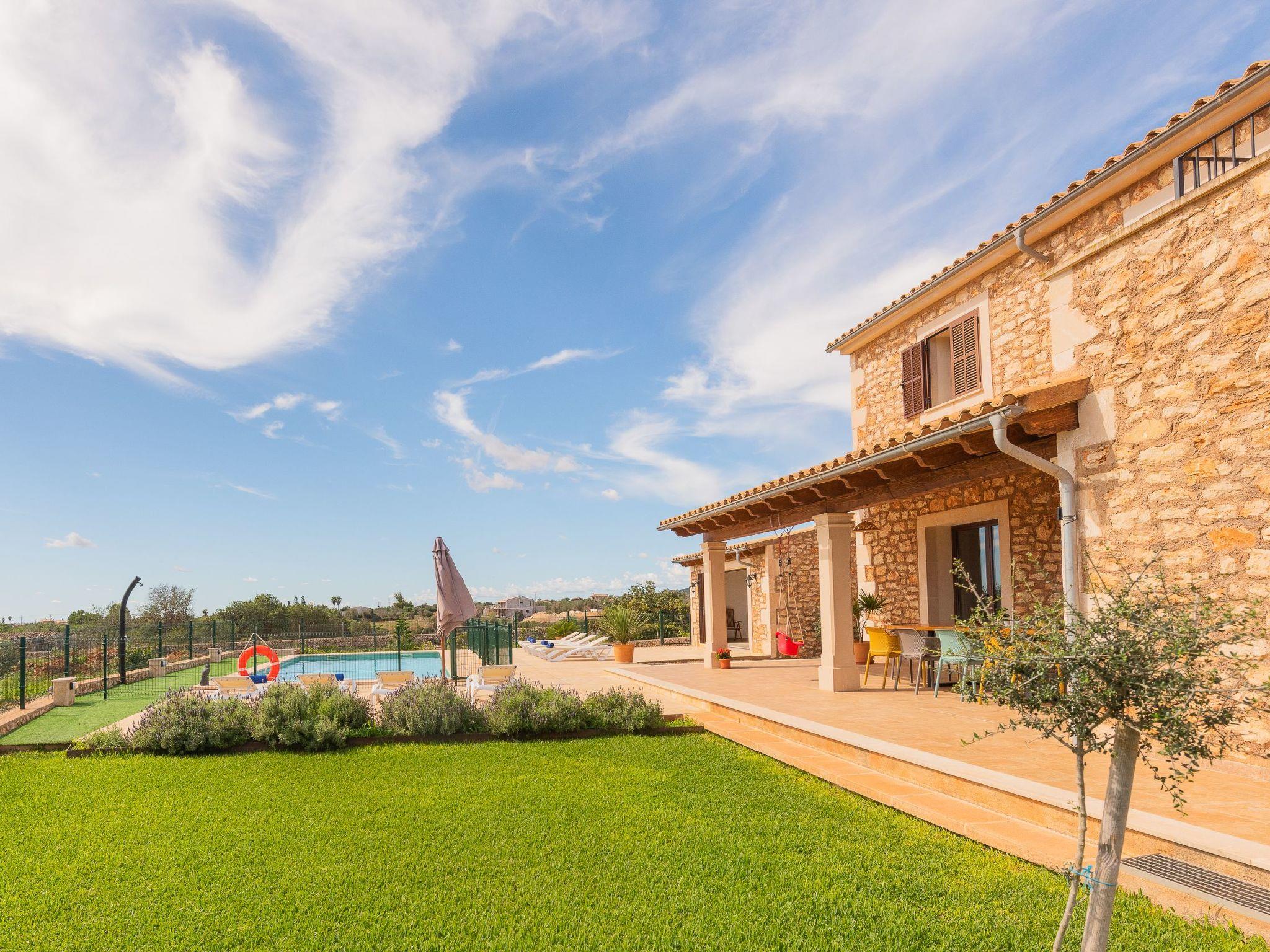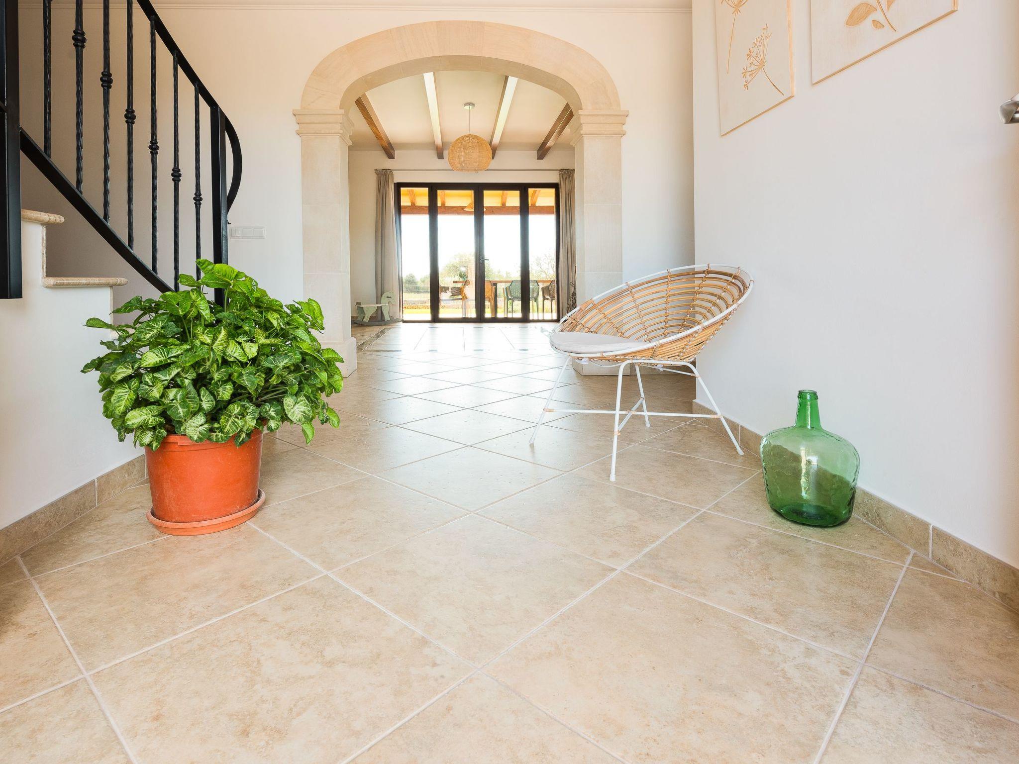 Dreamlike noble finca on two floors. On the ground floor is the living room and the open-plan kitchen with dining area. The furnishings are chic but not overloaded. There is also a bedroom with double bed and en suite shower room on the ground floor. There is also a utility room and a guest toilet. 4 further bedrooms are located on the first floor. There are two bedrooms with double beds and two bedrooms with two single beds each. These rooms share 2 bathrooms, one with separate bath and shower, the other with shower. Large sun terrace with views of the rural surroundings. Very nice outdoor area. Large long veranda with dining table. Lawned garden, with pool safely fenced for small children and artificial grass area. The magnificent pool has Roman steps. There is also an outdoor shower, outdoor barbecue and garden shed with outdoor bathroom. Air conditioning hot / cold with limited and fixed usage times of 10 hours/day.