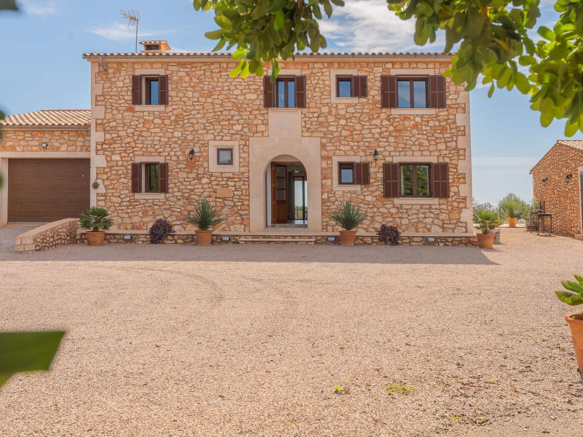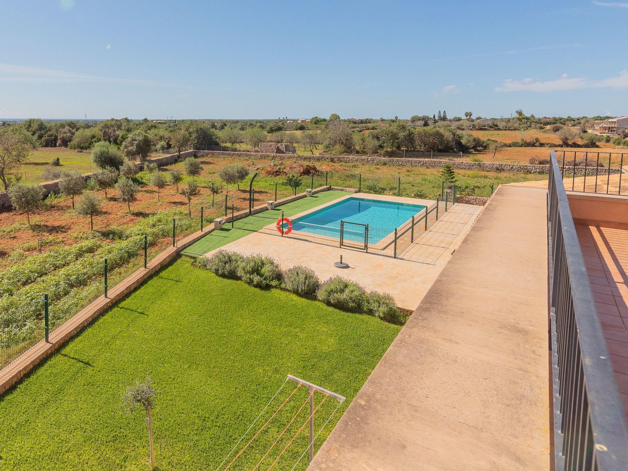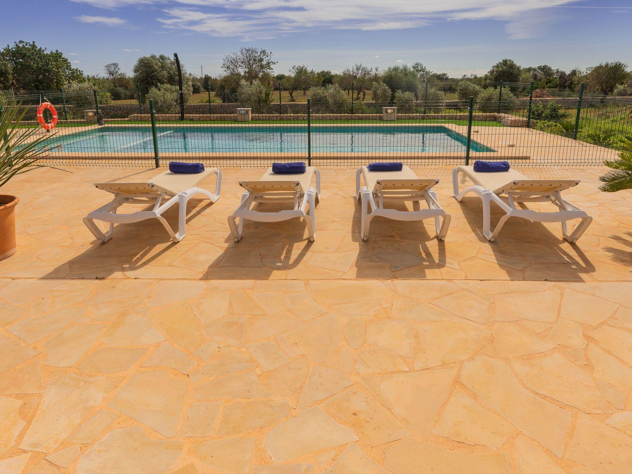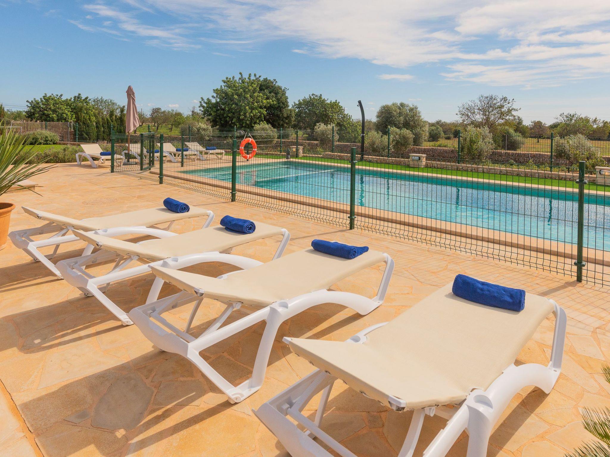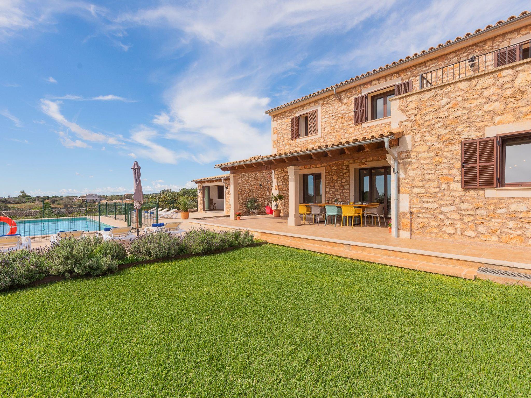 Dreamlike noble finca on two floors. On the ground floor is the living room and the open-plan kitchen with dining area. The furnishings are chic but not overloaded. There is also a bedroom with double bed and en suite shower room on the ground floor. There is also a utility room and a guest toilet. 4 further bedrooms are located on the first floor. There are two bedrooms with double beds and two bedrooms with two single beds each. These rooms share 2 bathrooms, one with separate bath and shower, the other with shower. Large sun terrace with views of the rural surroundings. Very nice outdoor area. Large long veranda with dining table. Lawned garden, with pool safely fenced for small children and artificial grass area. The magnificent pool has Roman steps. There is also an outdoor shower, outdoor barbecue and garden shed with outdoor bathroom. Air conditioning hot / cold with limited and fixed usage times of 10 hours/day.